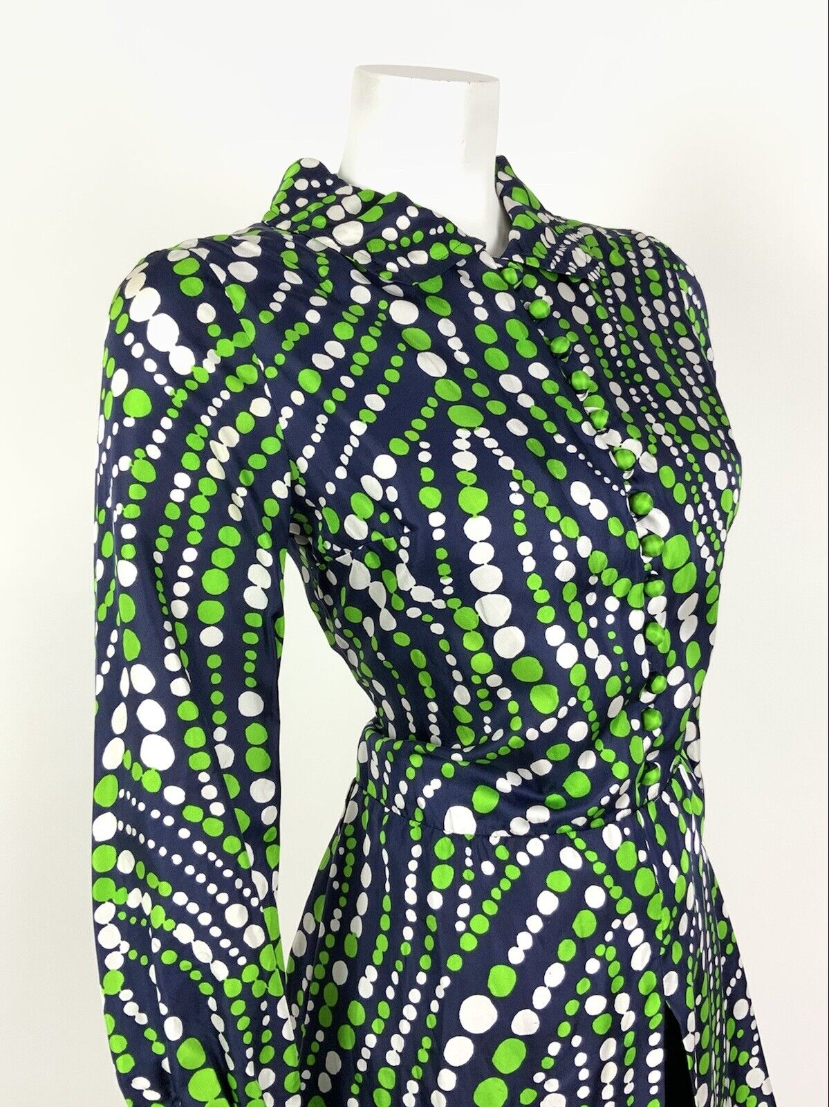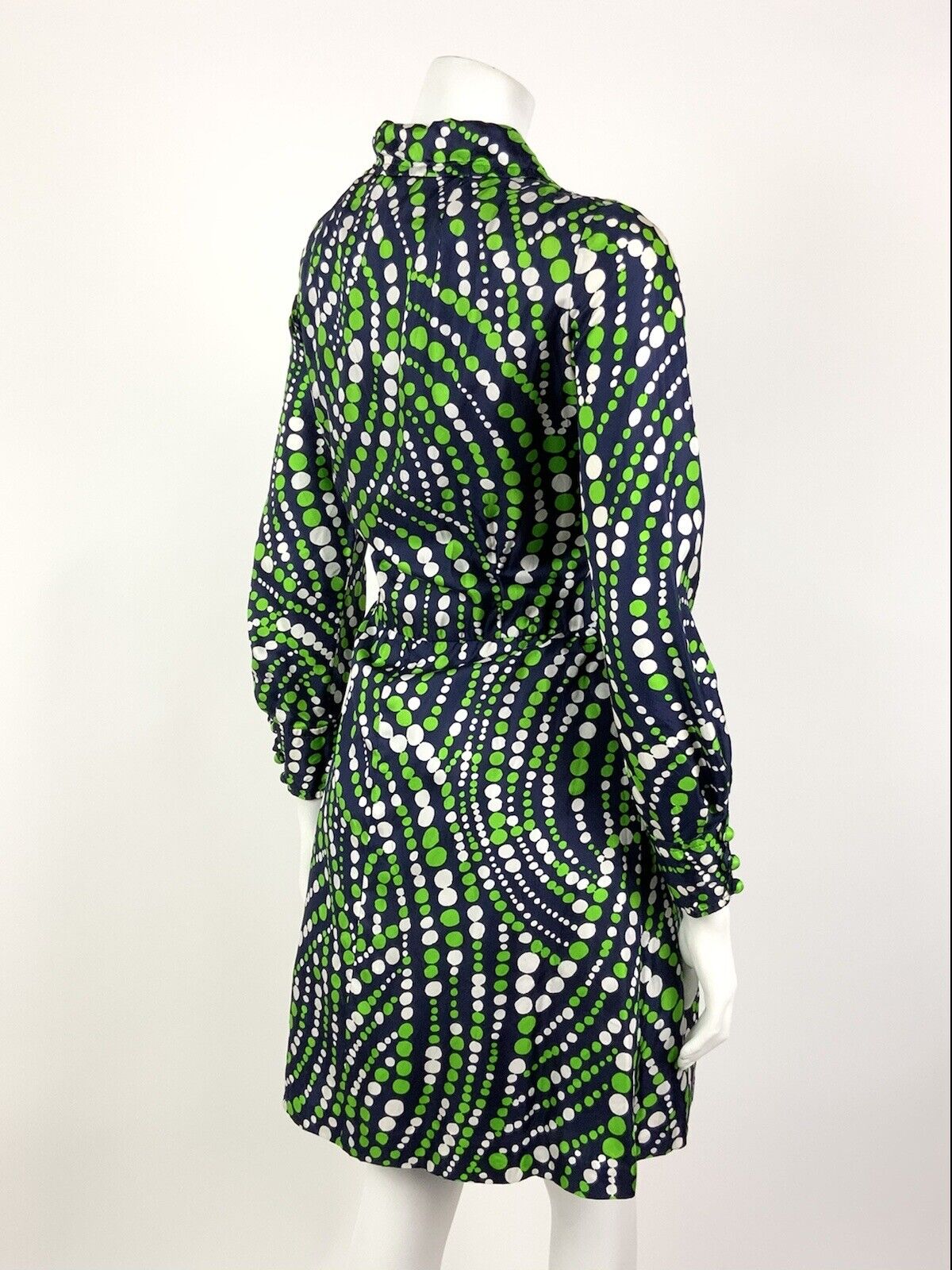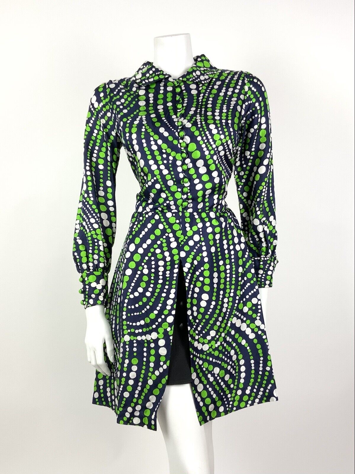 VINTAGE 60s 70s NAVY BLUE GREEN WHITE DOTTY WAVY MOD SPLIT SHIRT DRESS 10