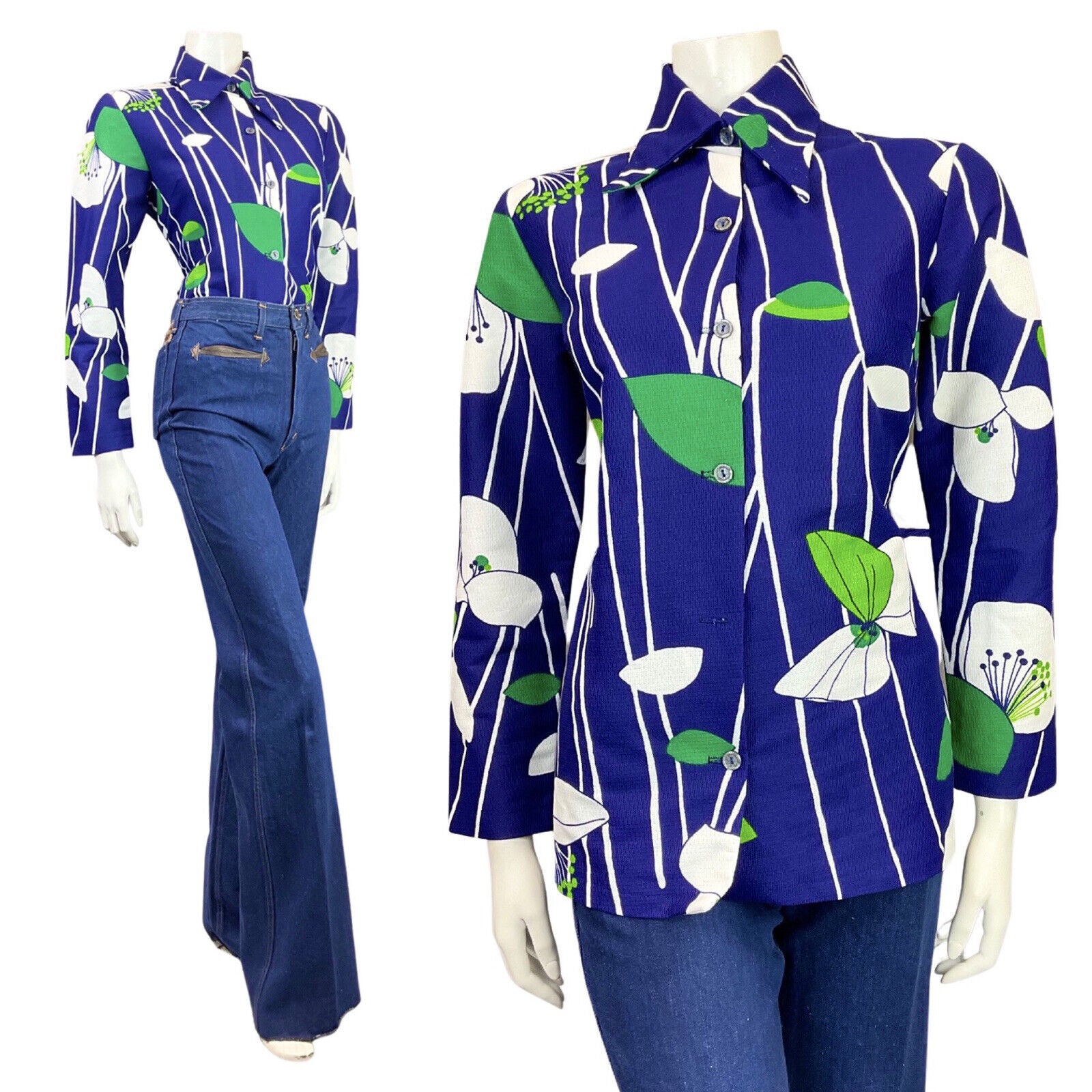 VINTAGE 60s 70s NAVY BLUE WHITE GREEN STRIPED LEAFY FLORAL DAGGER BLOUSE 14
