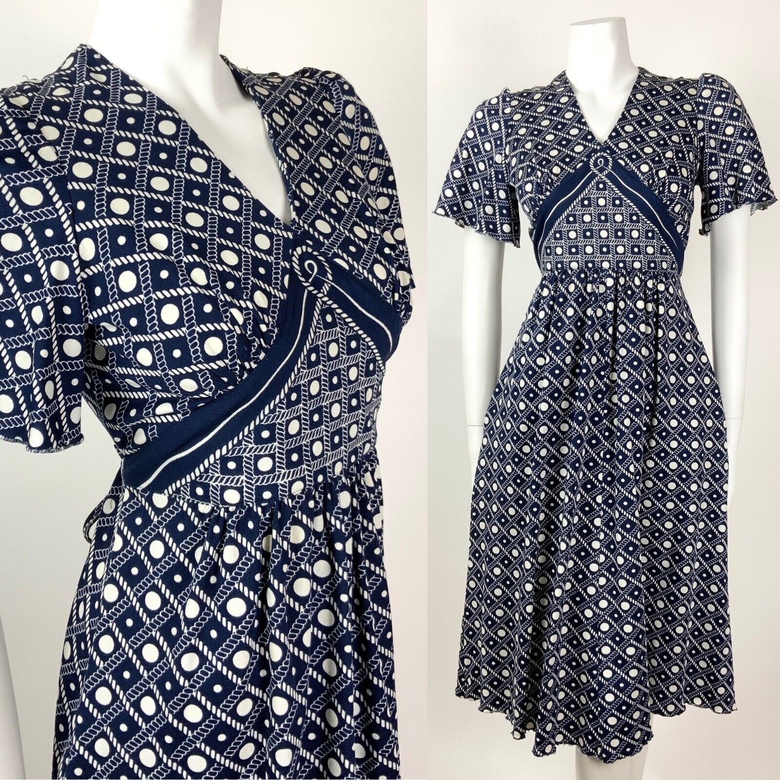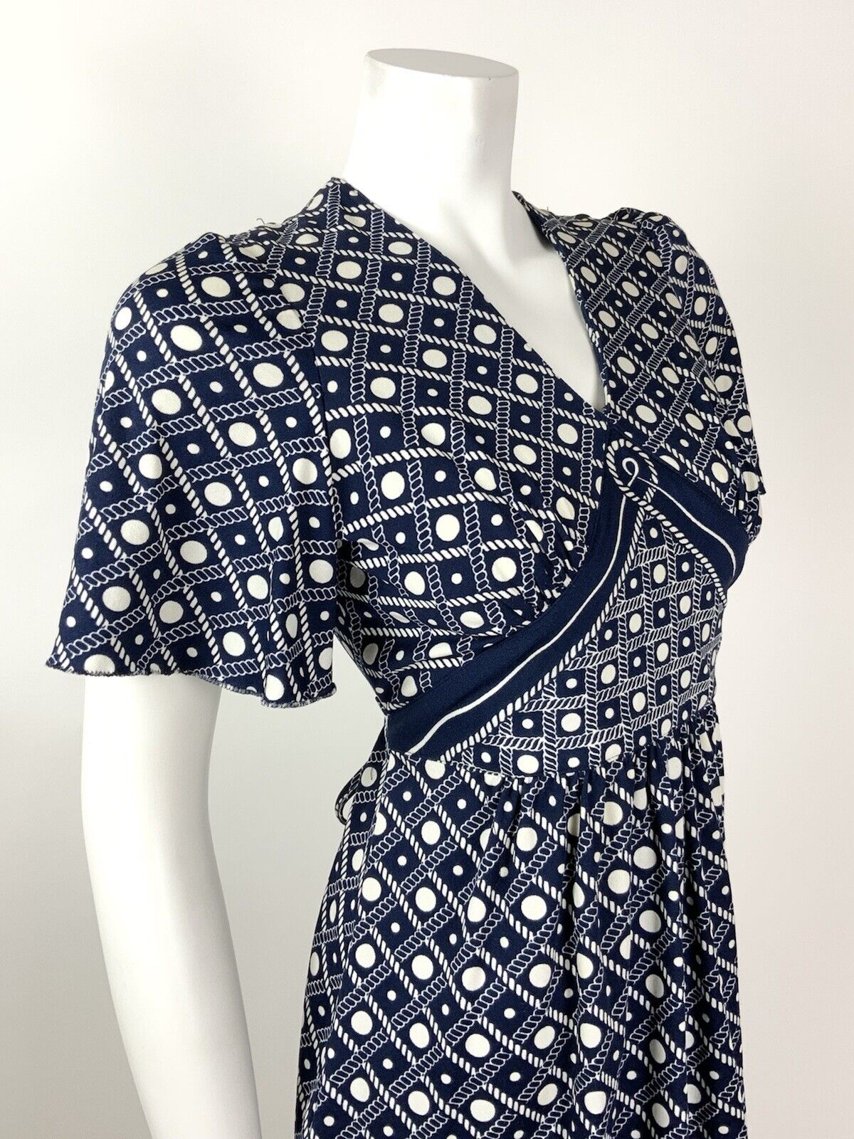VINTAGE 60s 70s NAVY BLUE WHITE GRID ROPE DOTTY NAUTICAL SWING DRESS 10 12