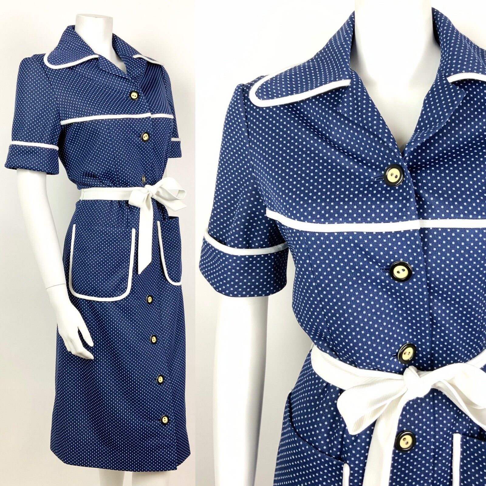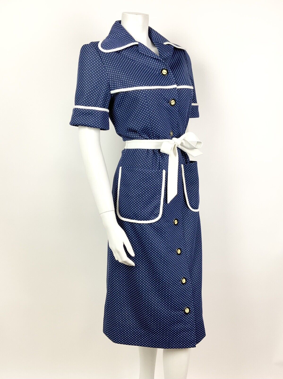 VINTAGE 60s 70s NAVY BLUE WHITE POLKA DOT BELTED WING COLLAR SHIRT DRESS 12 14