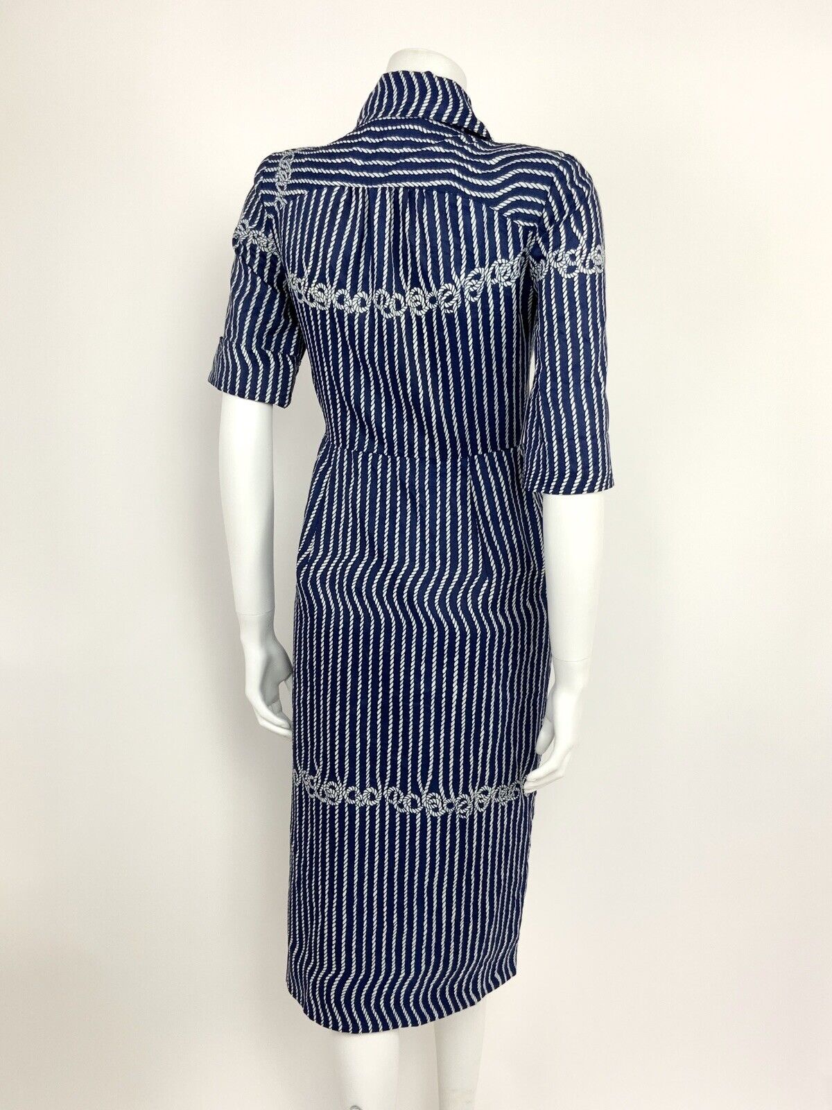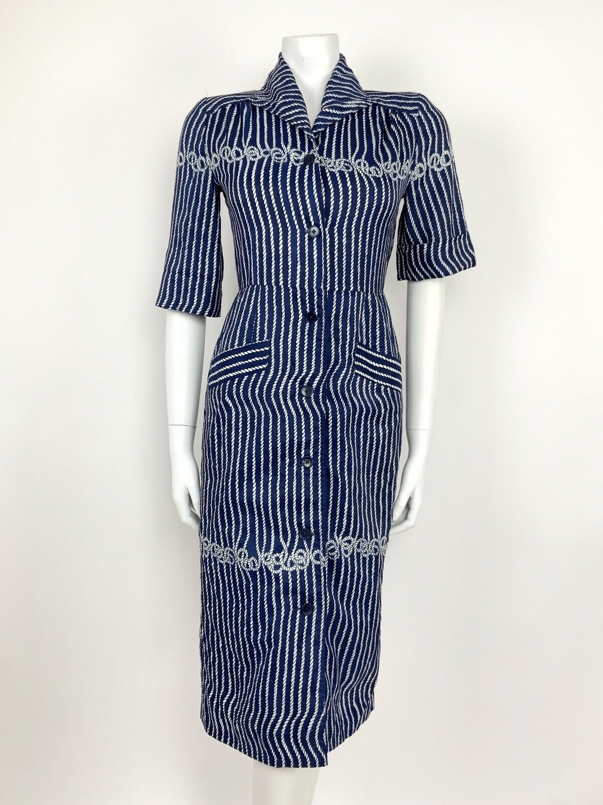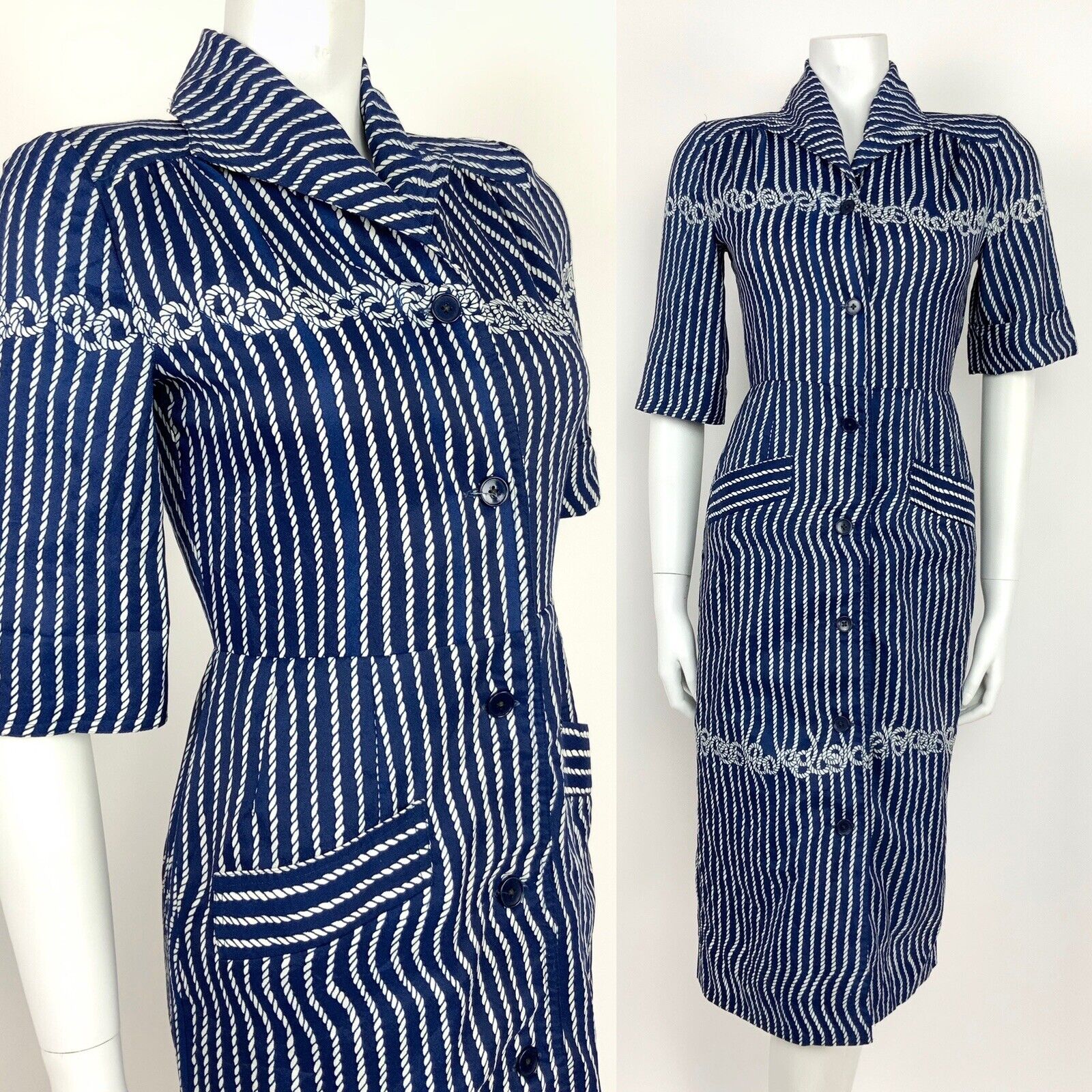 VINTAGE 60s 70s NAVY BLUE WHITE ROPE KNOT SHIRT WAIST DRESS 8 10