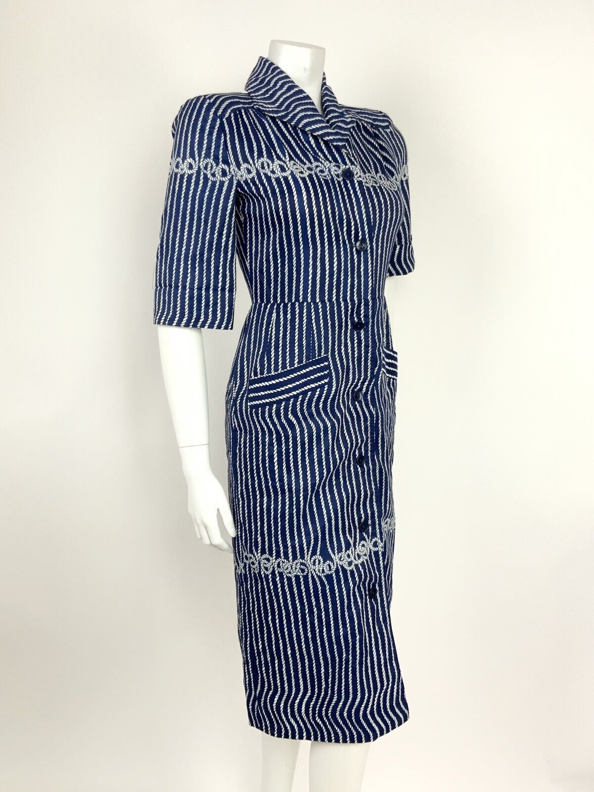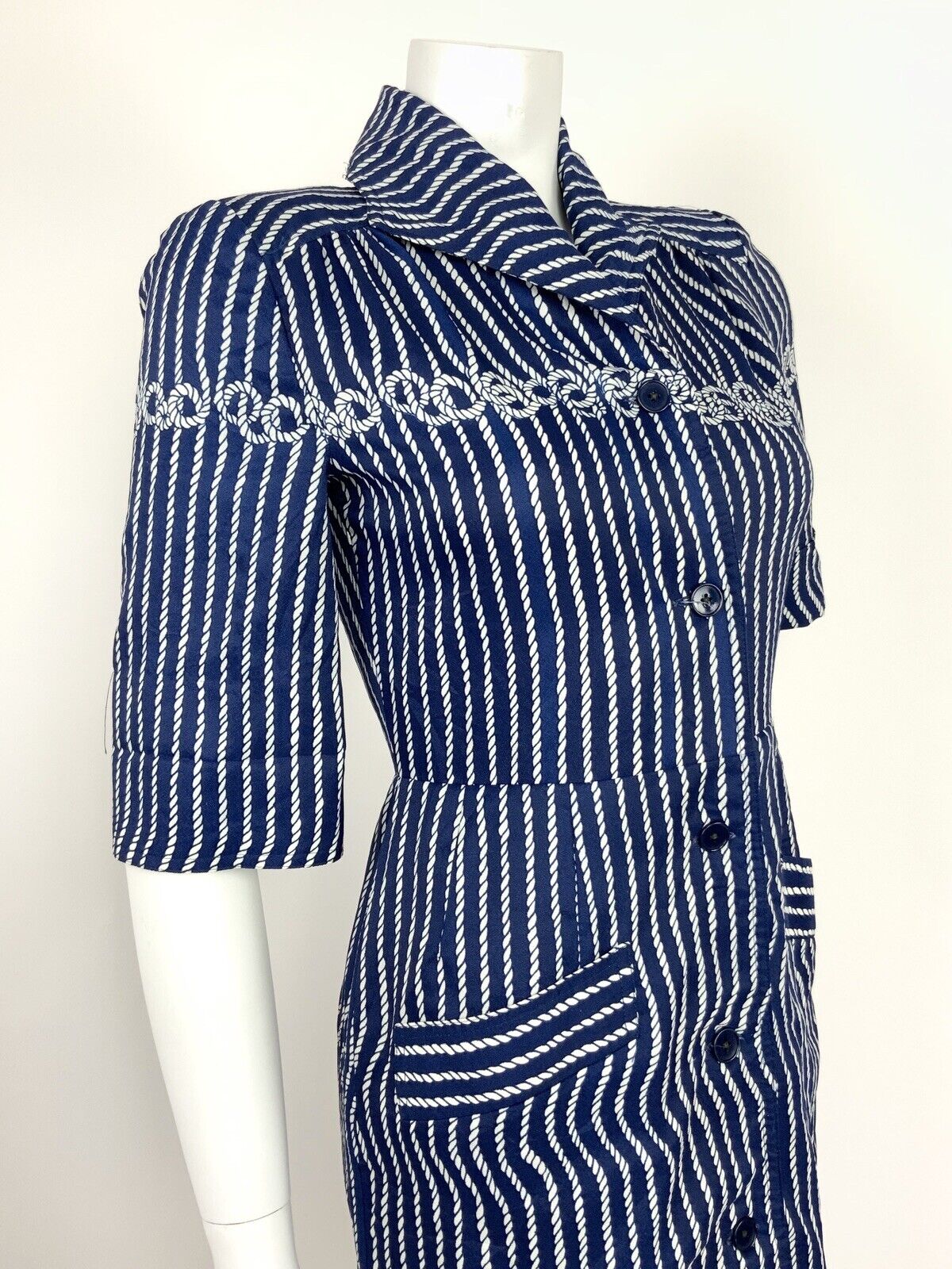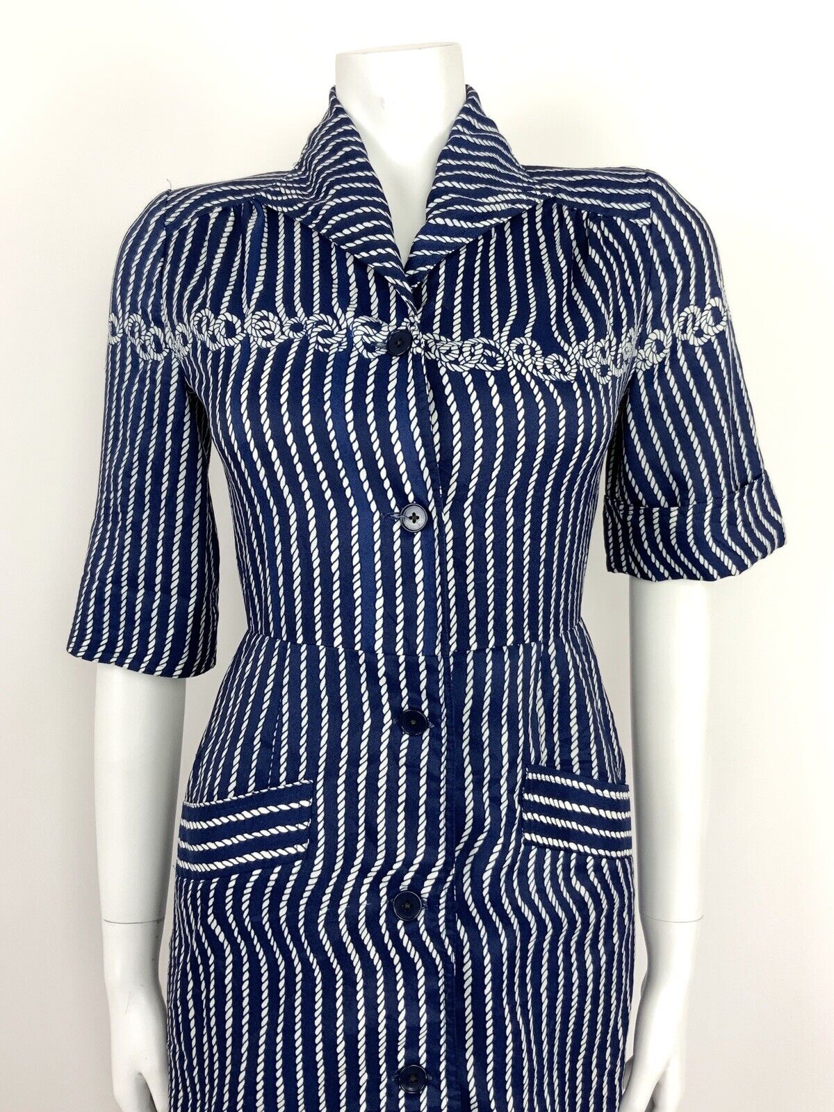 VINTAGE 60s 70s NAVY BLUE WHITE ROPE KNOT SHIRT WAIST DRESS 8 10