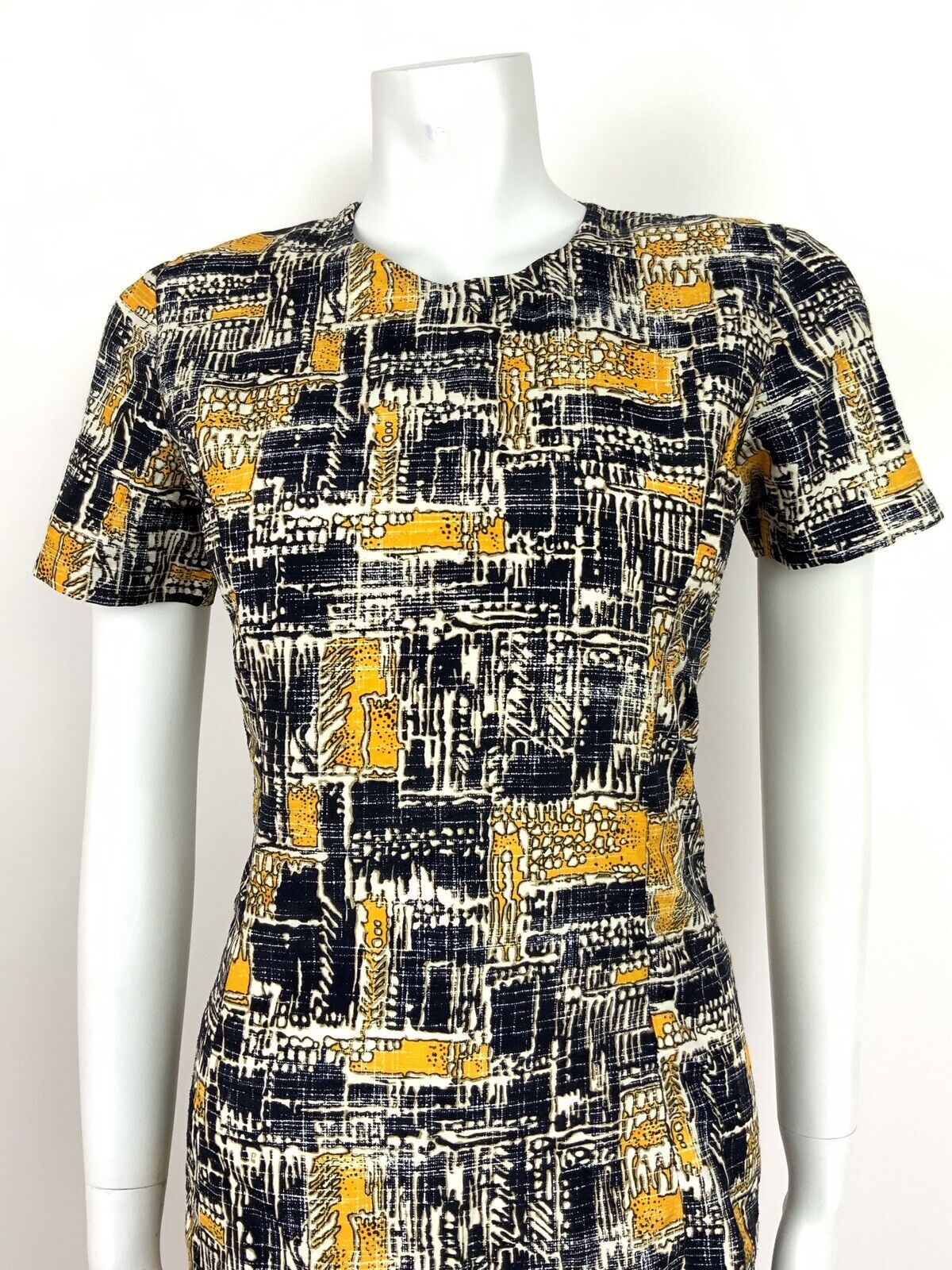 VINTAGE 60s 70s NAVY BLUE YELLOW WHITE GEOMETRIC ABSTRACT SUMMER SHIFT DRESS 8