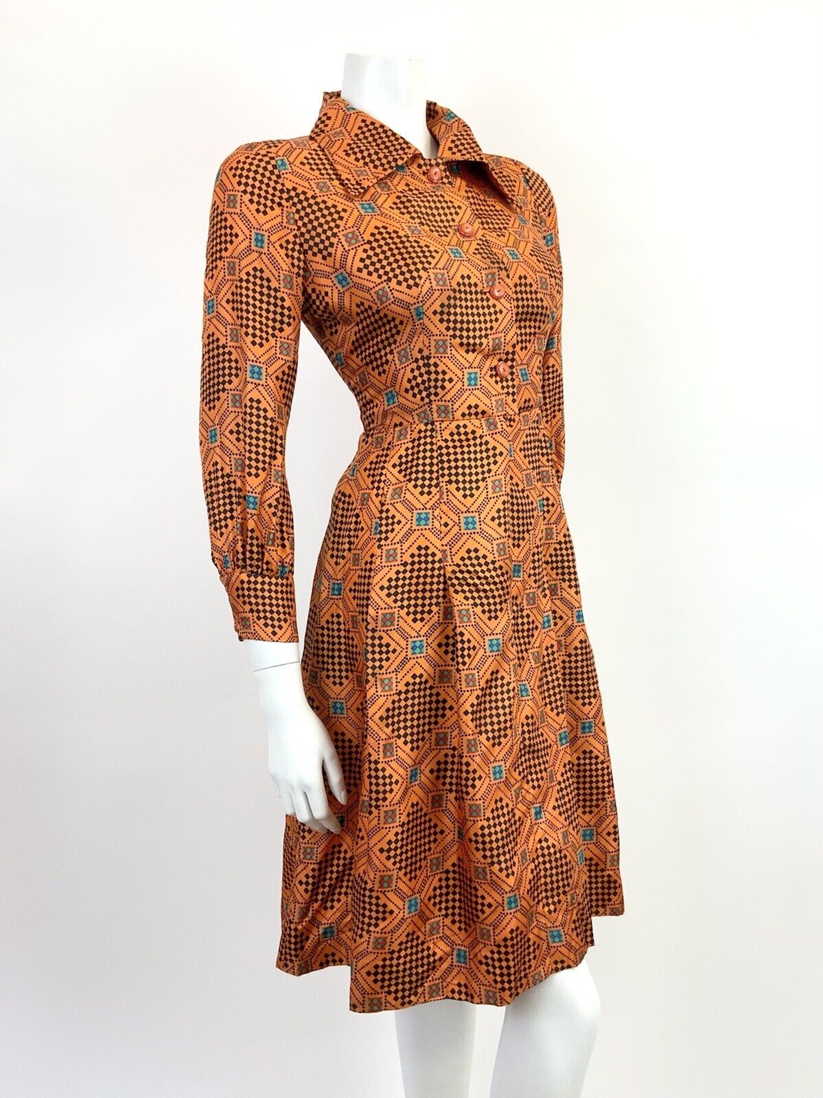VINTAGE 60s 70s ORANGE BLACK GREEN RED CHECKERBOARD GEOMETRIC DAGGER SHIRT 8 10