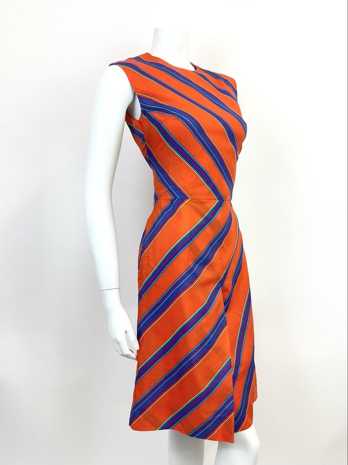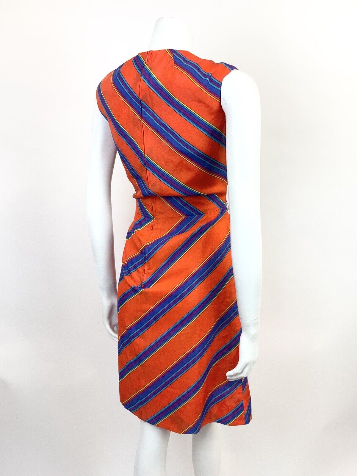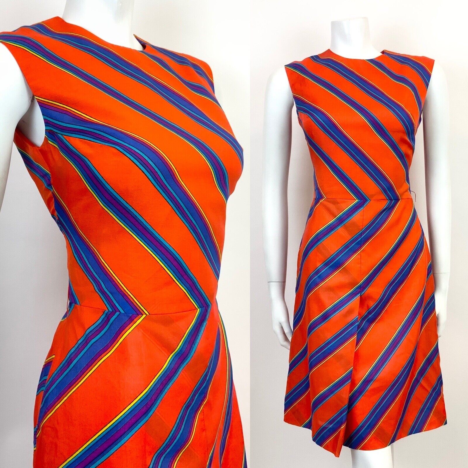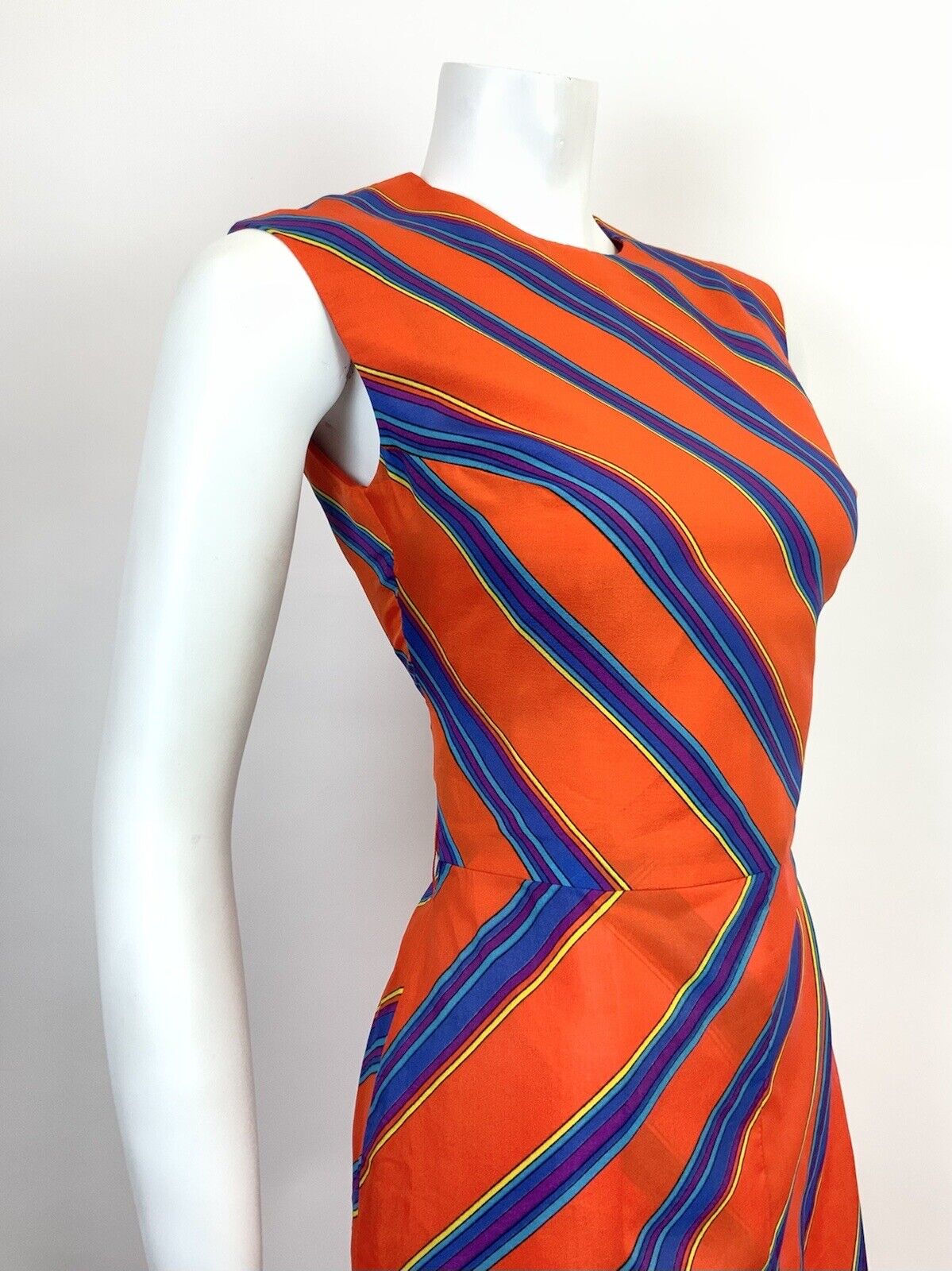 VINTAGE 60s 70s ORANGE BLUE PURPLE STRIPED GEOMETRIC SLEEVELESS MOD DRESS 10