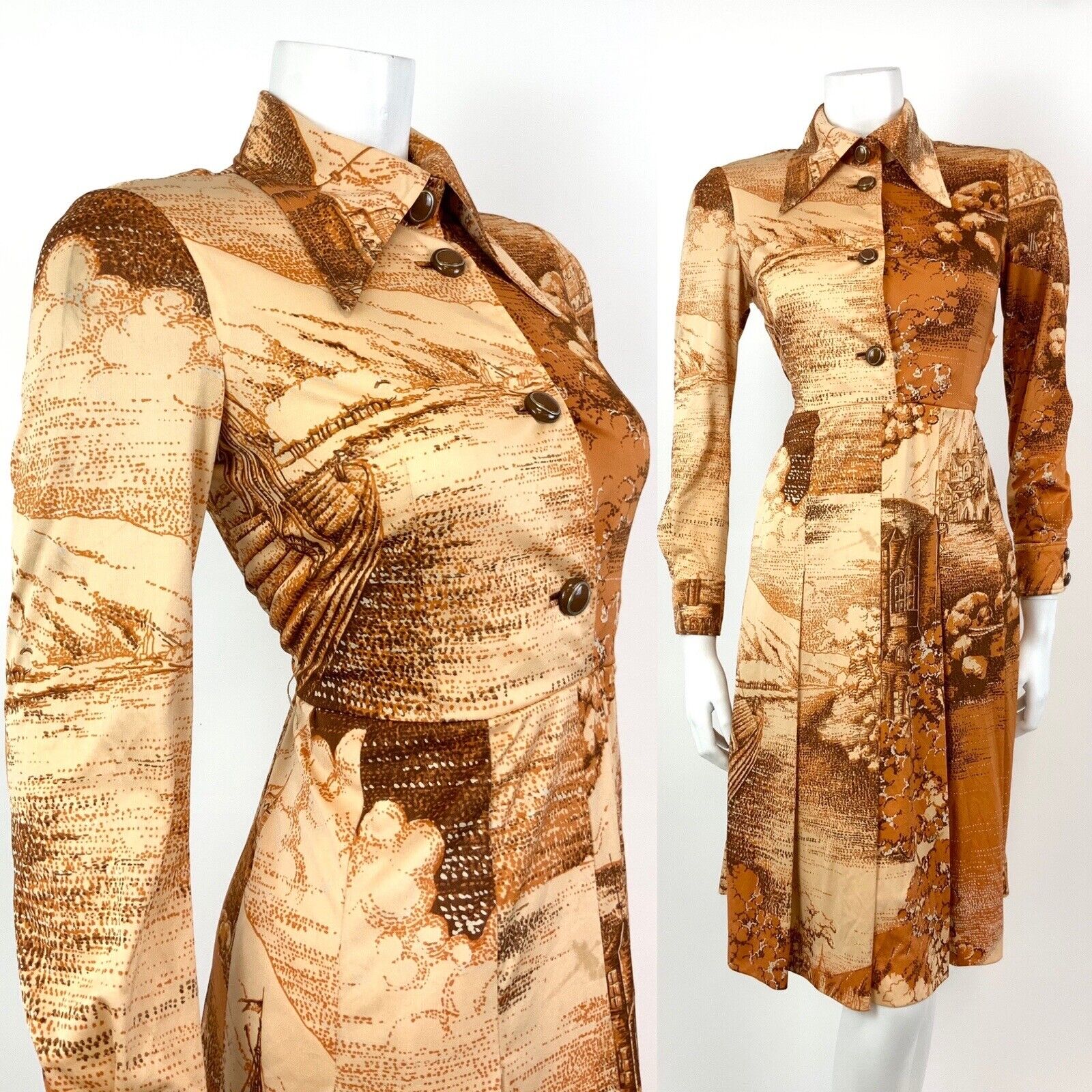 VINTAGE 60s 70s ORANGE BROWN CREAM PASTORAL FARM BOHO DAGGER SHIRT DRESS 8 10