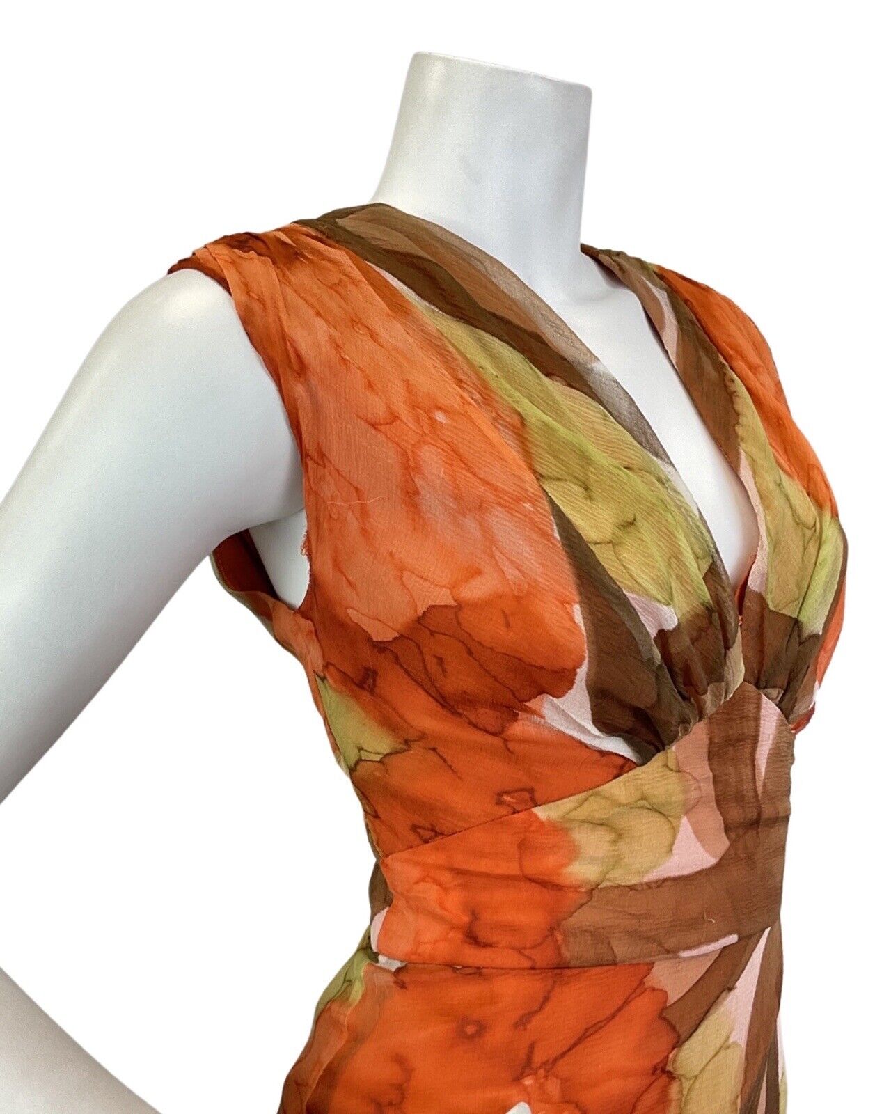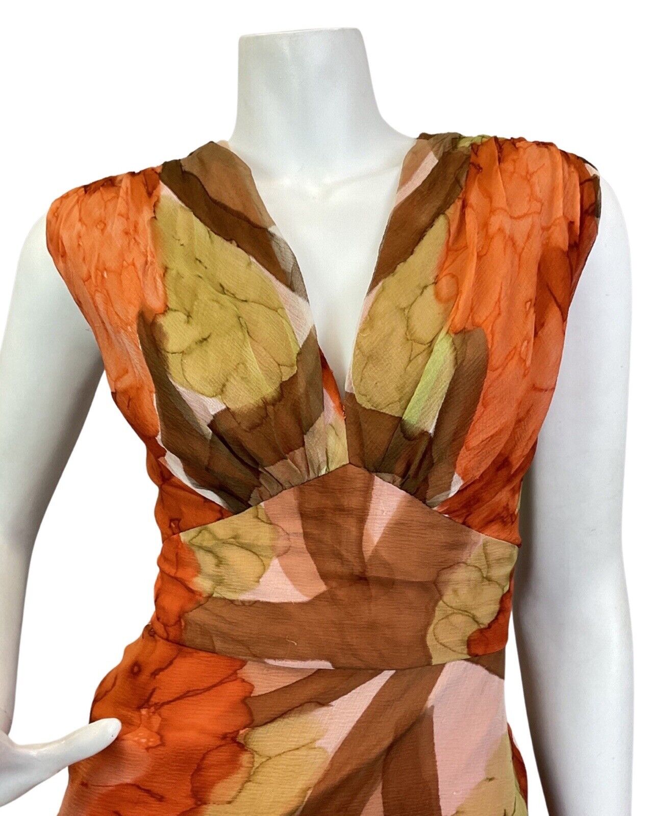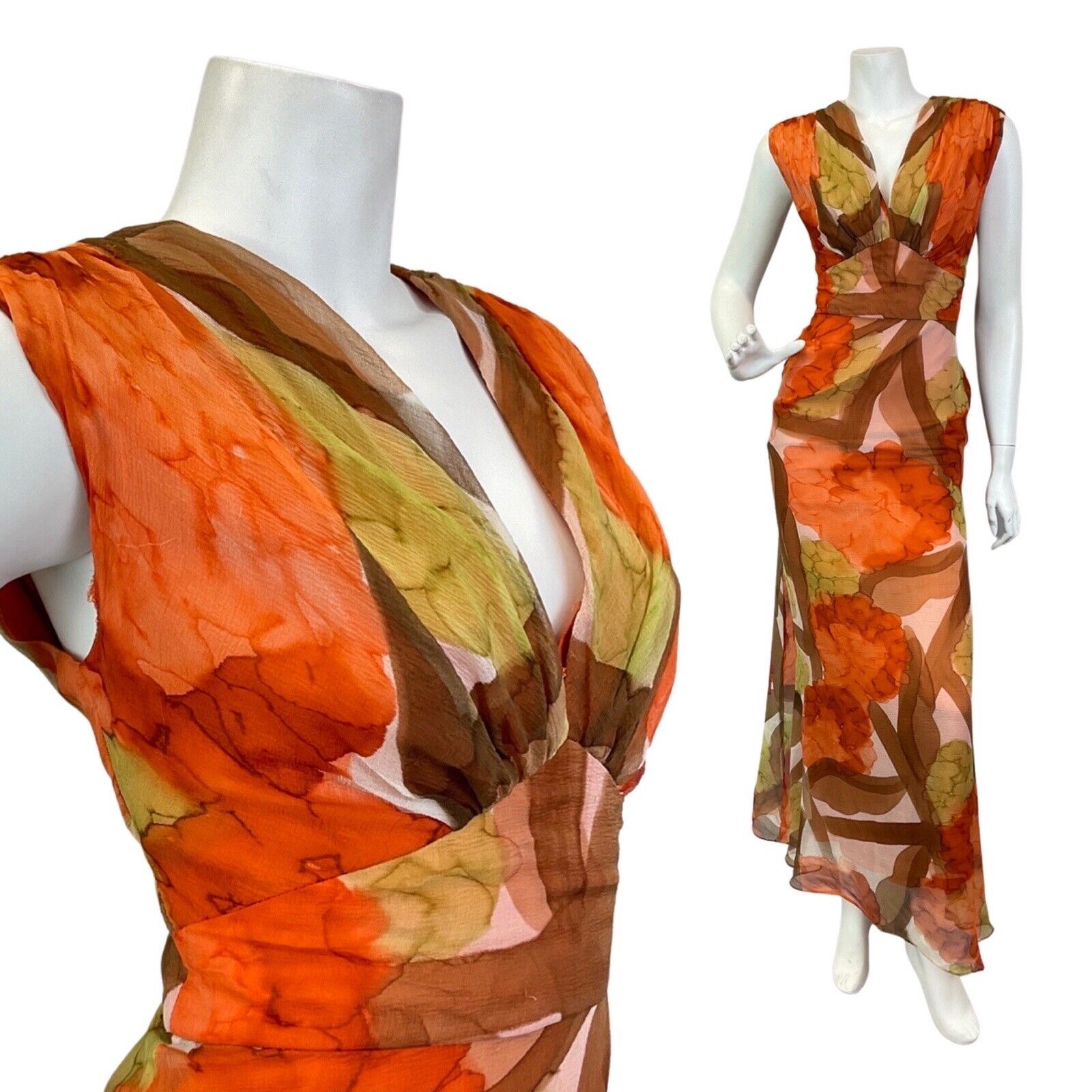 VINTAGE 60s 70s ORANGE BROWN GREEN PSYCHEDELIC ABSTRACT SUMMER MAXI DRESS 10