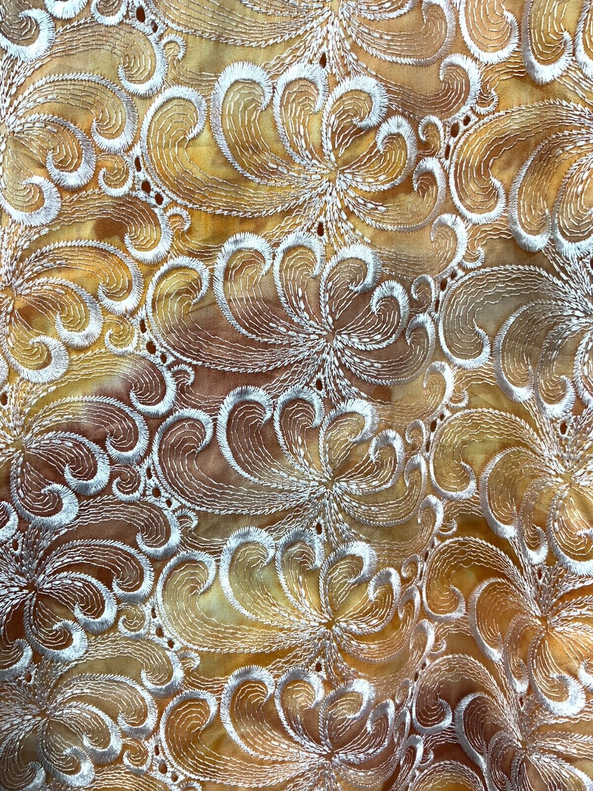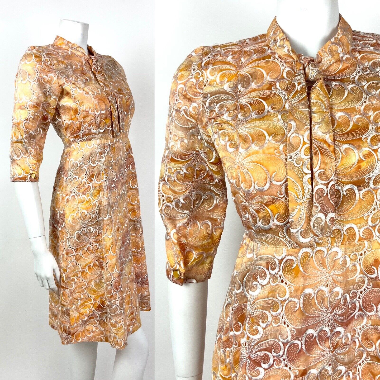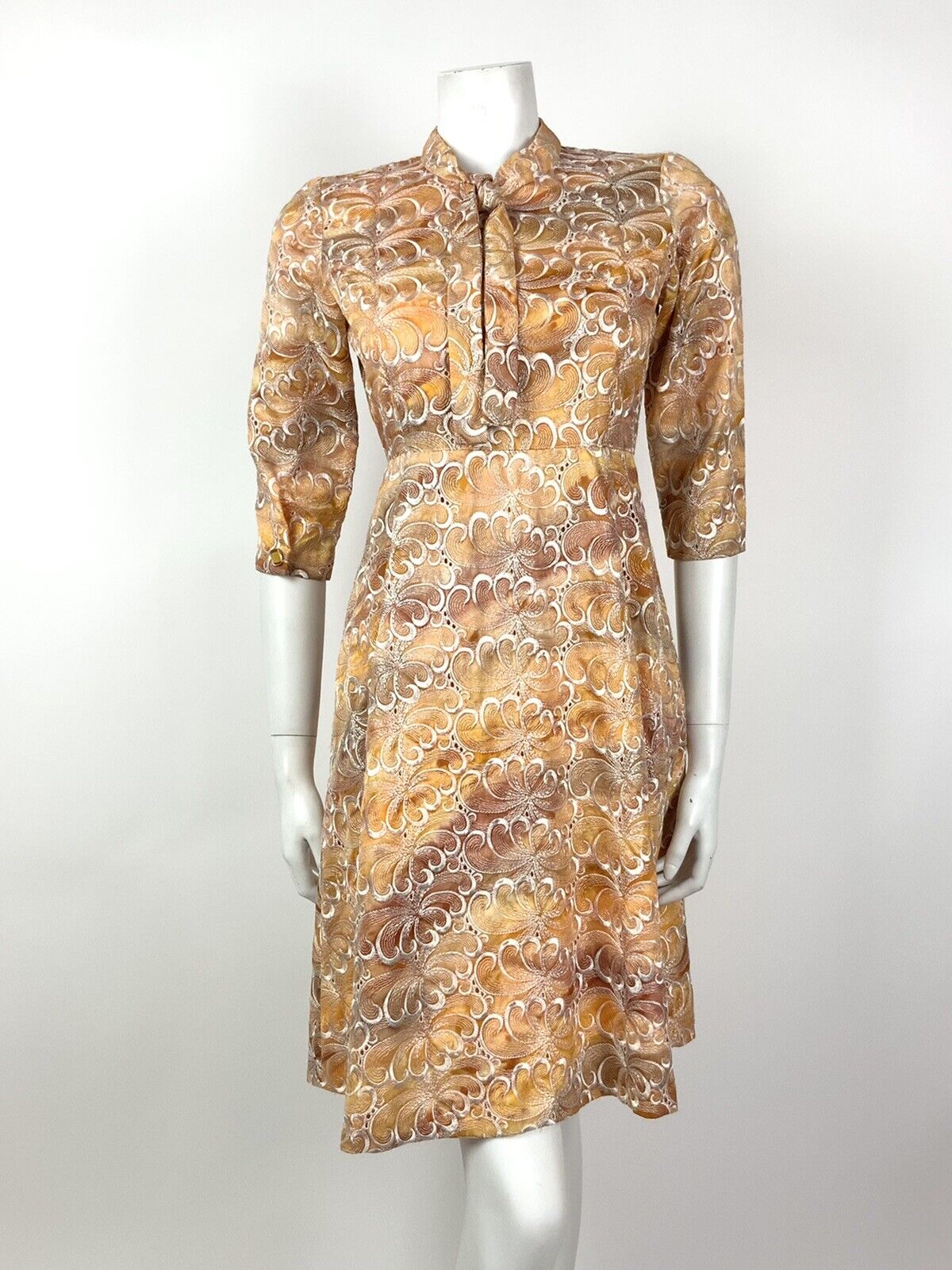 VINTAGE 60s 70s ORANGE BROWN WHITE EMBROIDERED ANGLAISE SWIRL BOW DRESS 8