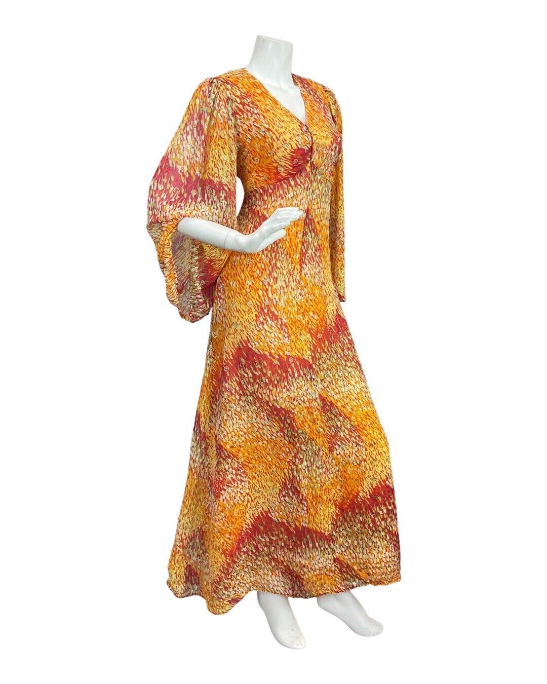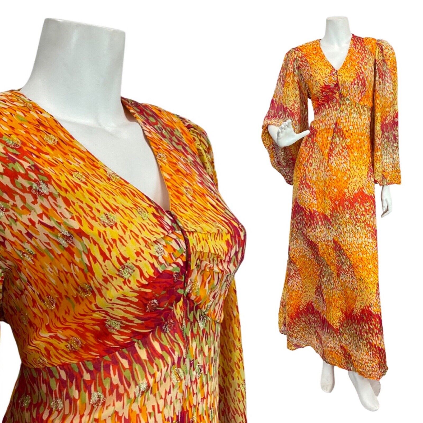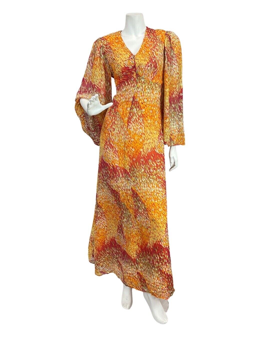VINTAGE 60s 70s ORANGE GOLD RED PSYCHEDELIC DASH ANGEL SLEEVE MAXI DRESS 10