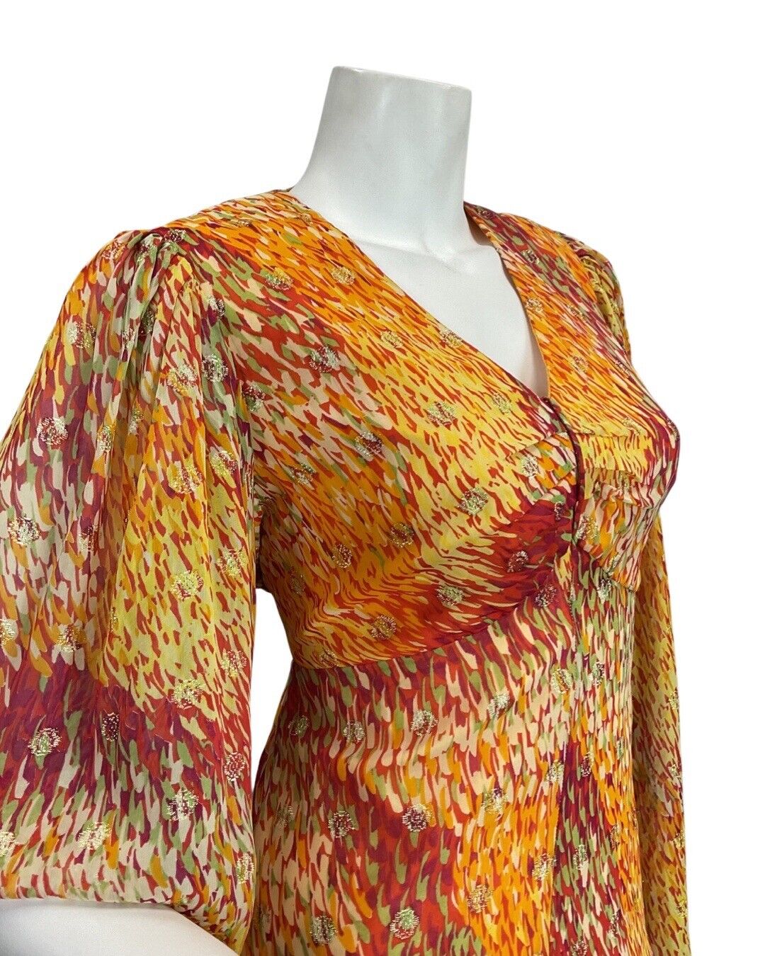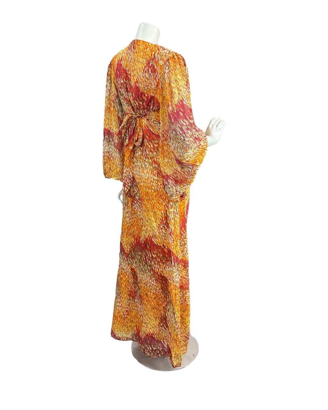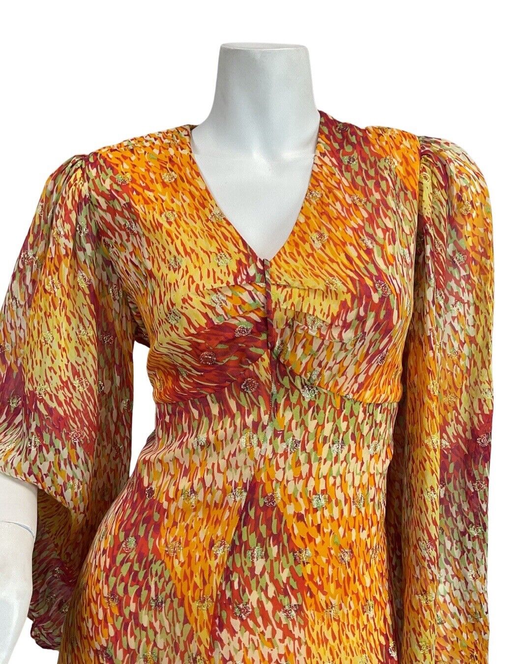 VINTAGE 60s 70s ORANGE GOLD RED PSYCHEDELIC DASH ANGEL SLEEVE MAXI DRESS 10