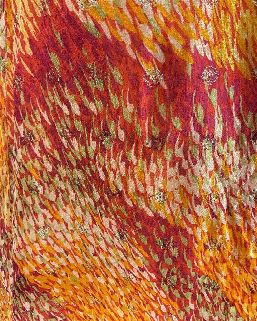 Covering the fabric is a busy psychedelic dash pattern in shades of orange, yellow, red, green, and gold.