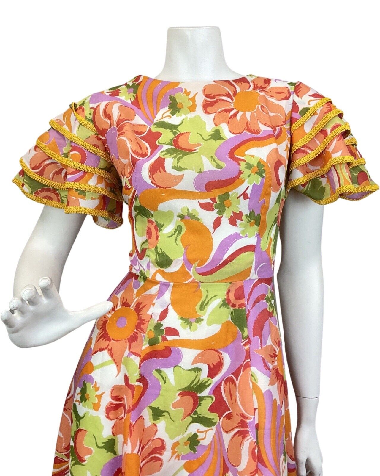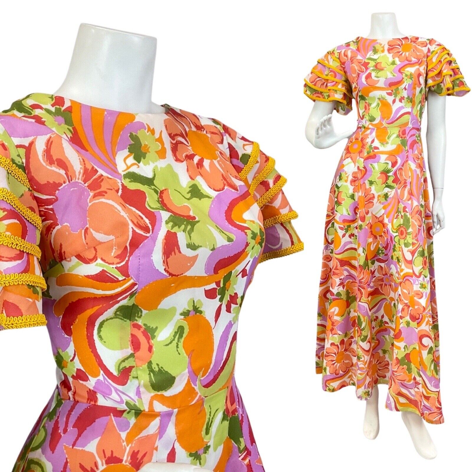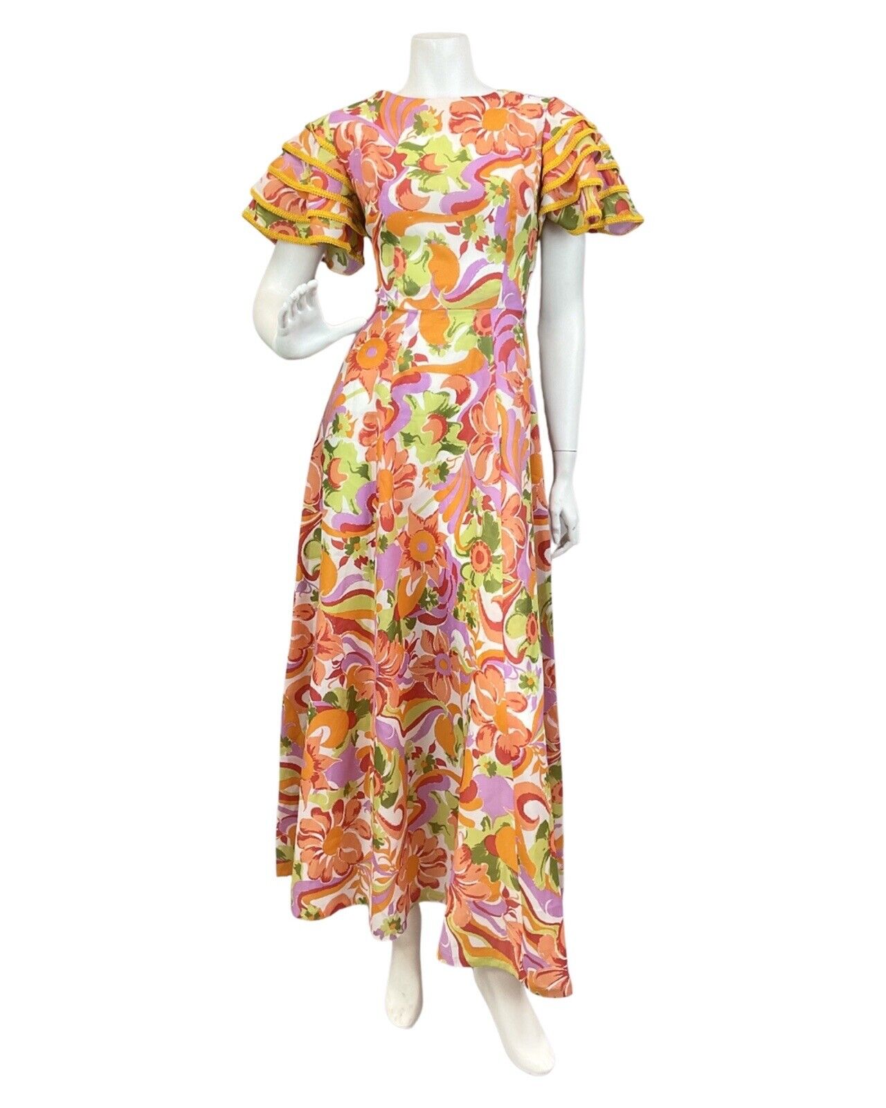 VINTAGE 60s 70s ORANGE GREEN LILAC PSYCHEDELIC FLORAL SUMMER MAXI DRESS 8 10