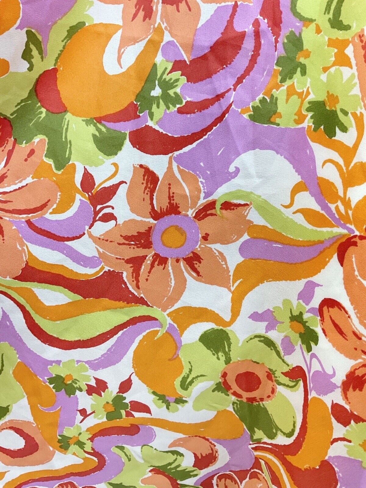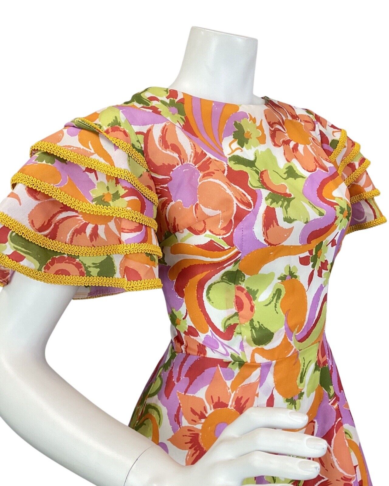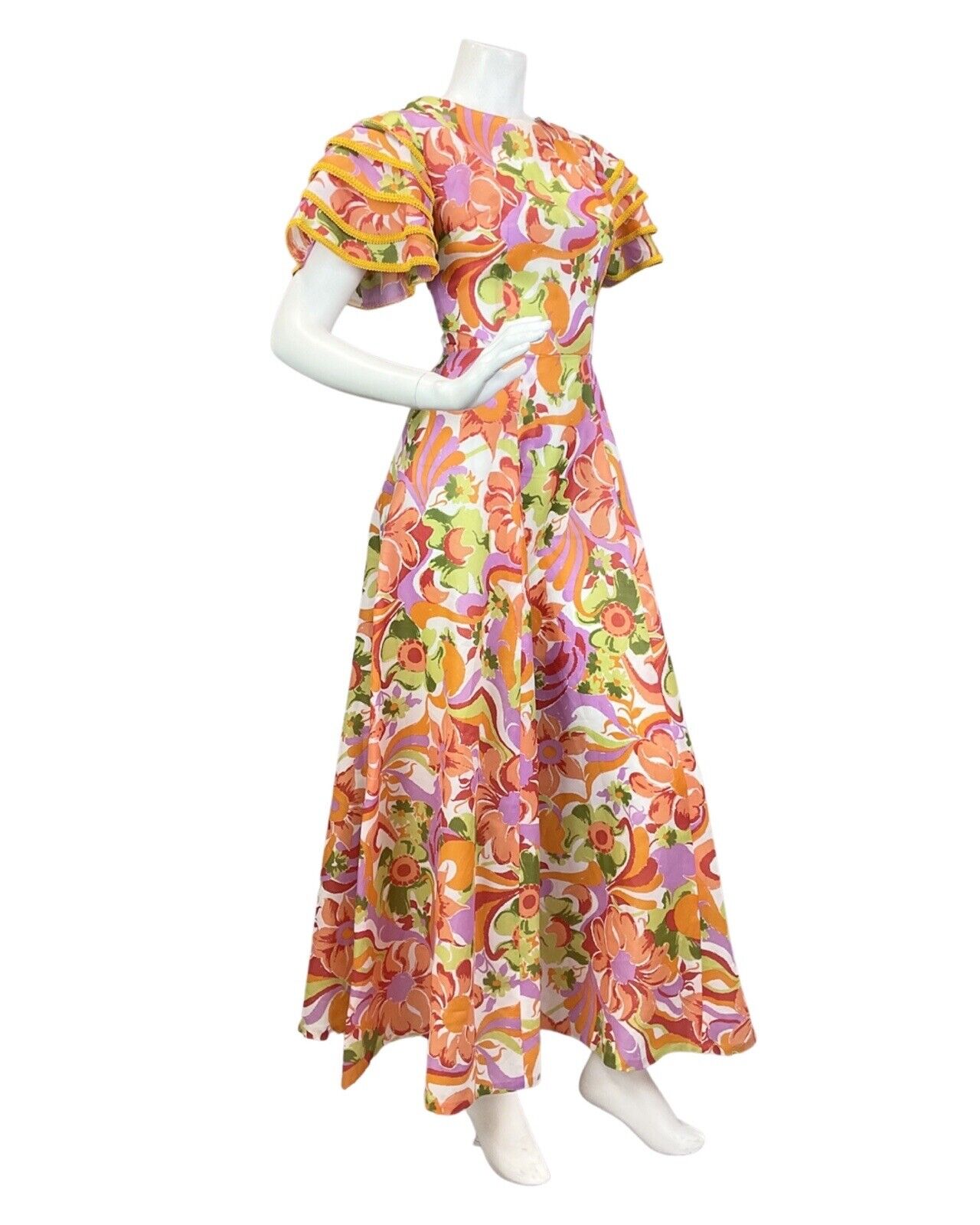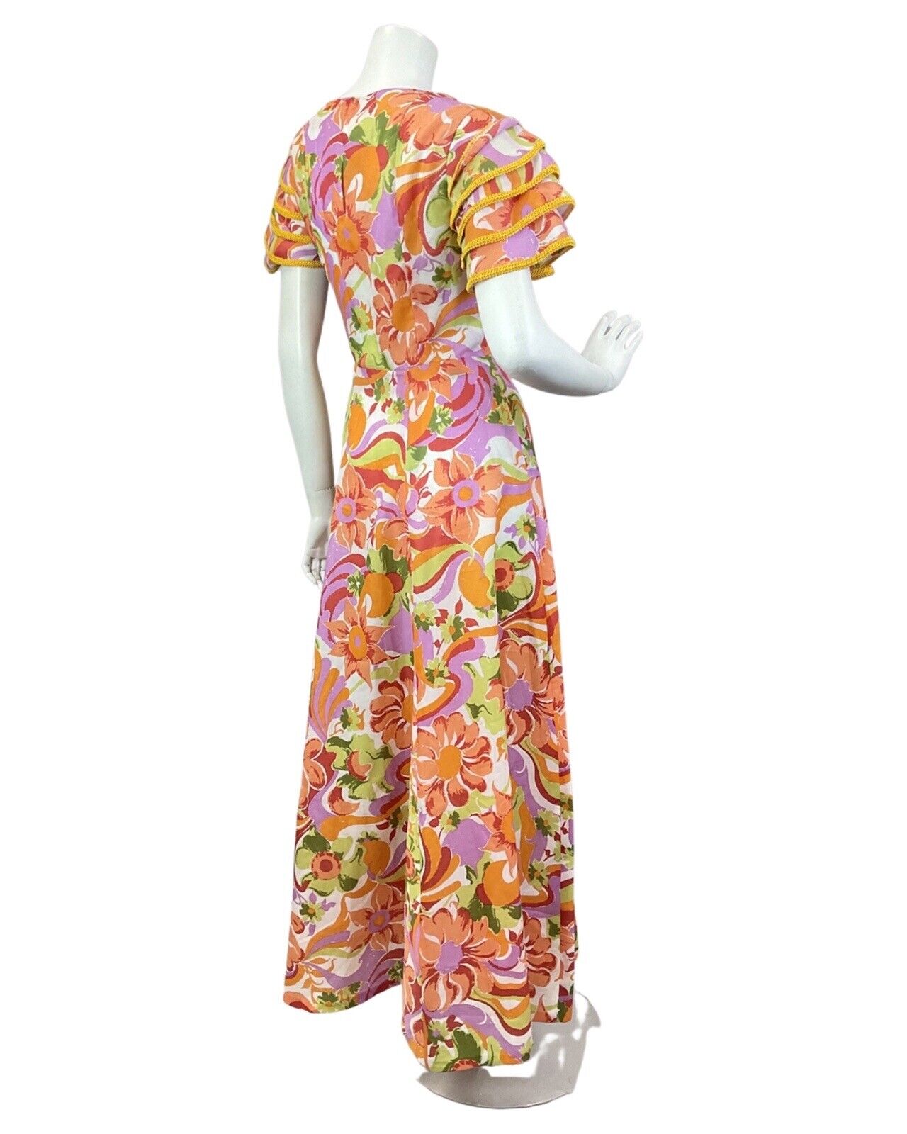 VINTAGE 60s 70s ORANGE GREEN LILAC PSYCHEDELIC FLORAL SUMMER MAXI DRESS 8 10