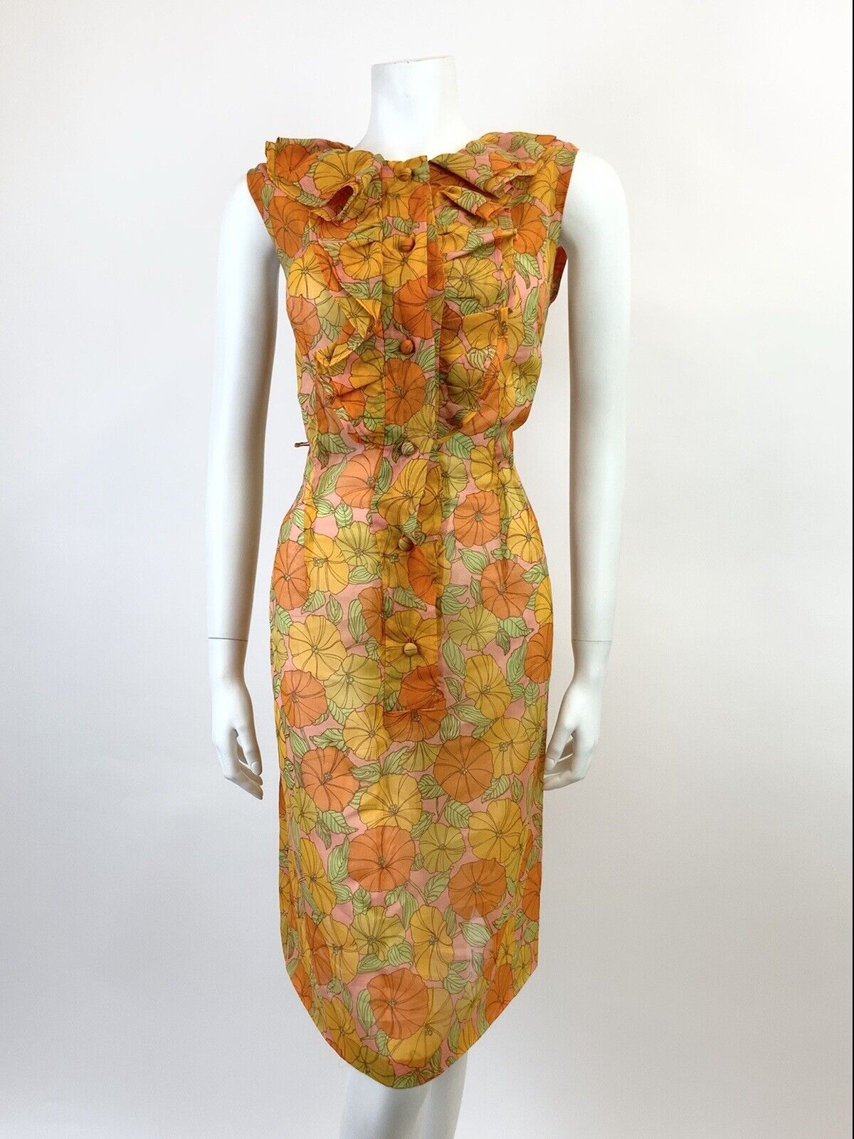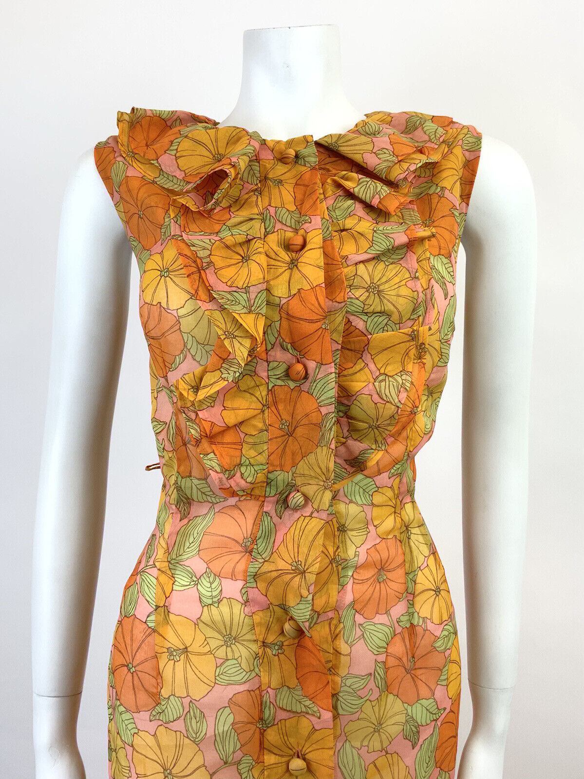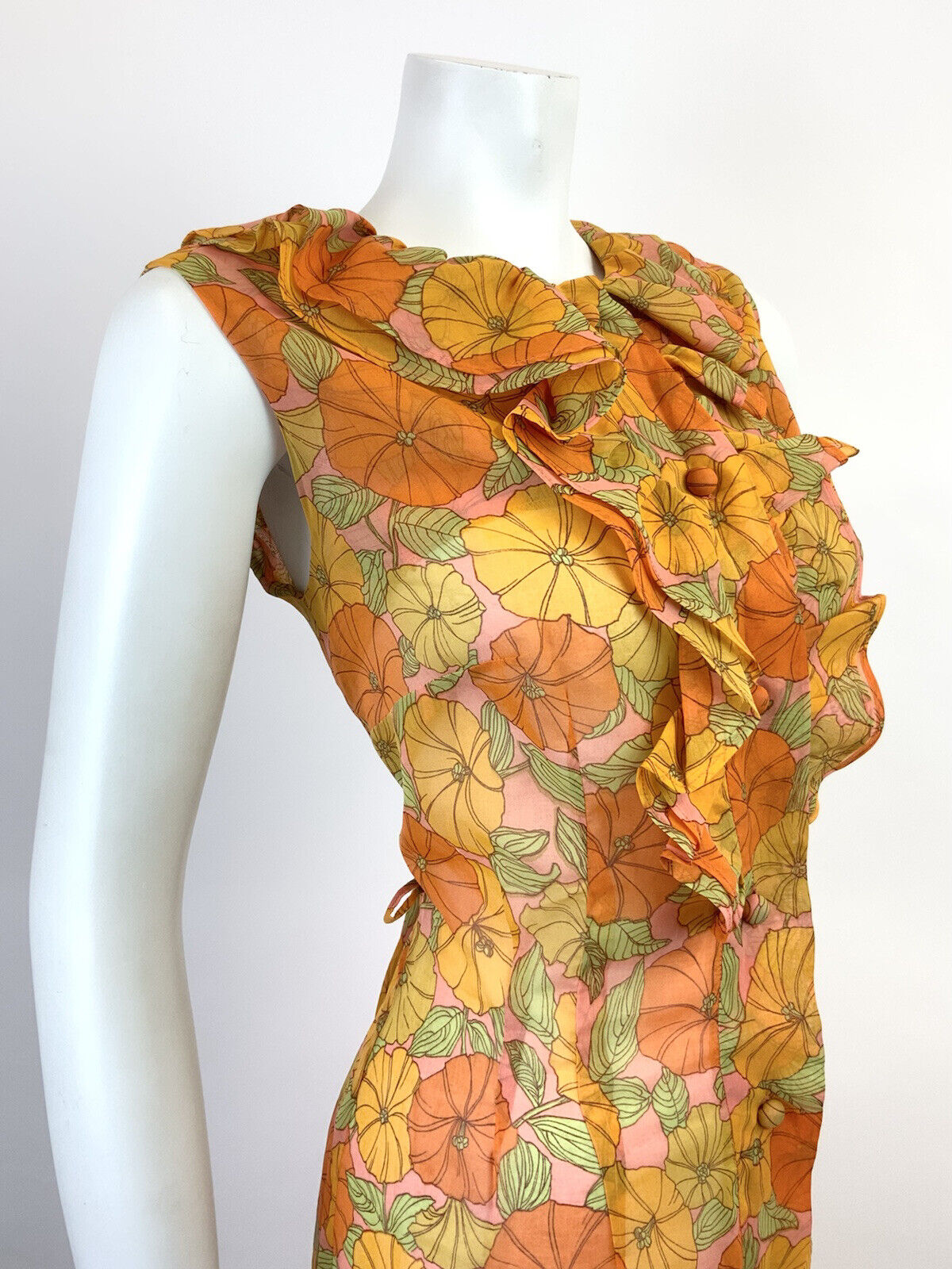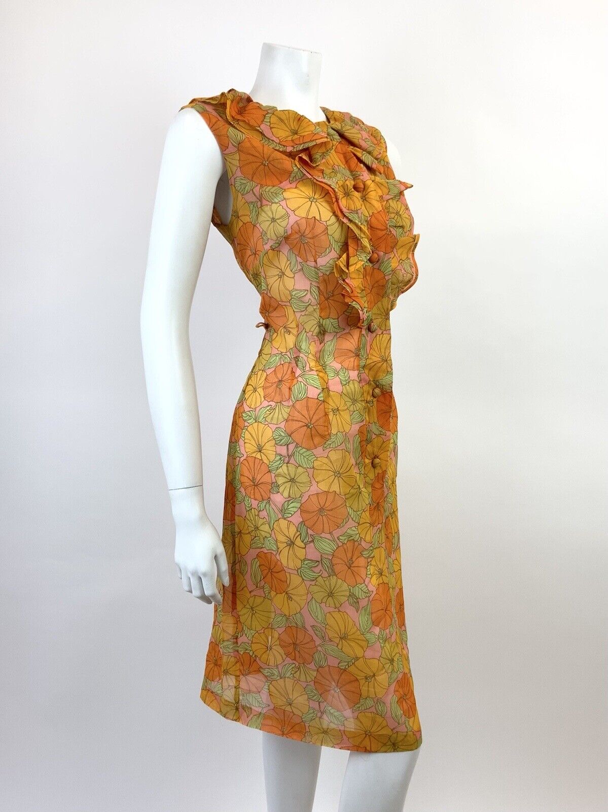 VINTAGE 60s 70s ORANGE PINK YELLOW GREEN FLORAL RUFFLE SHEER MOD DRESS 10 12