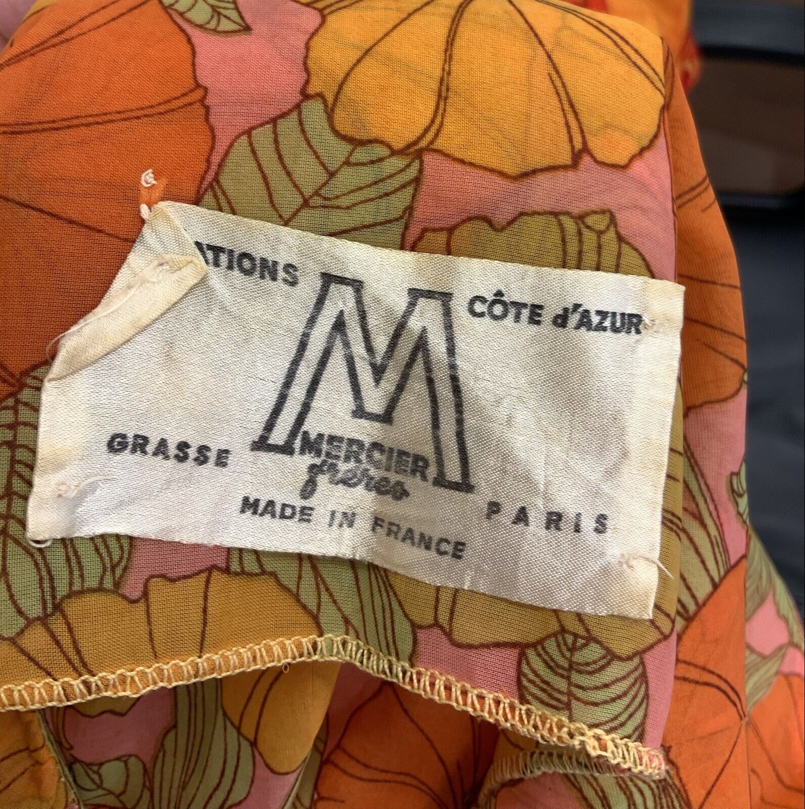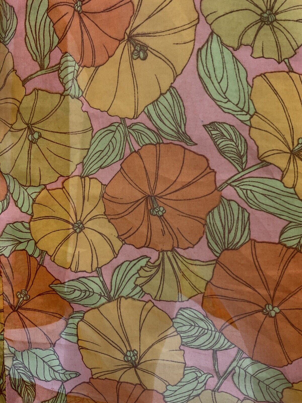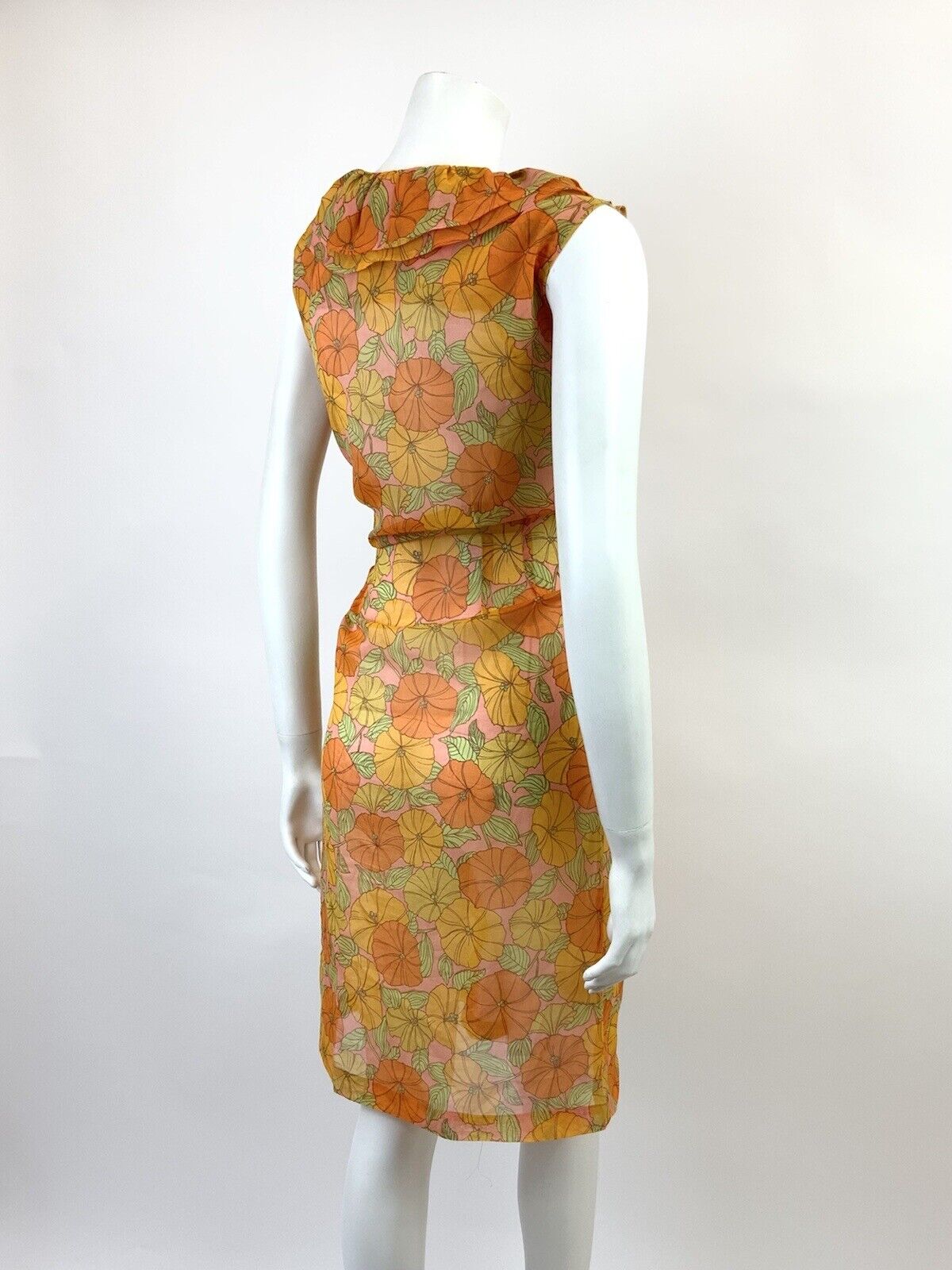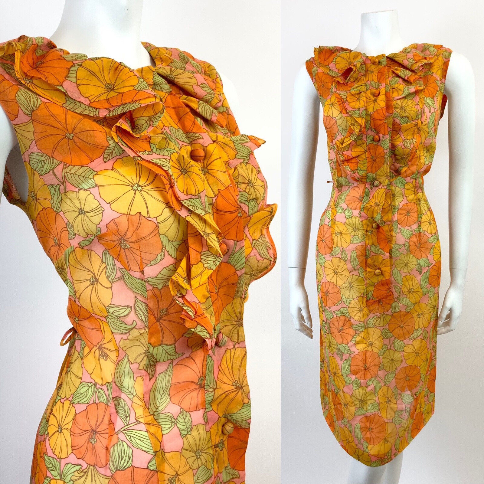 VINTAGE 60s 70s ORANGE PINK YELLOW GREEN FLORAL RUFFLE SHEER MOD DRESS 10 12