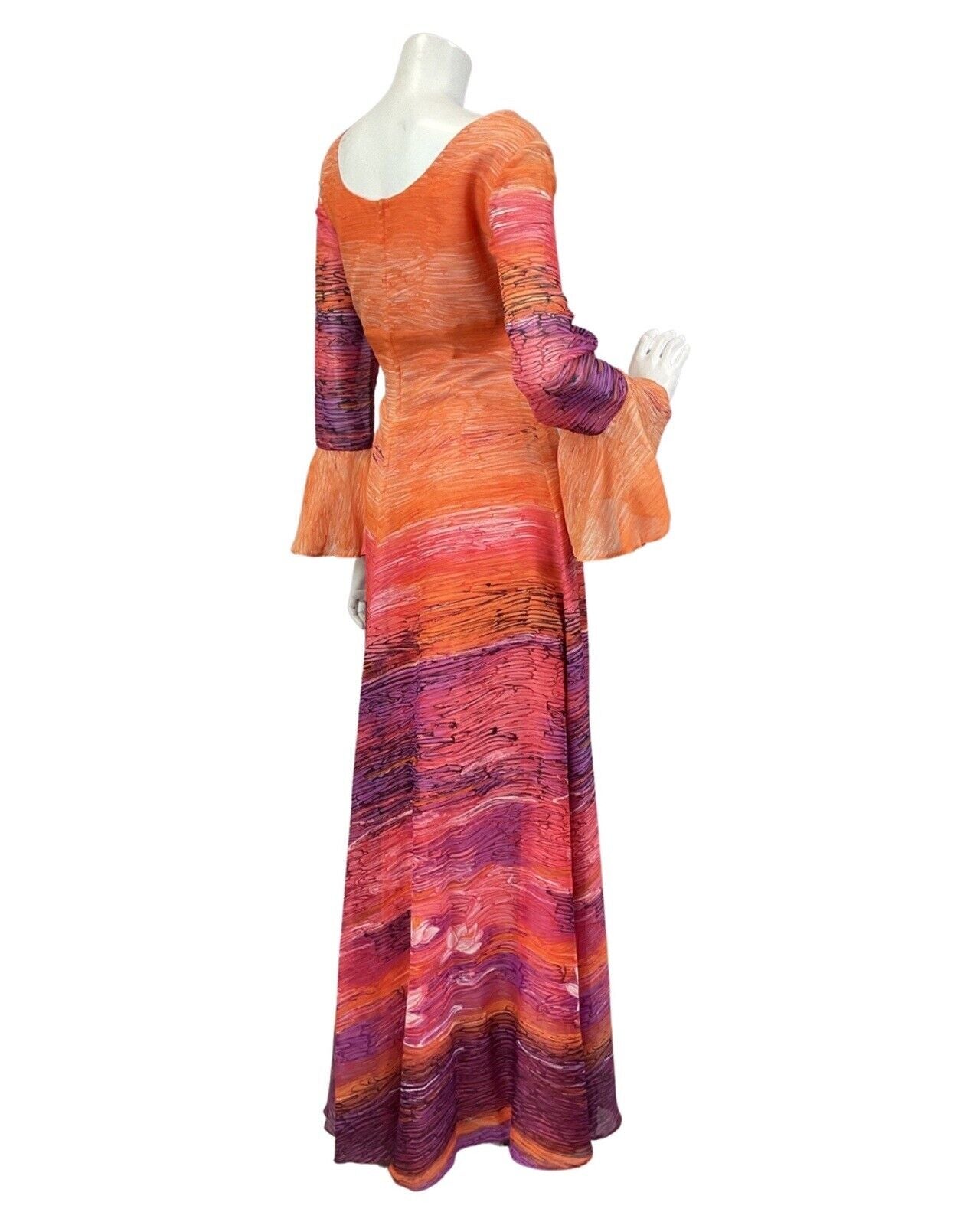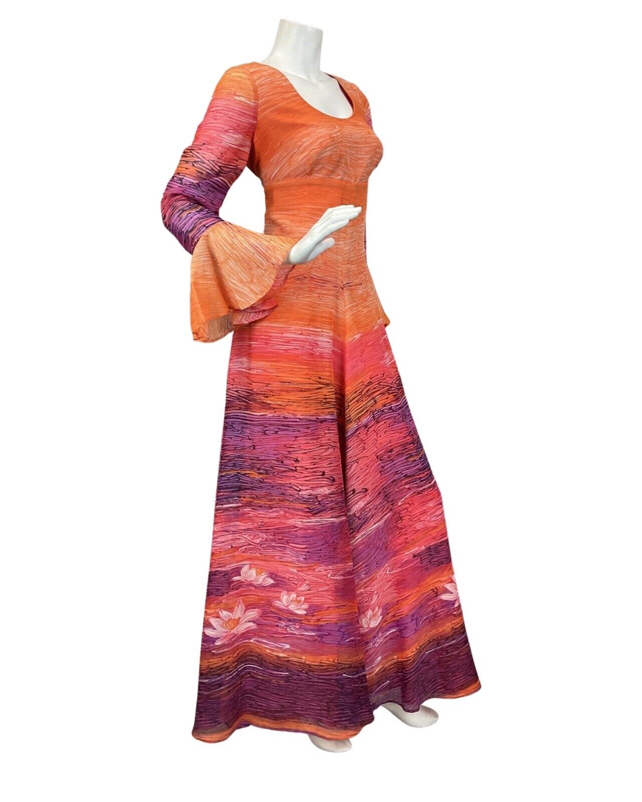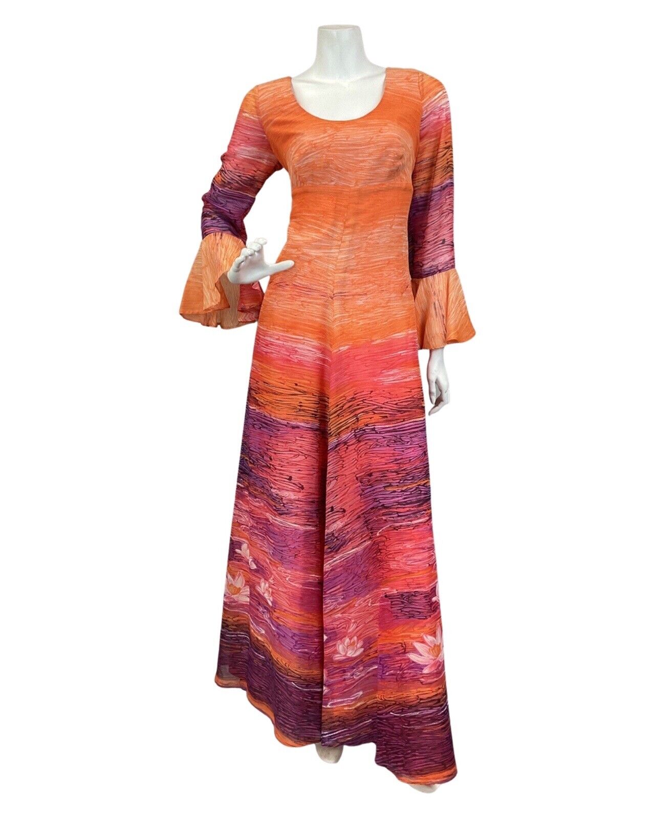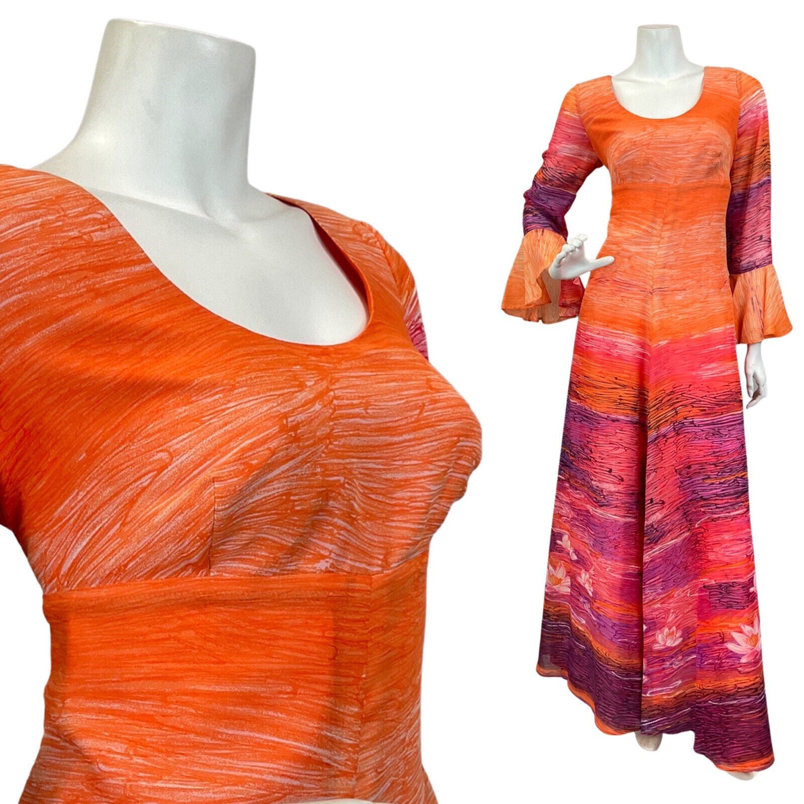 VINTAGE 60s 70s ORANGE PURPLE PINK STRIPED WATERLILY MAXI DRESS 12 14