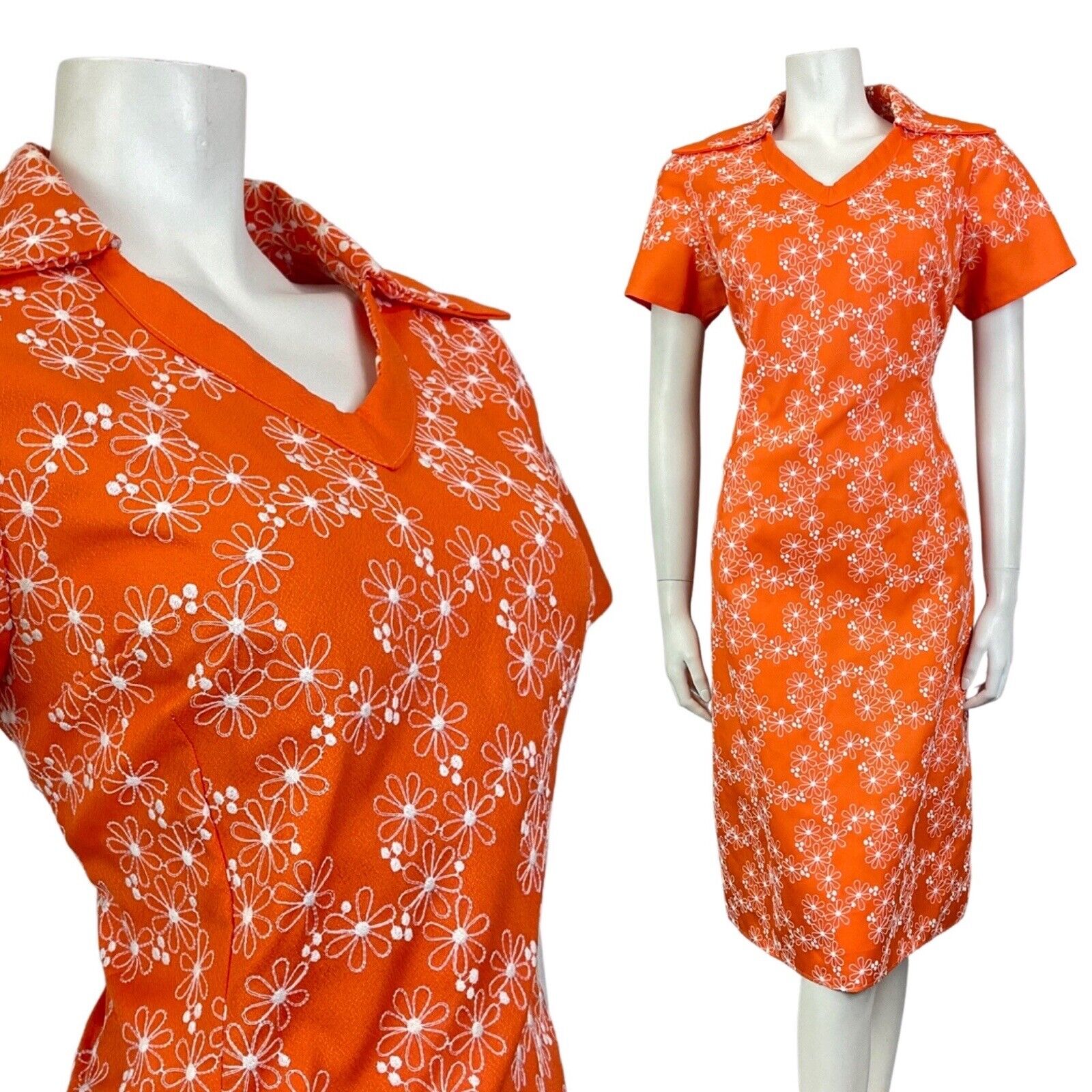 VINTAGE 60s 70s ORANGE WHITE EMBROIDERED FLORAL DAGGER COLLAR MOD DRESS 12