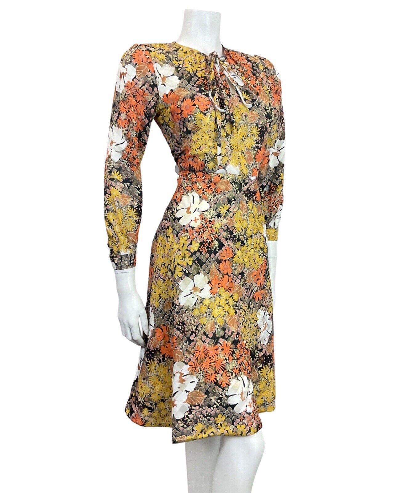 VINTAGE 60s 70s ORANGE YELLOW BLACK PSYCHEDELIC FLORAL SWING DRESS 10
