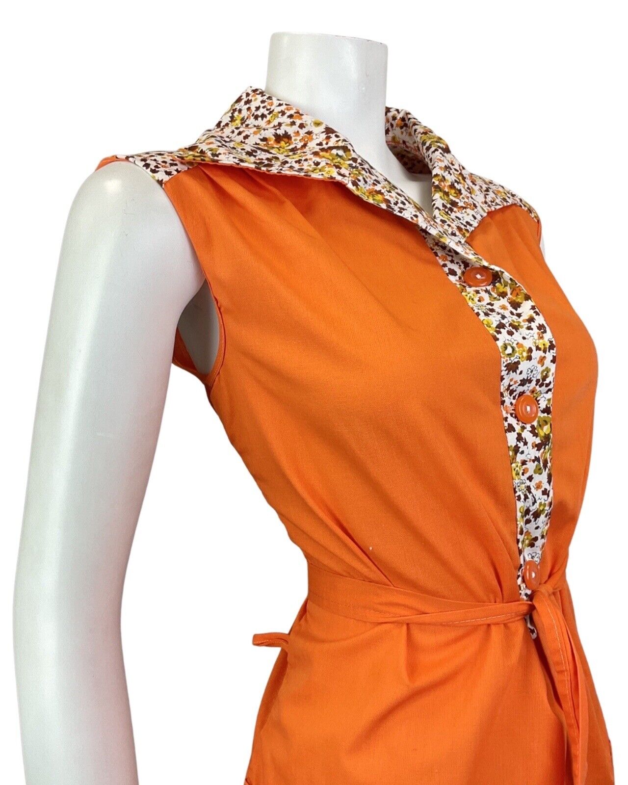 VINTAGE 60s 70s ORANGE YELLOW BROWN FLORAL LEAFY SLEEVELESS SHIRT DRESS 12 14