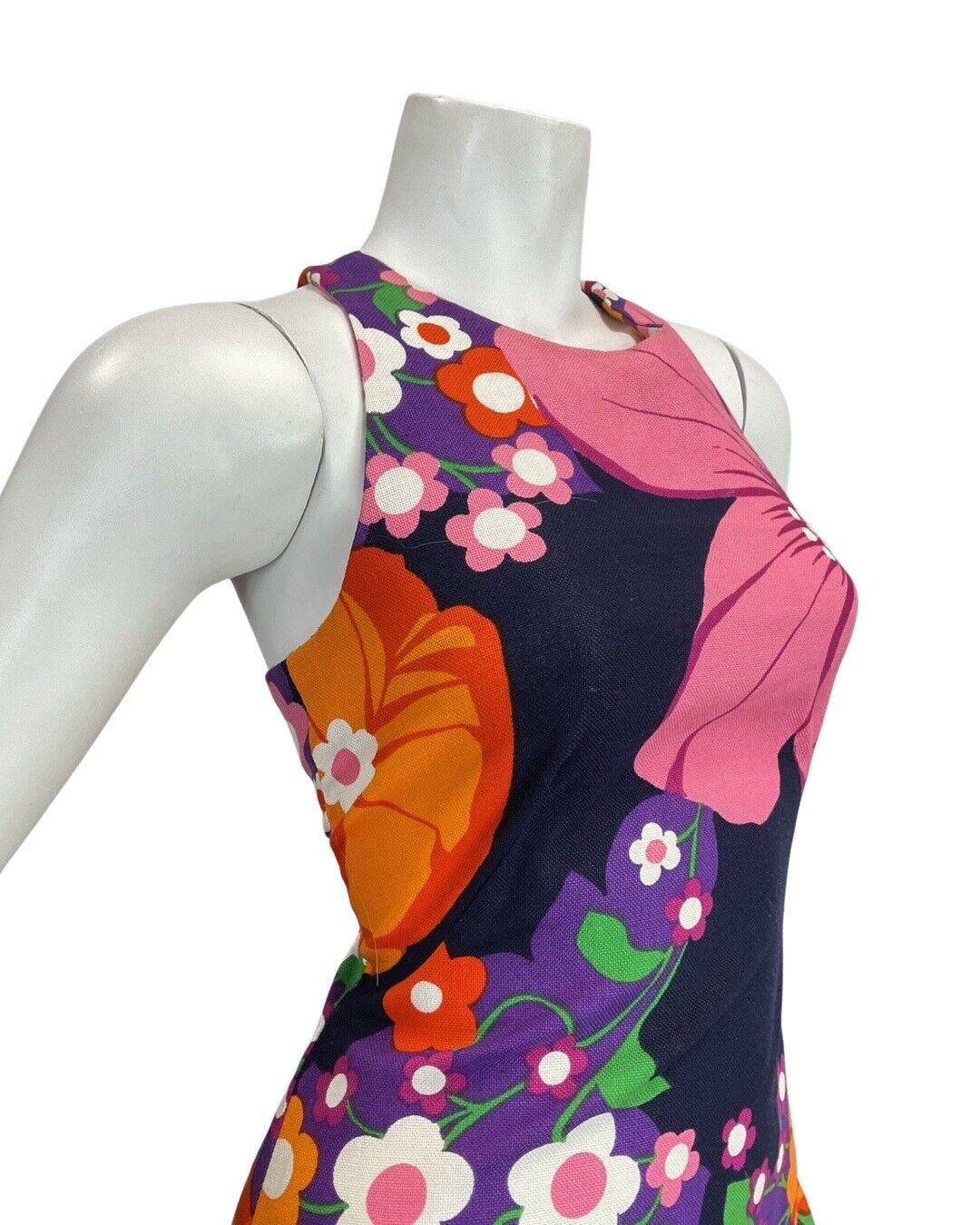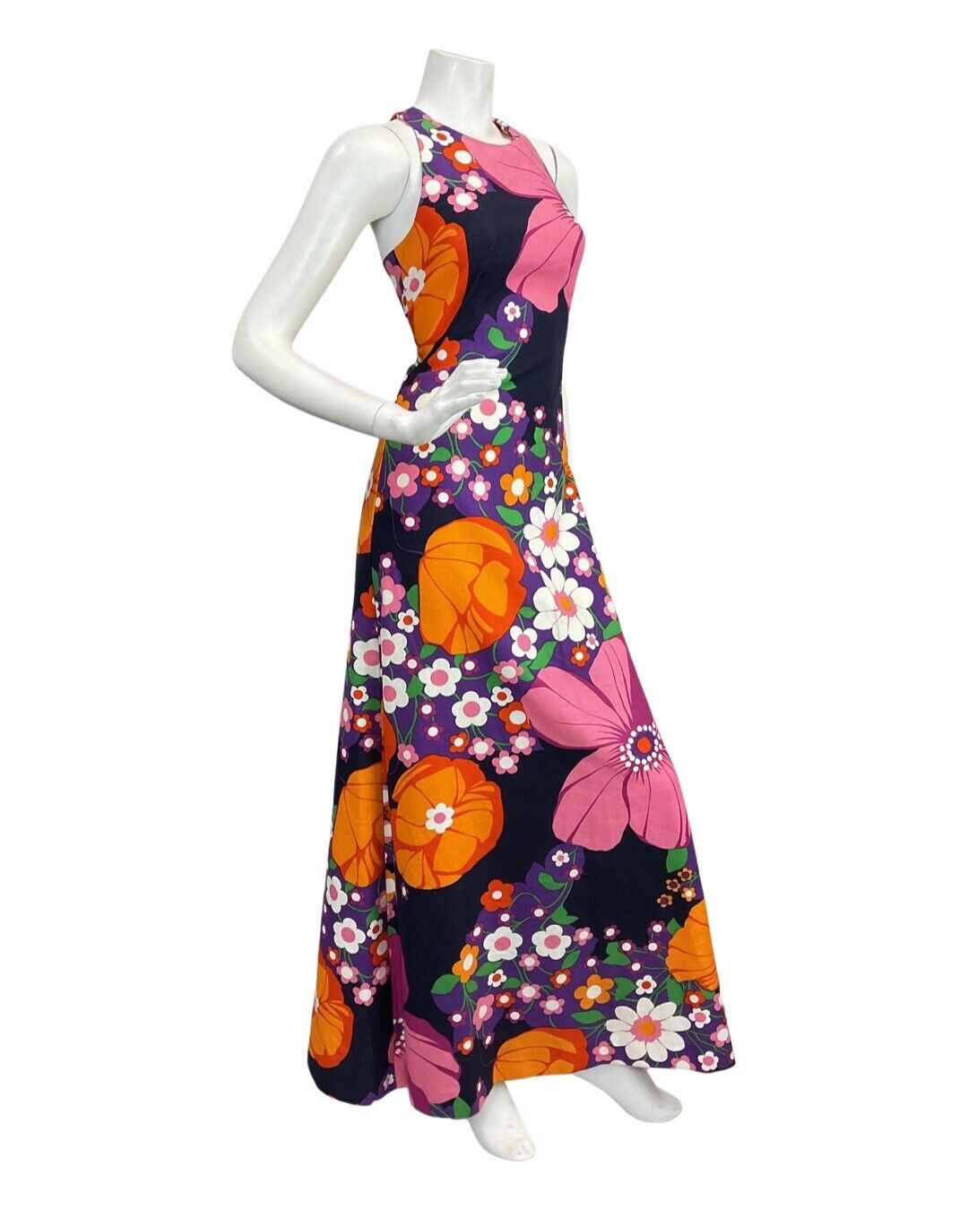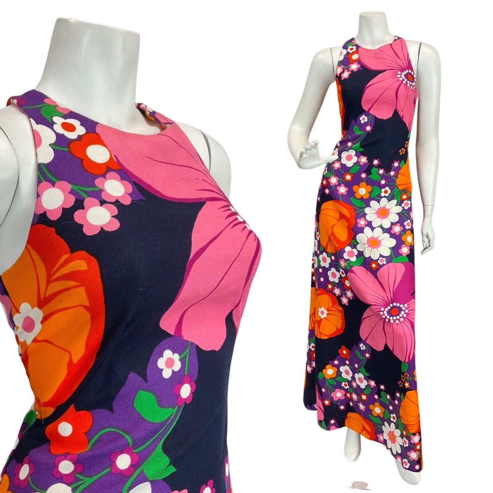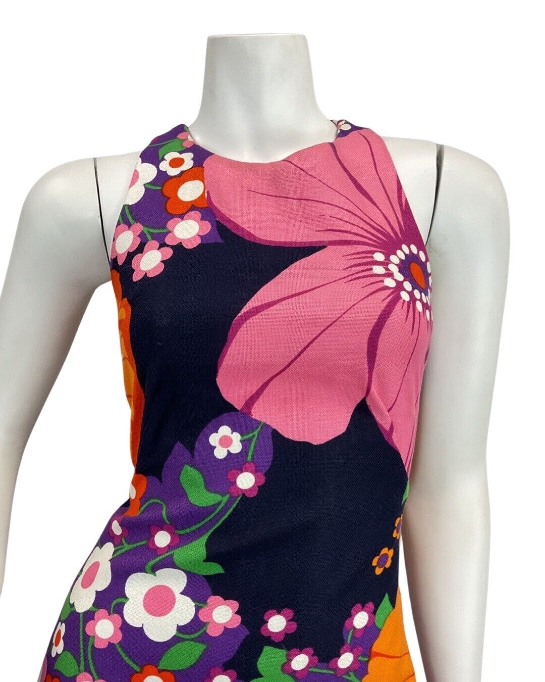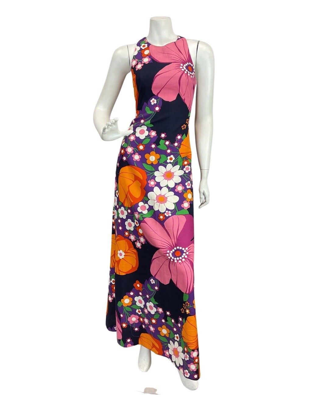 VINTAGE 60s 70s PINK BLUE ORANGE FLOWER DAISY MOD HALTER MAXI DRESS 8