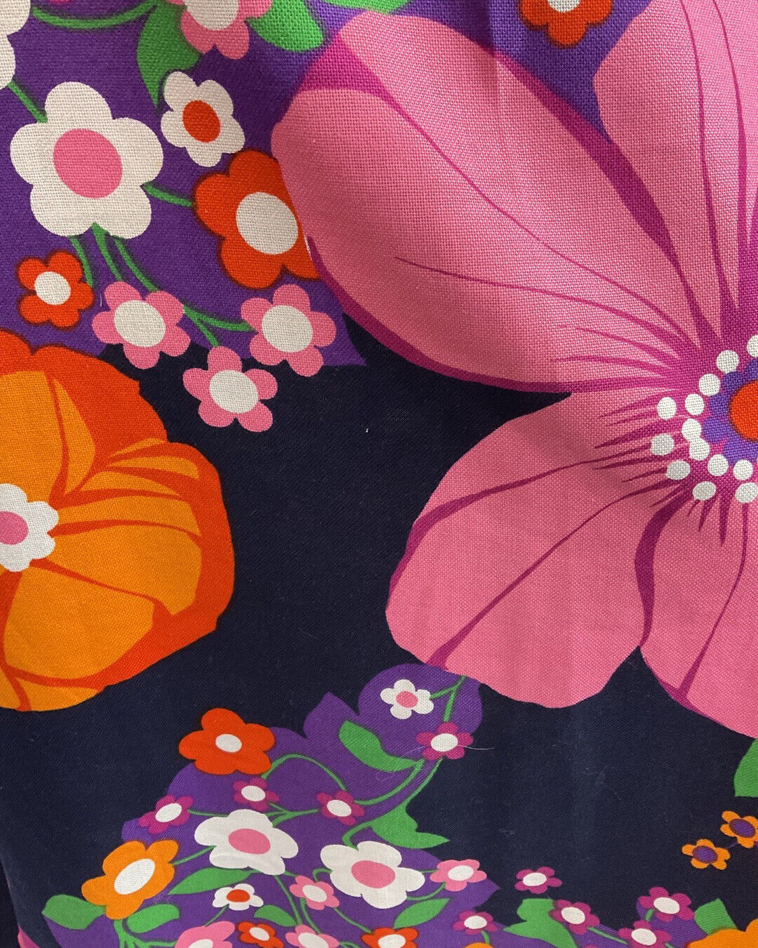 Covering the fabric is a bold floral pattern in bright block colours of pink, blue, orange, green, and white.