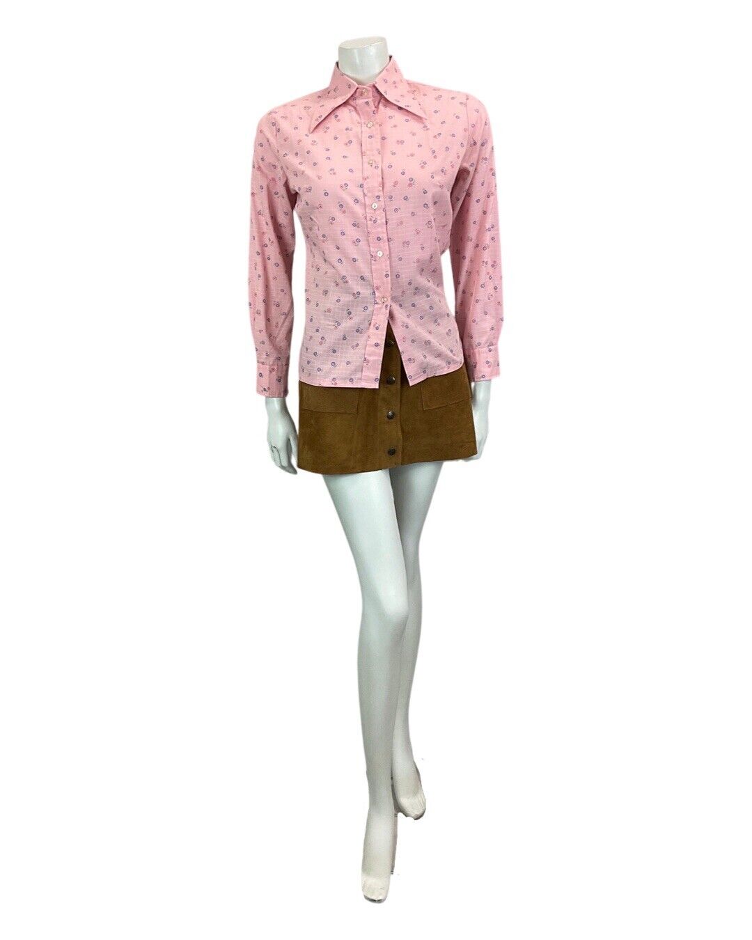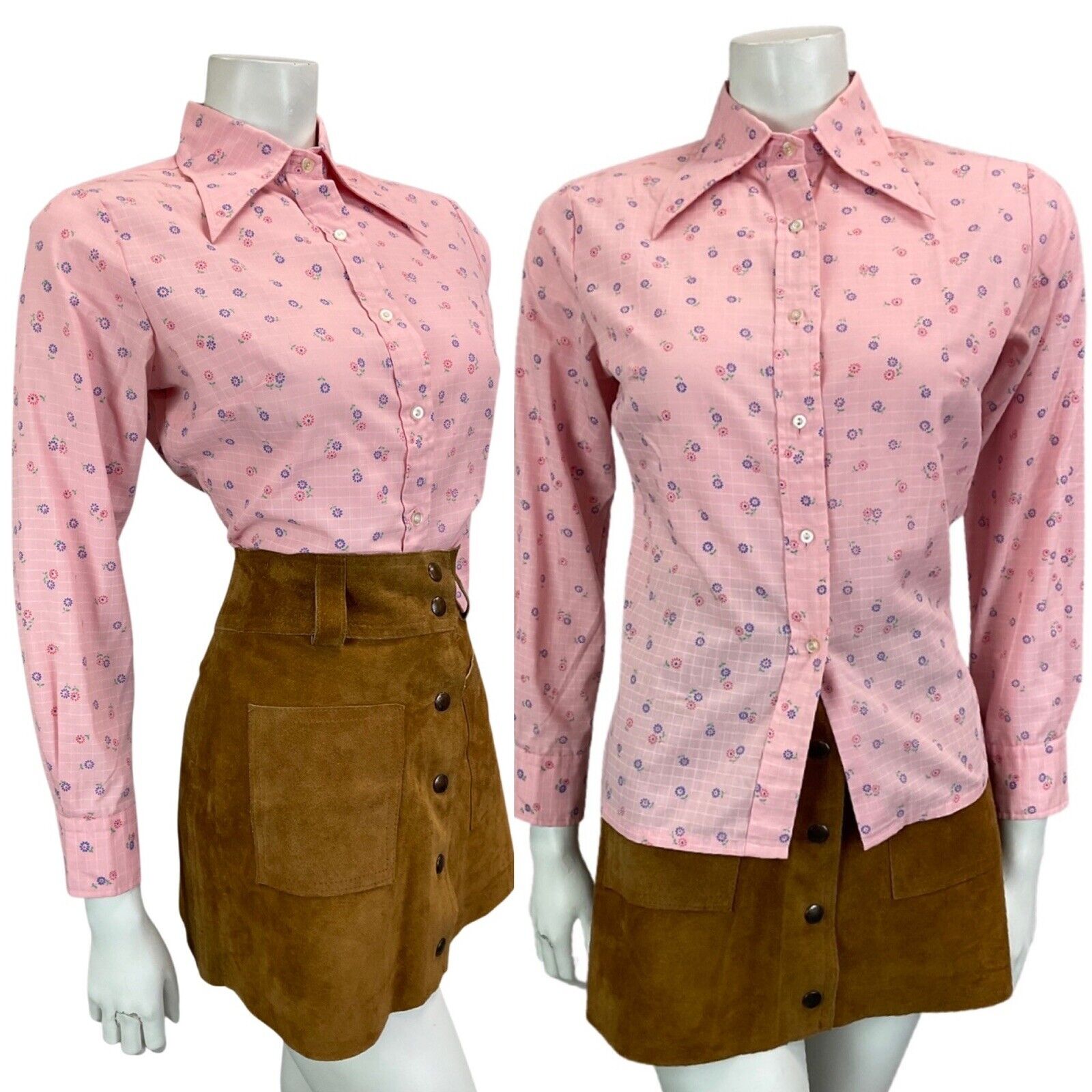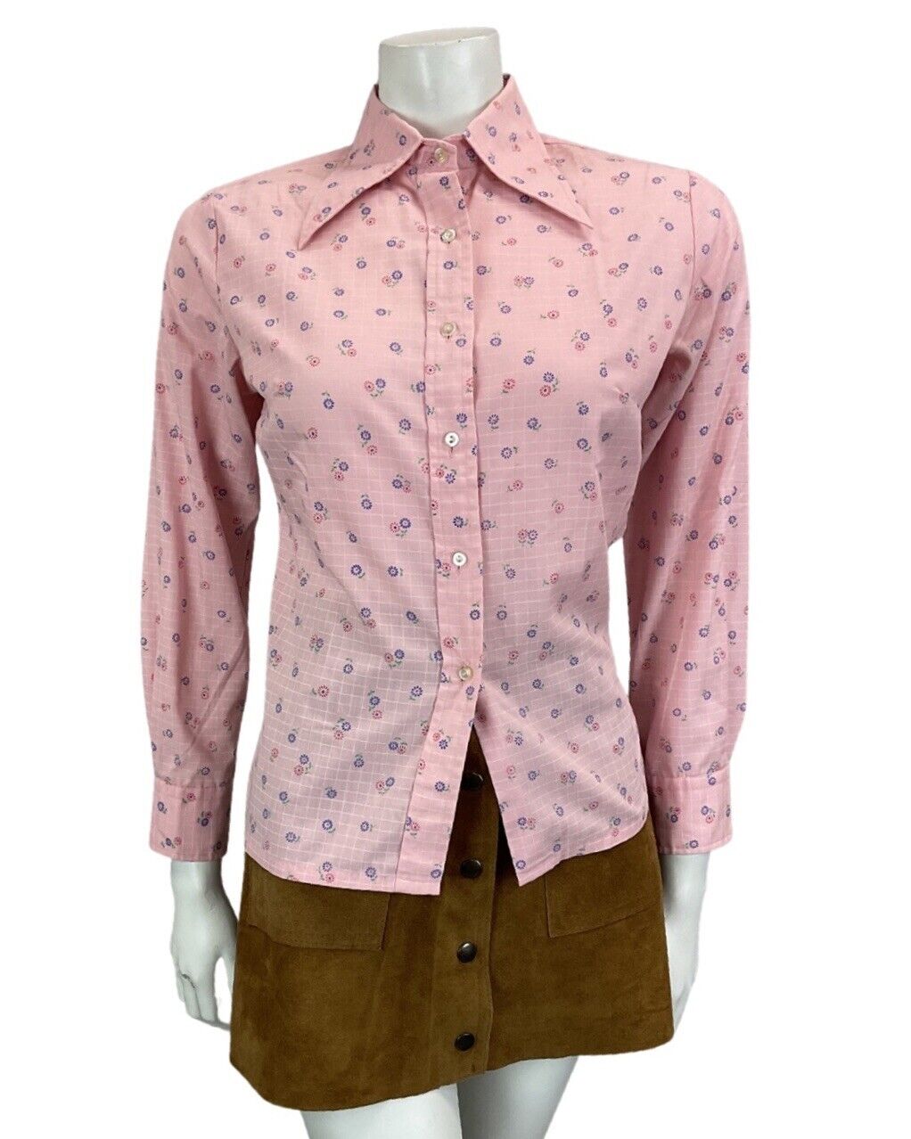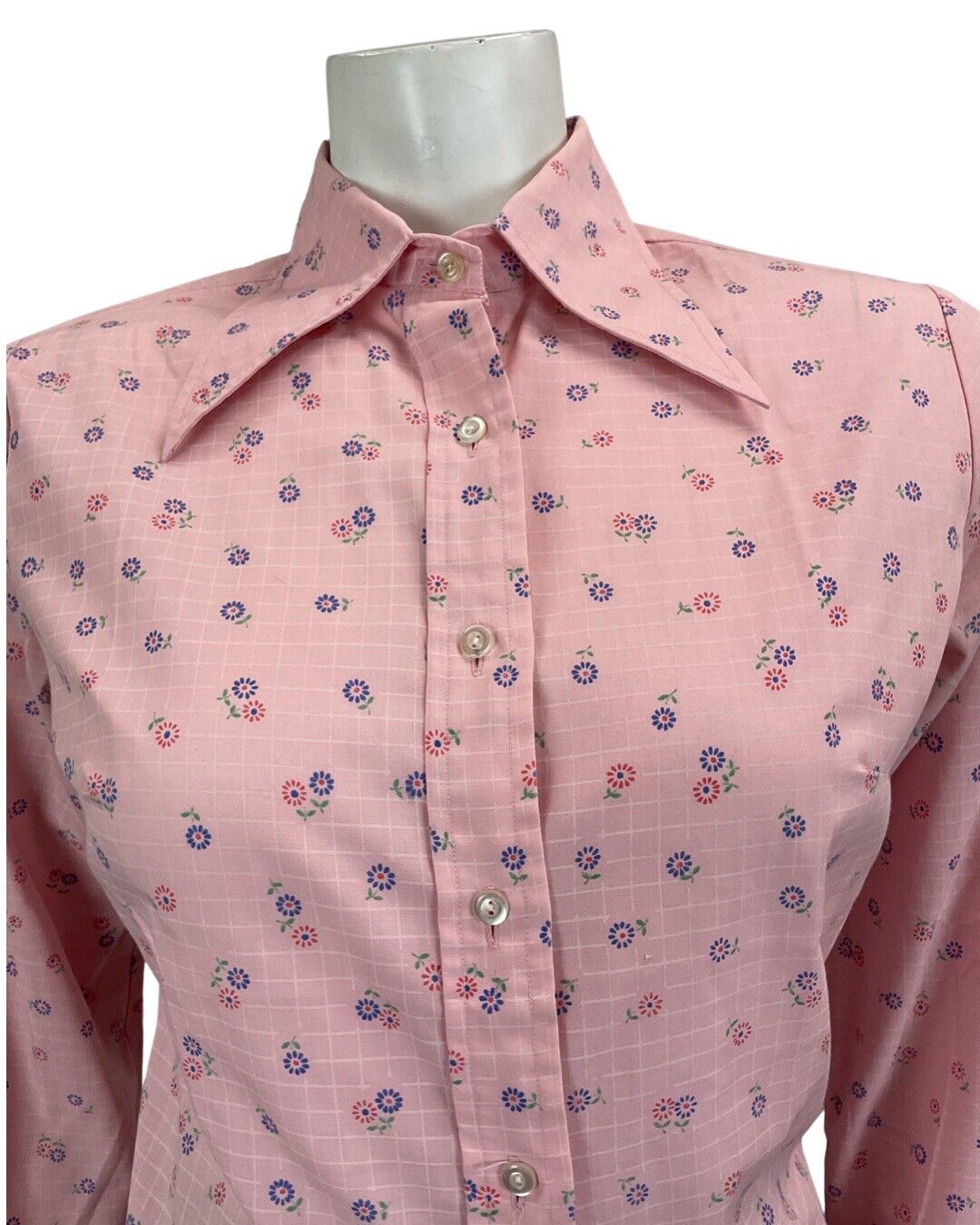 VINTAGE 60s 70s PINK BLUE RED FLORAL DAISY PRINT DAGGAR COLLAR SHIRT 12