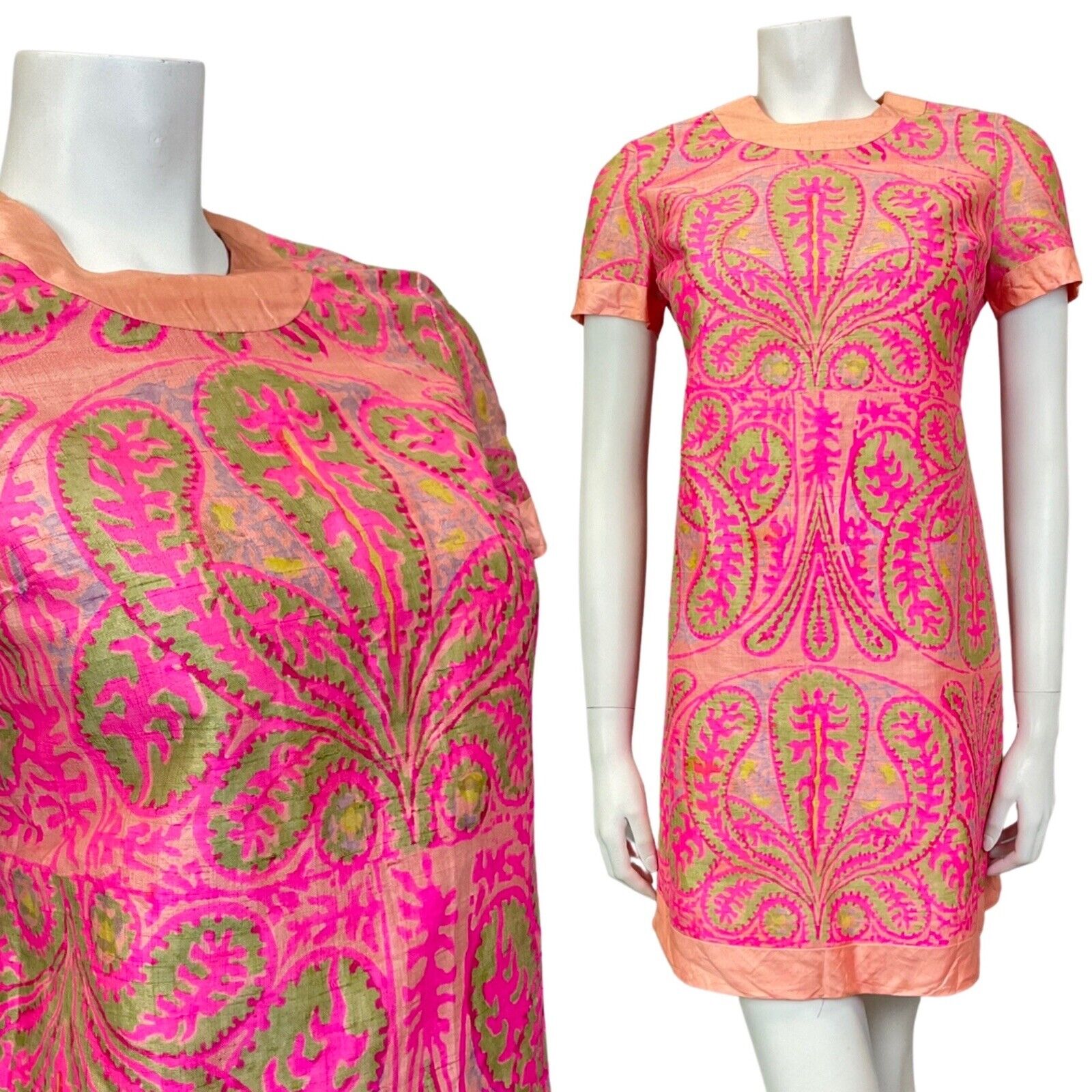 VINTAGE 60s 70s PINK PEACH LILAC GREEN PAISLEY MOD SHIFT DRESS 8 10