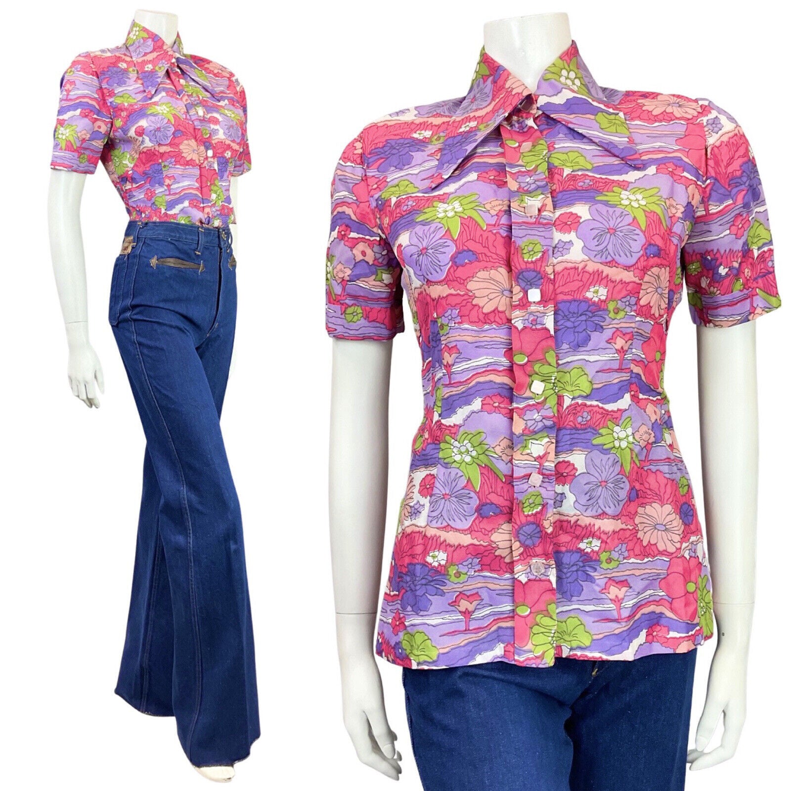VINTAGE 60s 70s PINK PURPLE GREEN PSYCHEDELIC FLORAL DAGGER SHIRT BLOUSE 10 12