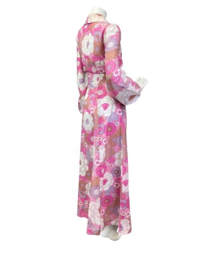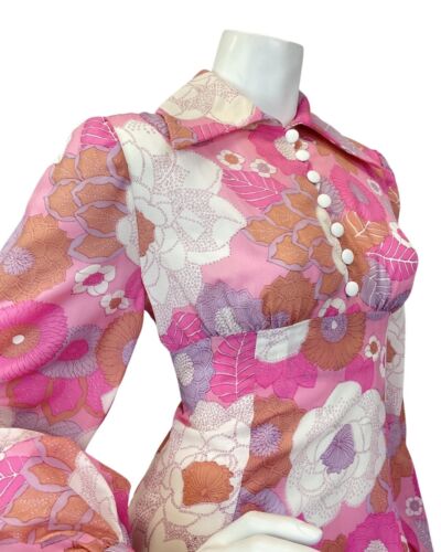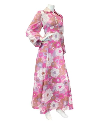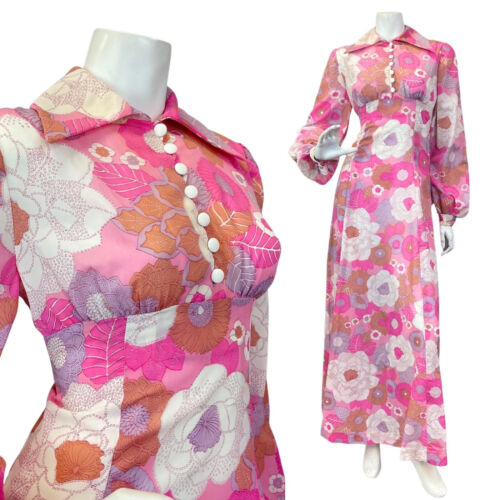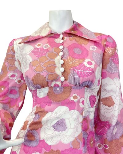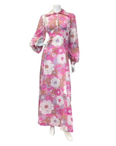 VINTAGE 60s 70s PINK PURPLE WHITE FLORAL PRAIRIE MOD WING COLLAR MAXI DRESS 8 10