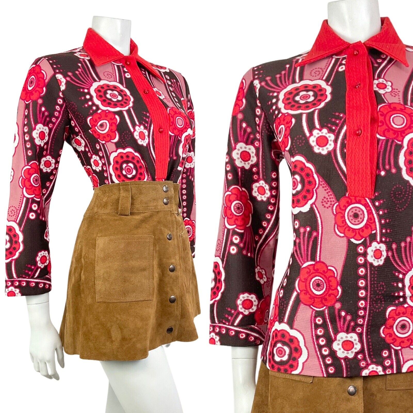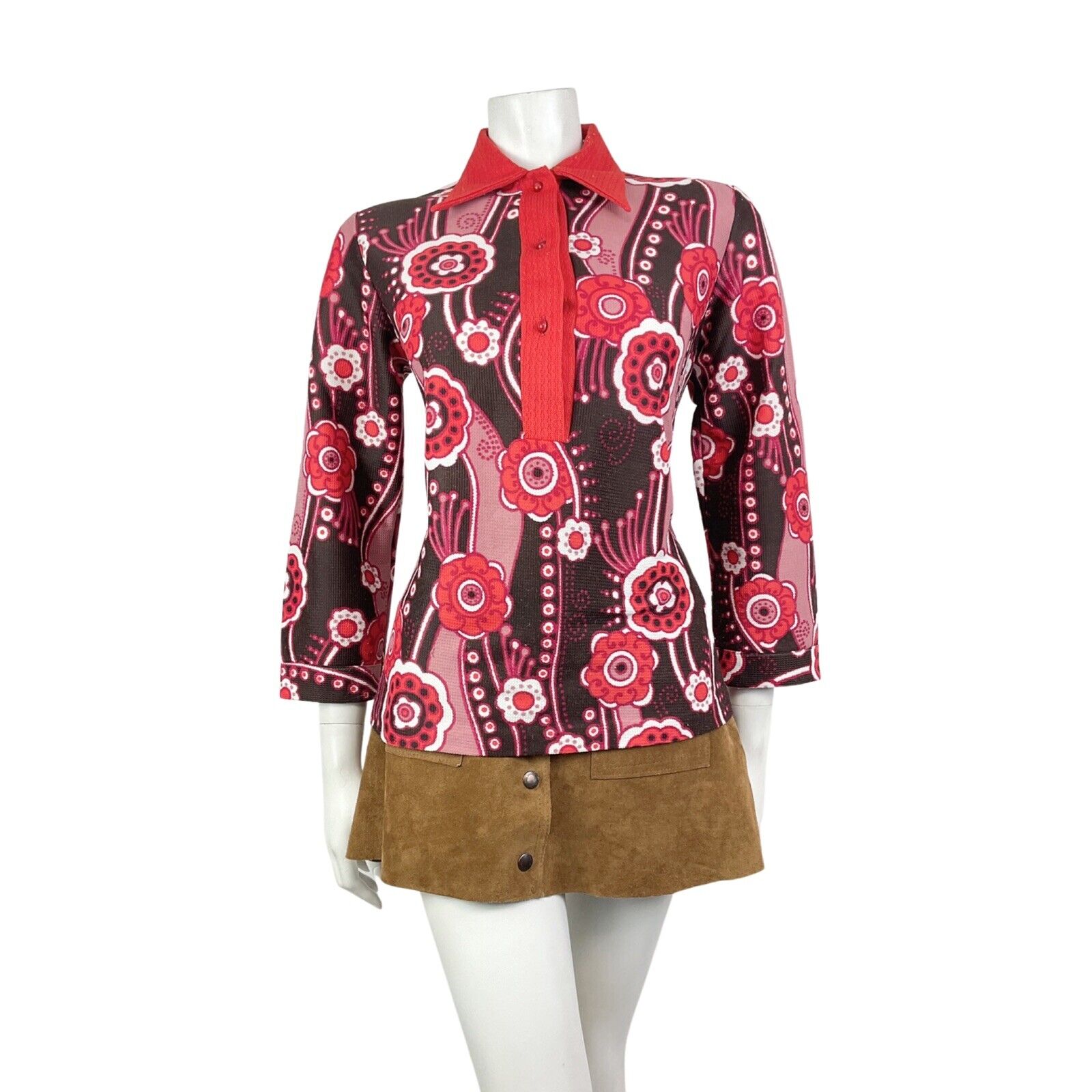 VINTAGE 60s 70s PINK RED BROWN FLORAL PSYCHEDELIC MOD DAGGER COLLAR BLOUSE 12 14