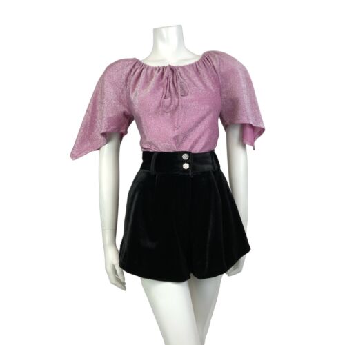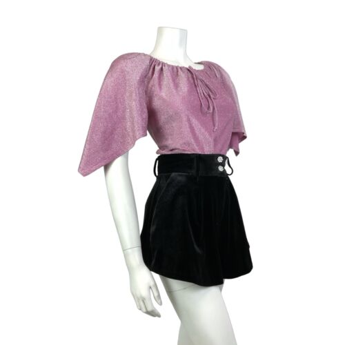 This is a lovely vintage top made from a light-weight, glittery pink, polyester lurex blend fabric with a good amount of stretch and no additional lining.