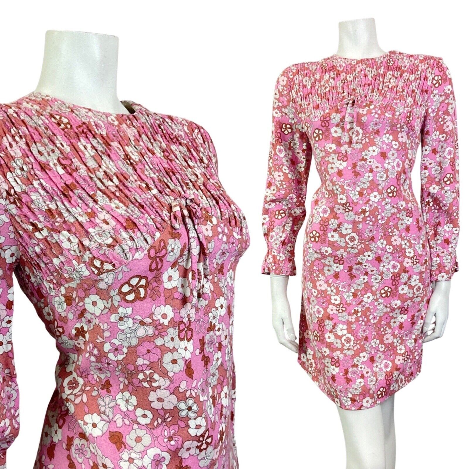 VINTAGE 60s 70s PINK WHITE PURPLE DAISY FLOWER SHIRRED MOD SUMMER DRESS 10 12