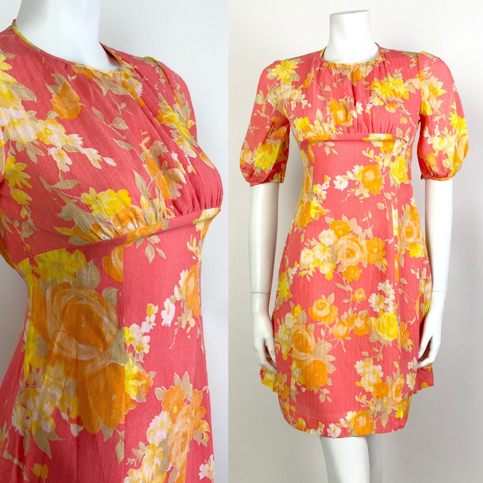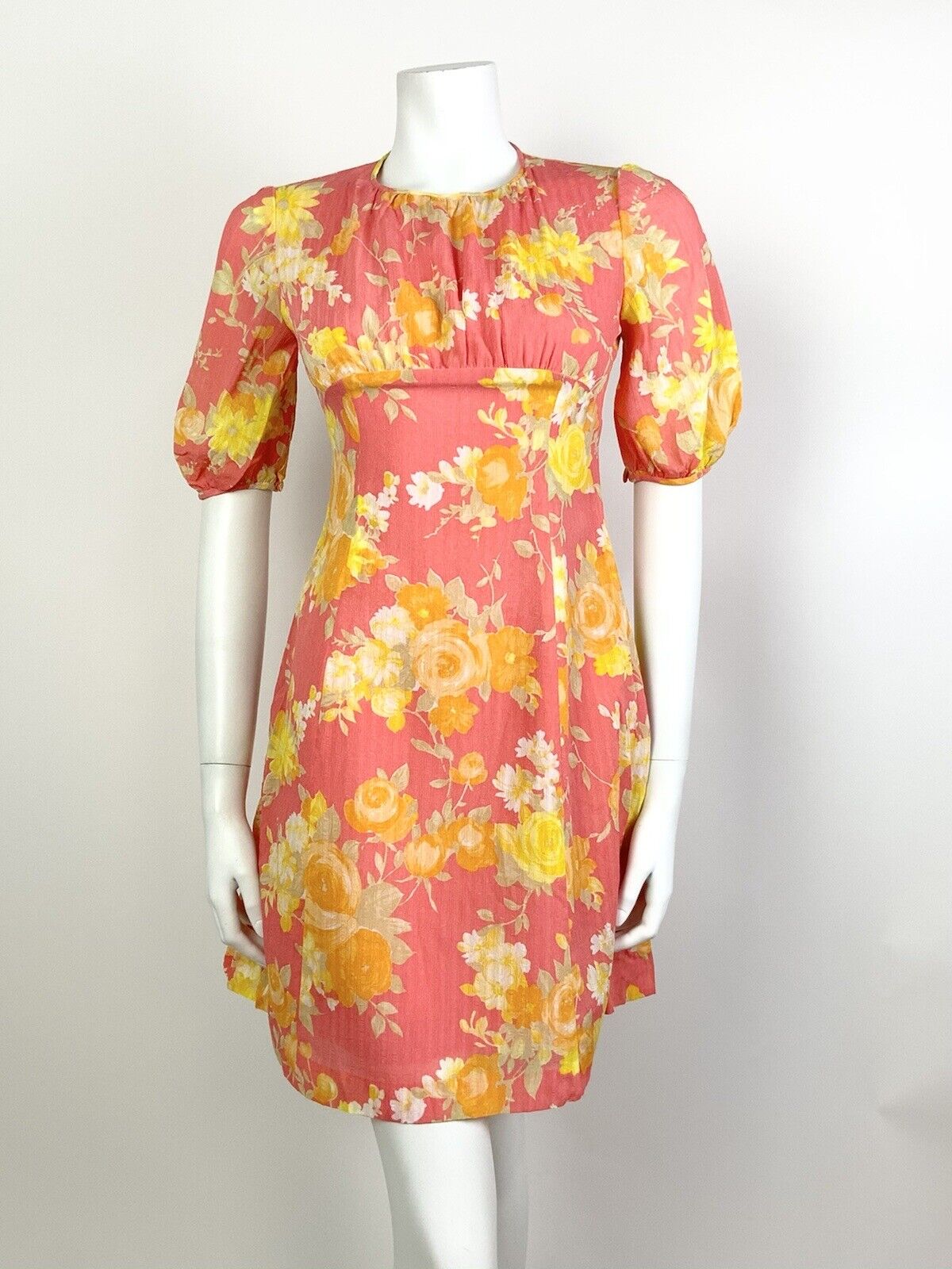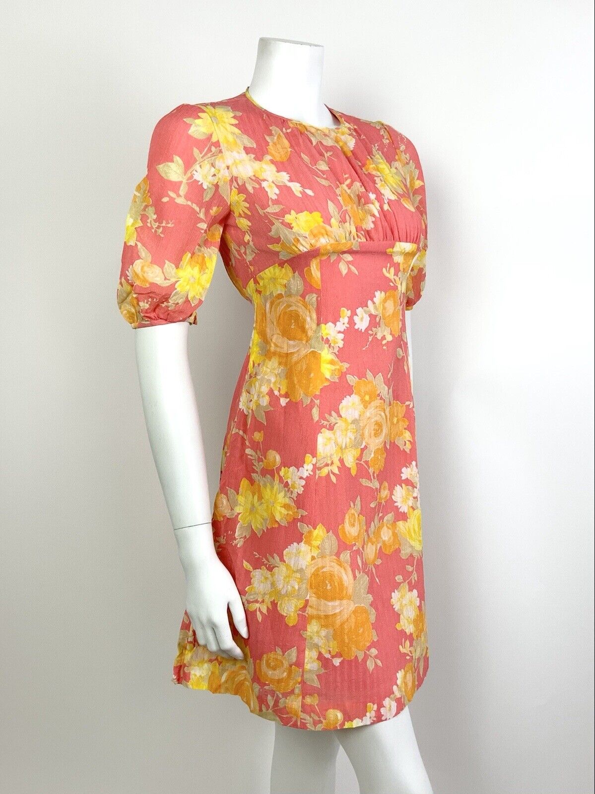 VINTAGE 60s 70s PINK YELLOW ORANGE FLORAL PUFF SLEEVE MOD EMPIRE LINE DRESS 8