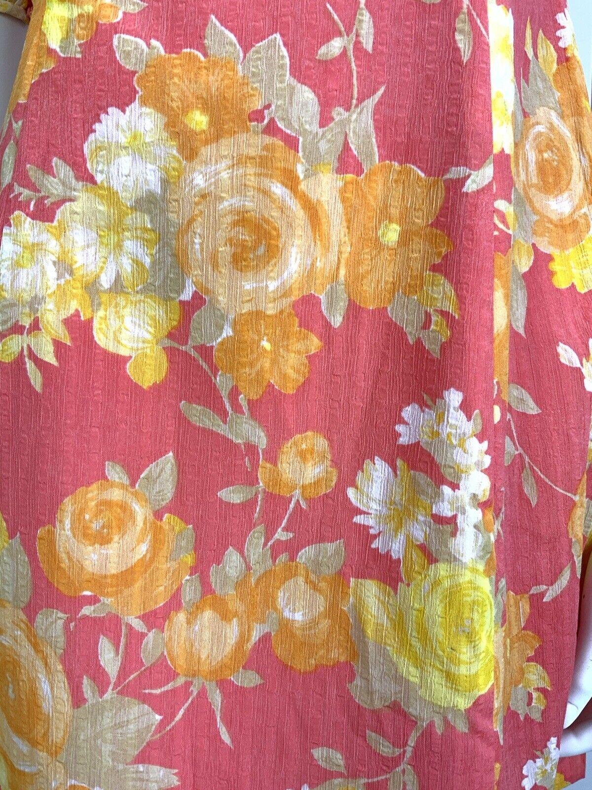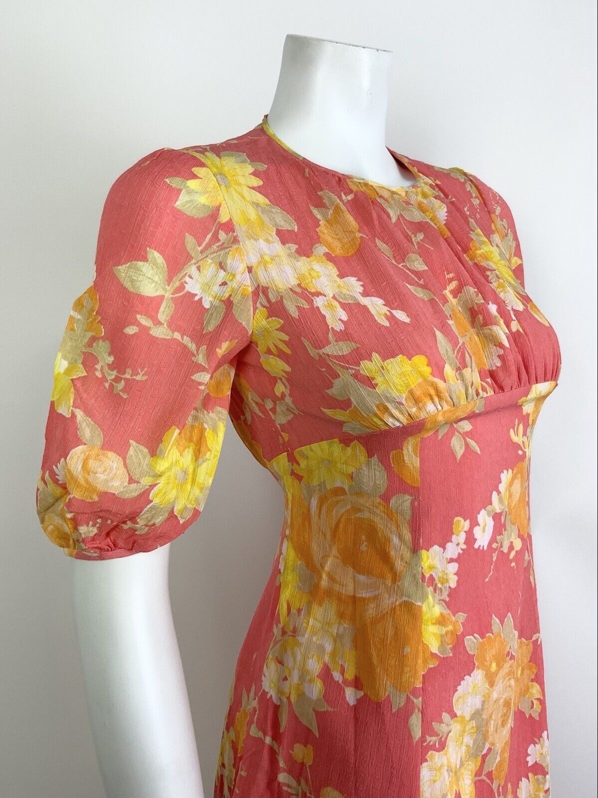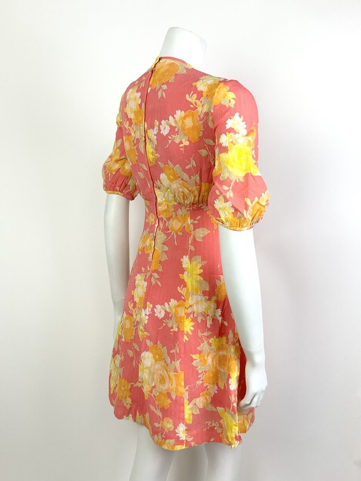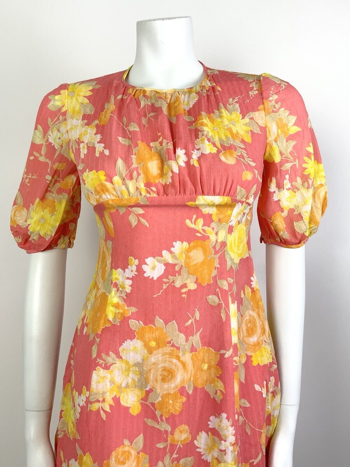VINTAGE 60s 70s PINK YELLOW ORANGE FLORAL PUFF SLEEVE MOD EMPIRE LINE DRESS 8