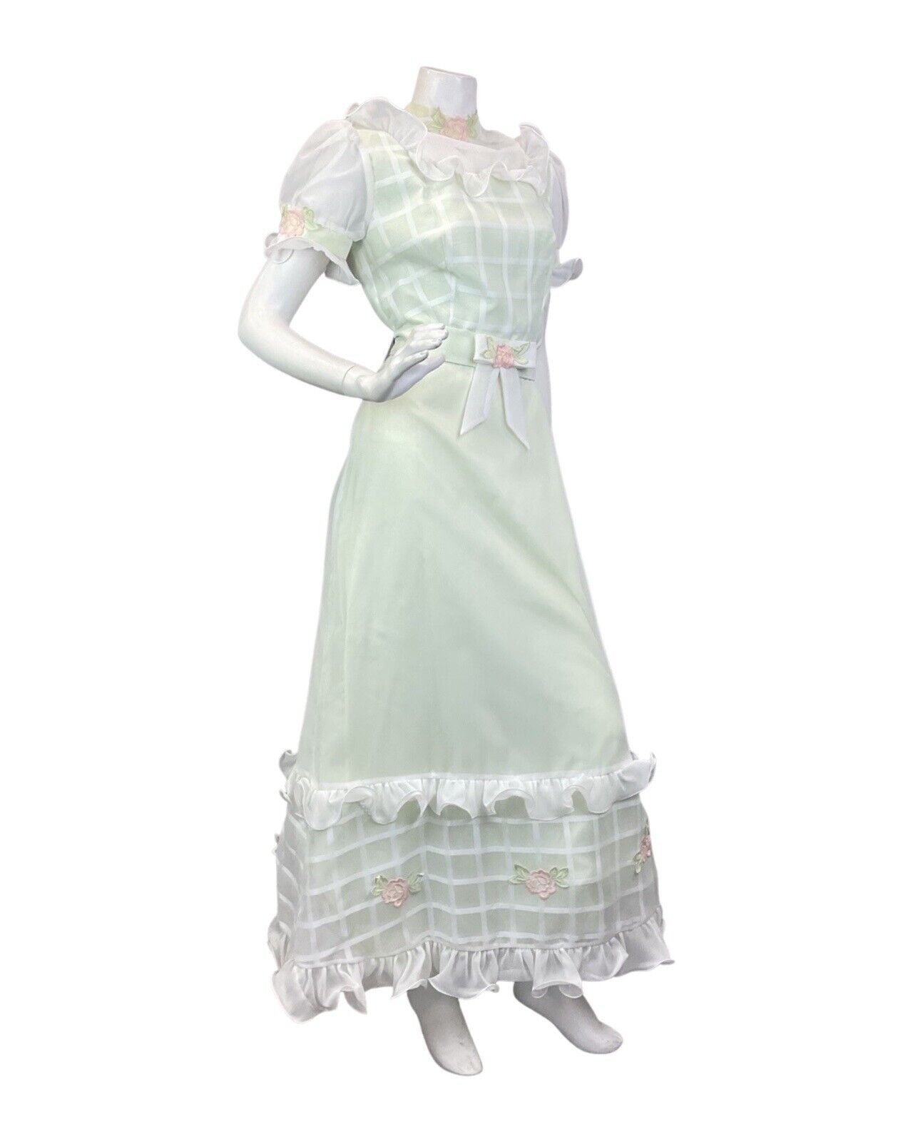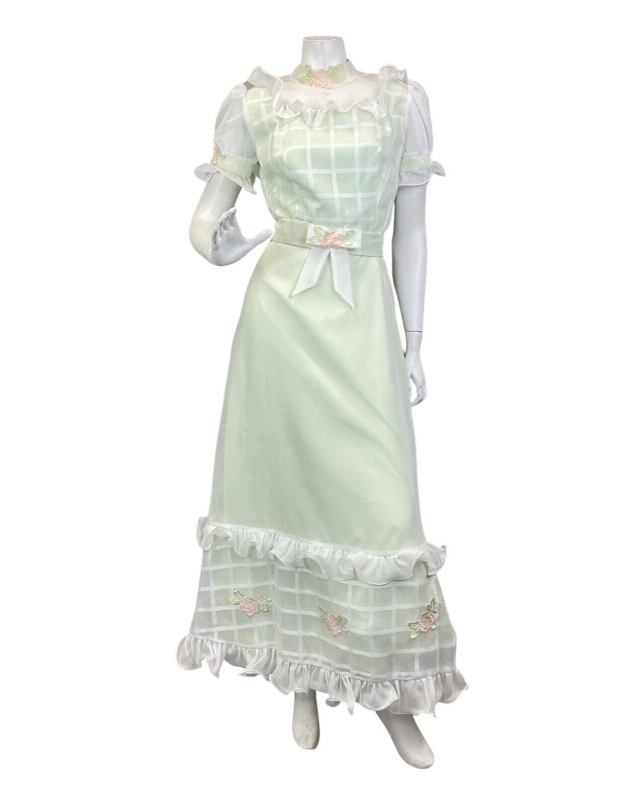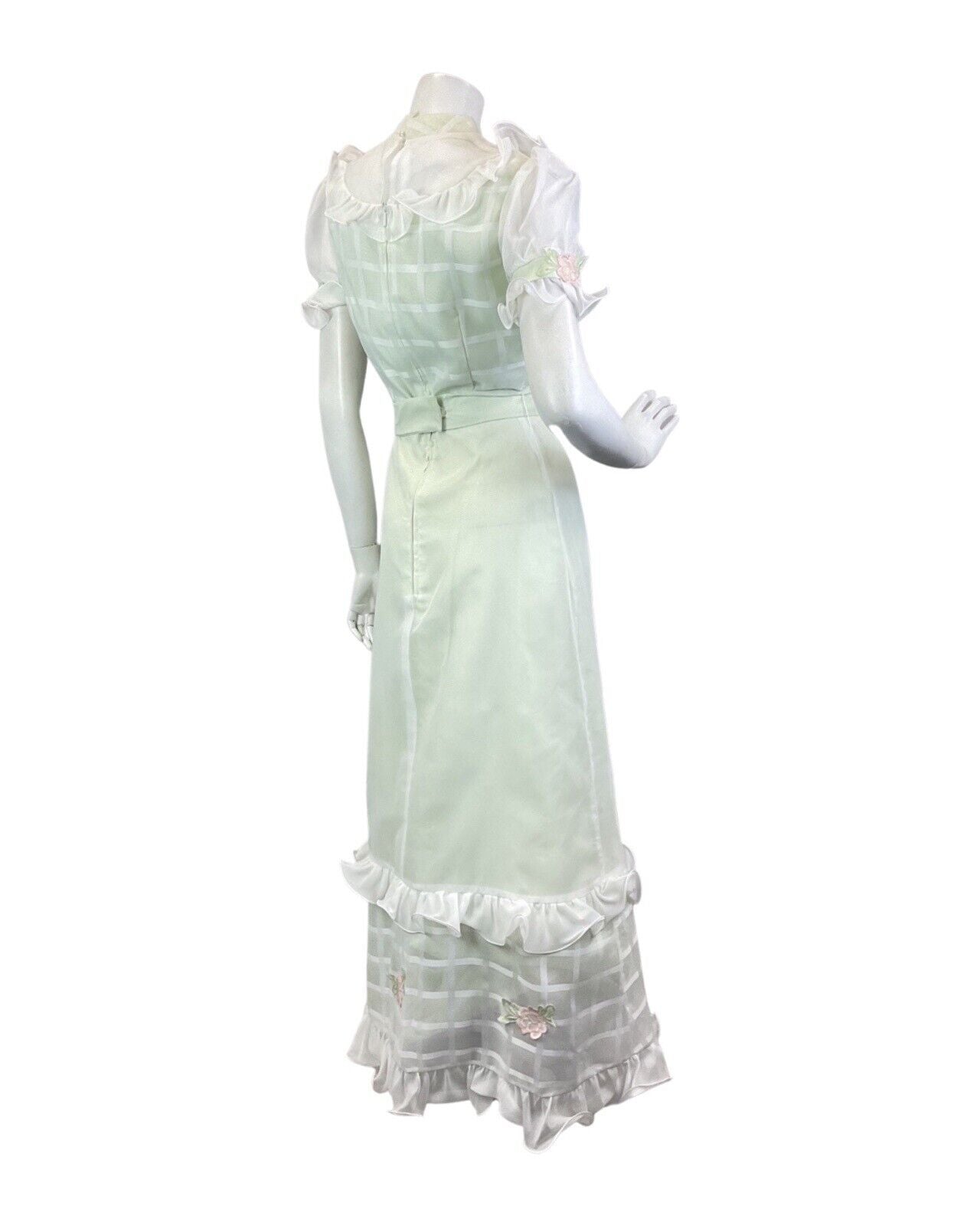 VINTAGE 60s 70s PISTACHIO GREEN WHITE RUFFLED ROSE SHEER PRAIRIE MAXI DRESS 8