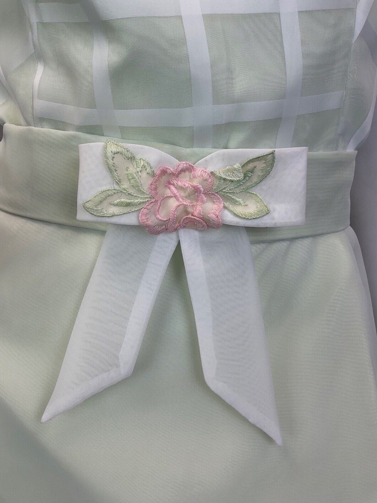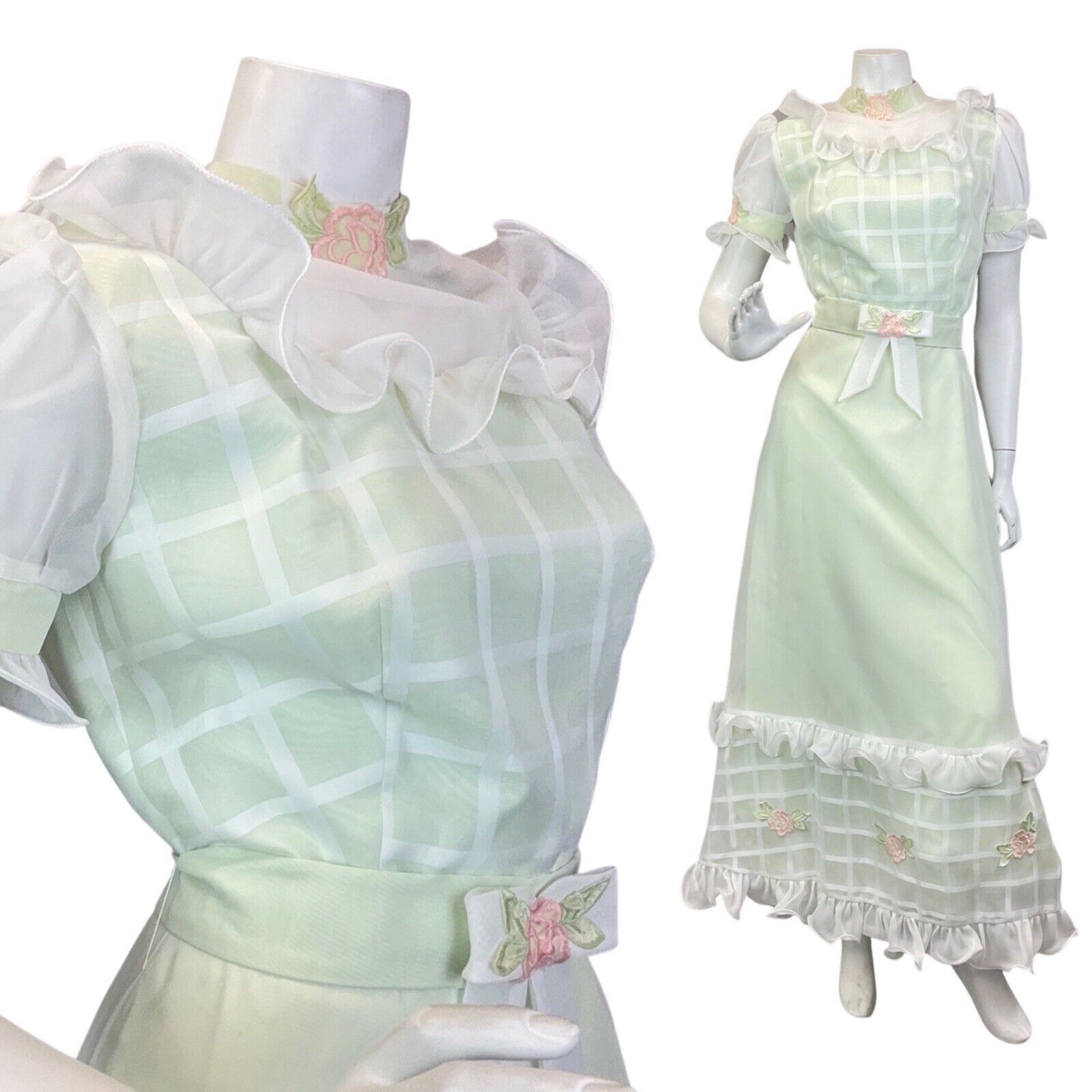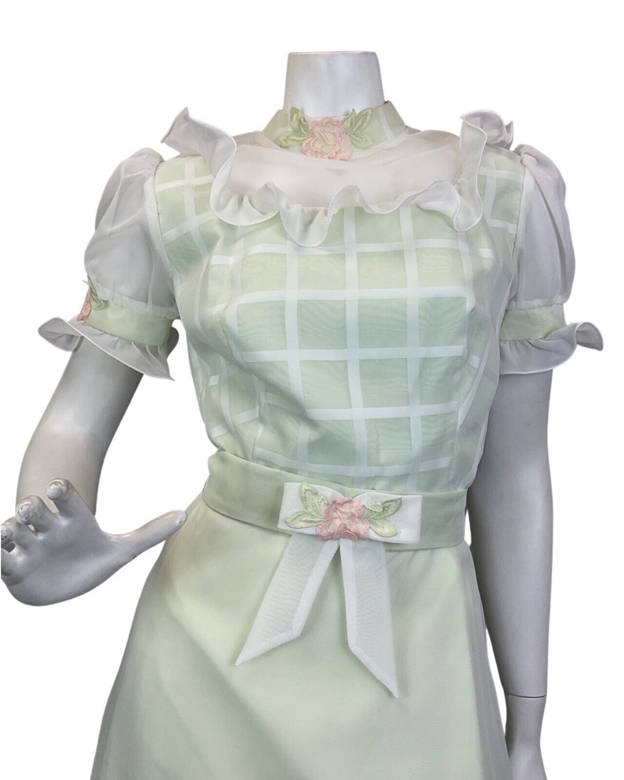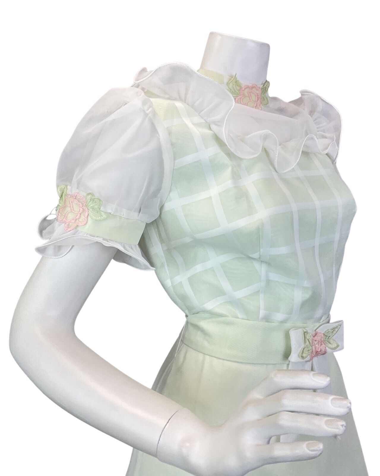 VINTAGE 60s 70s PISTACHIO GREEN WHITE RUFFLED ROSE SHEER PRAIRIE MAXI DRESS 8