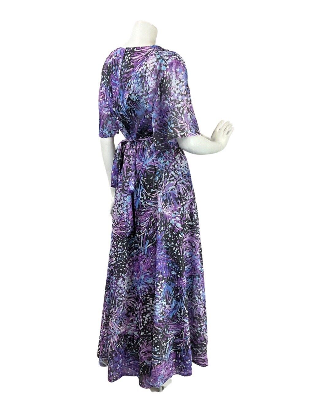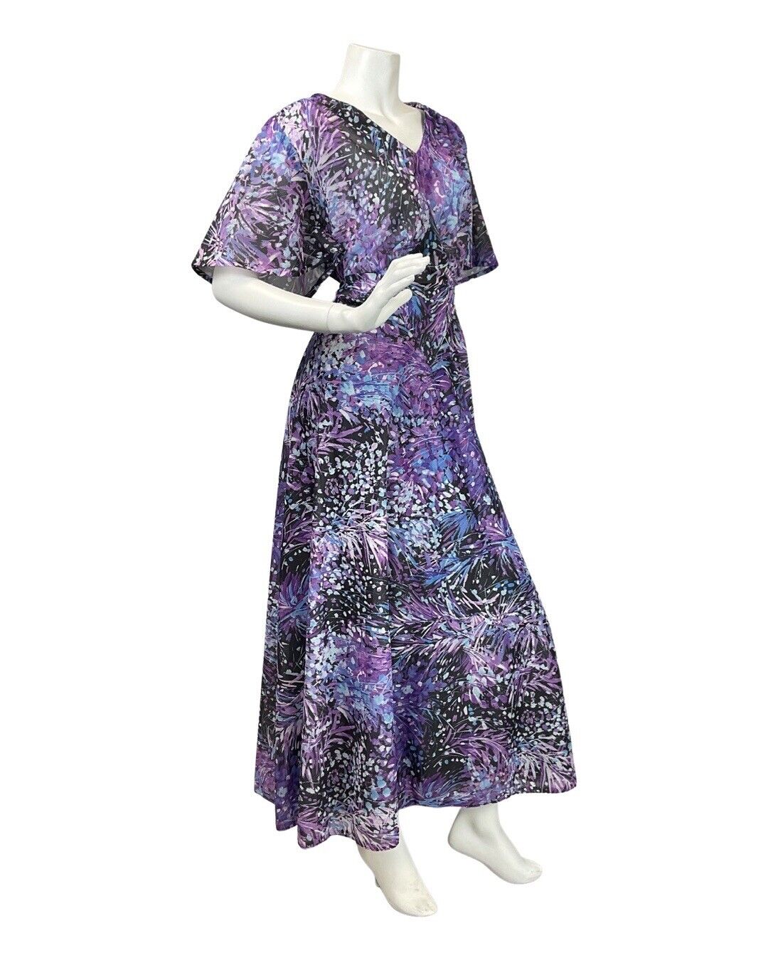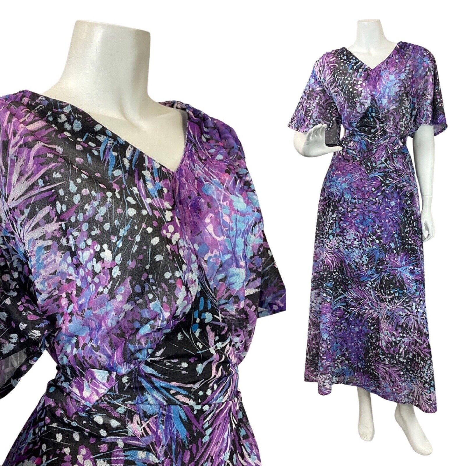 VINTAGE 60s 70s PURPLE BLUE BLACK PSYCHEDELIC FLORAL SHEER MAXI DRESS 18 20