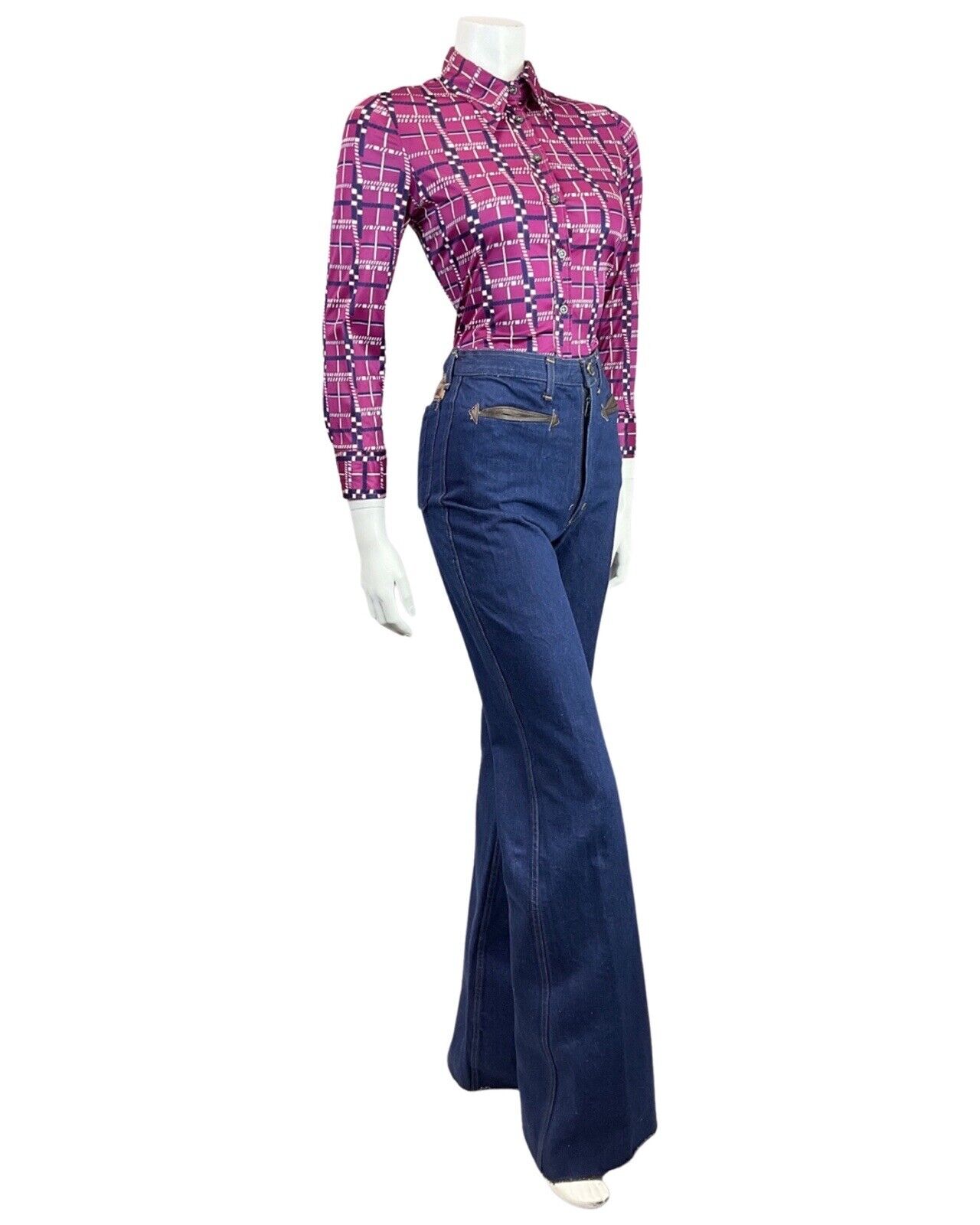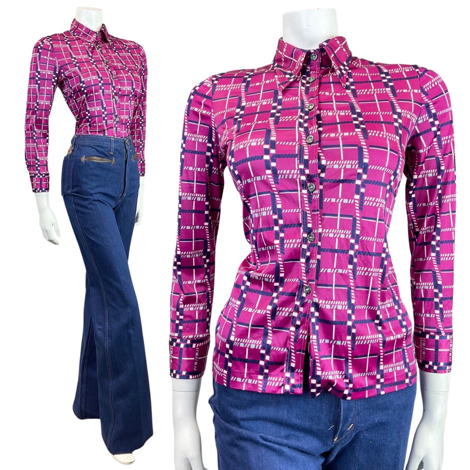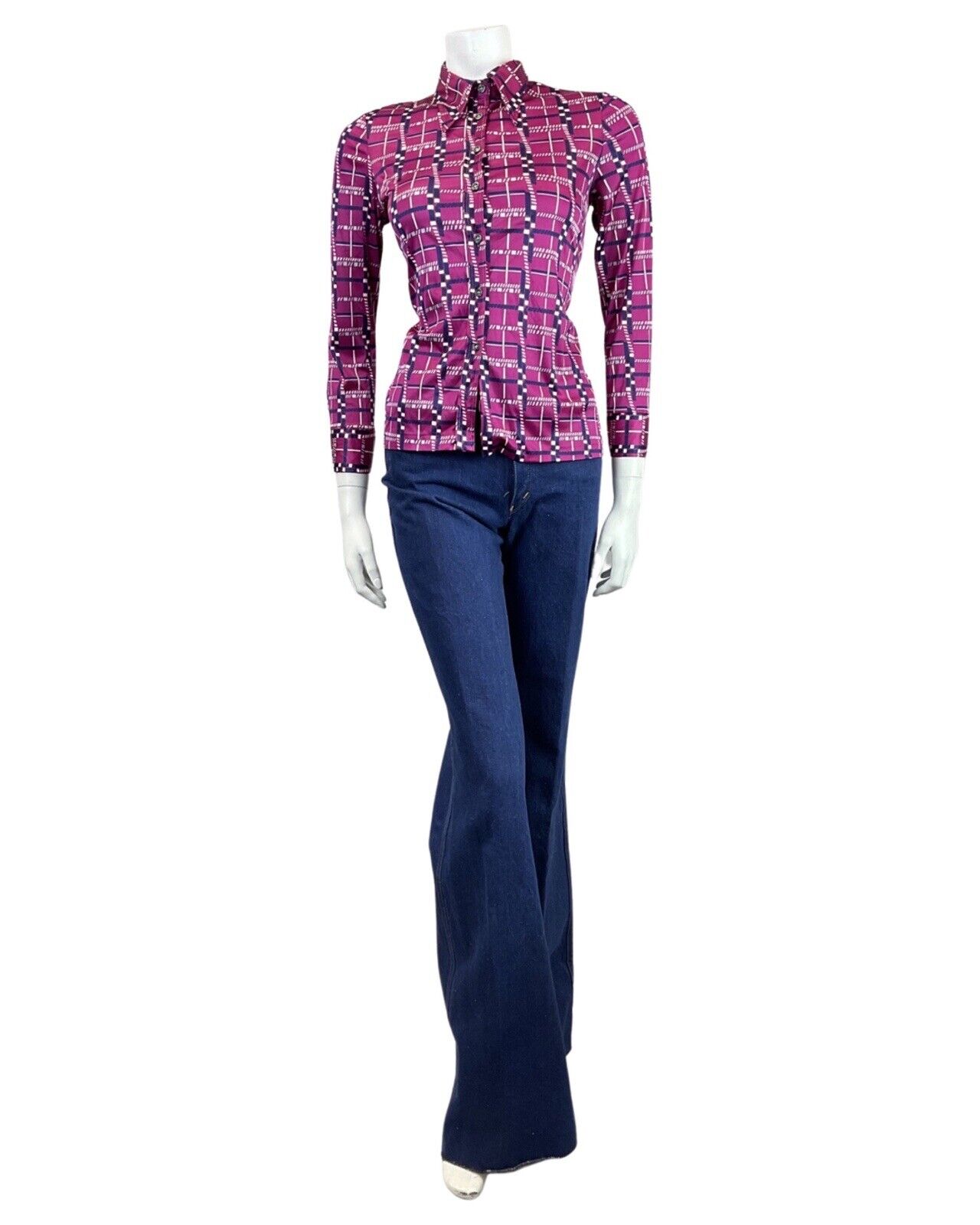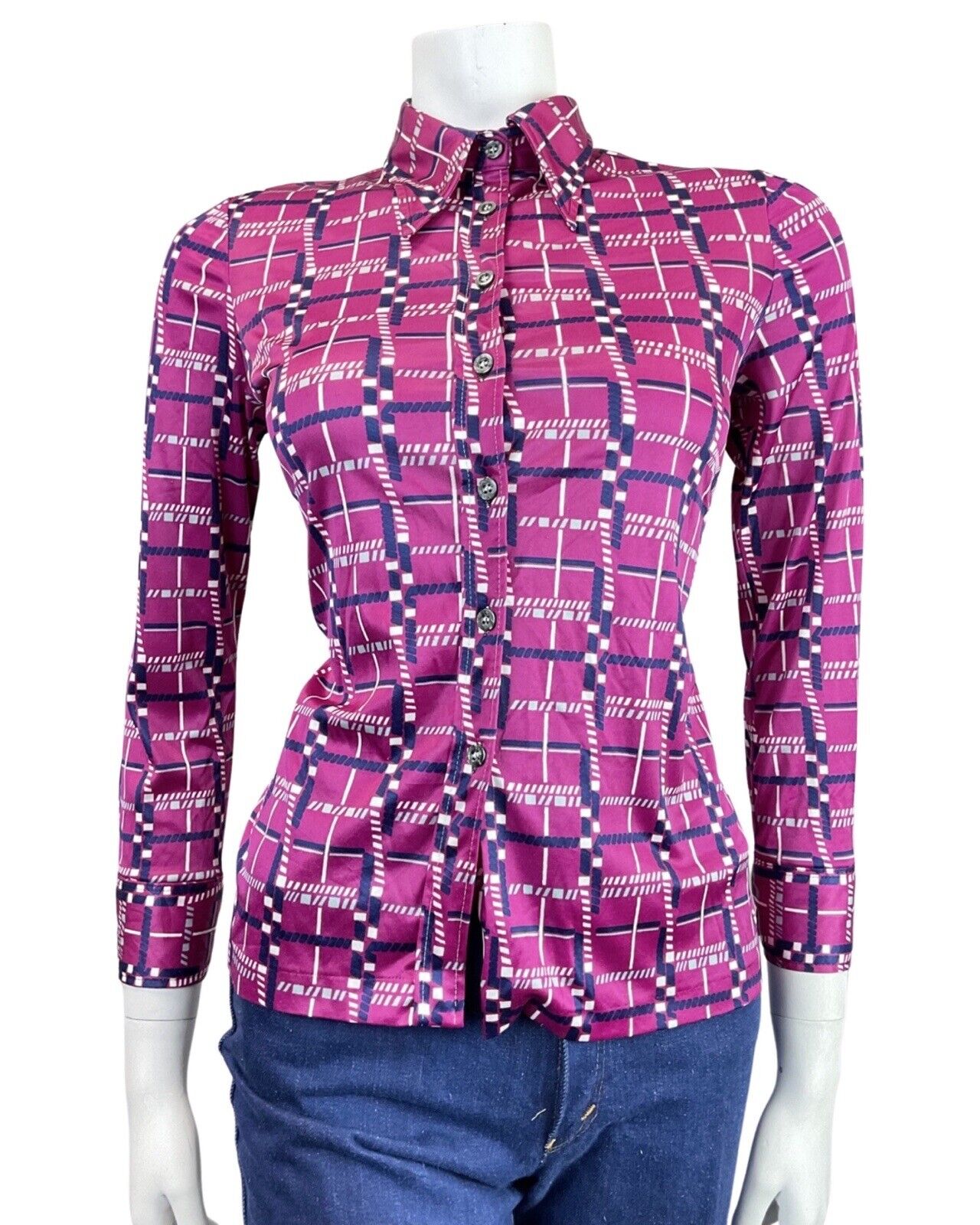 VINTAGE 60s 70s PURPLE BLUE WHITE GRID CHECKED MOD DAGGER SHIRT BLOUSE 10 12