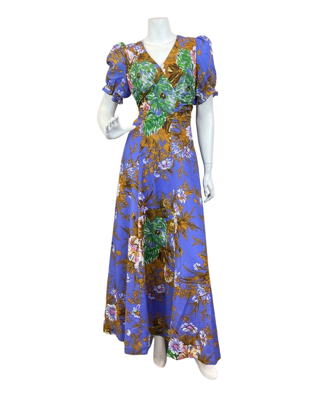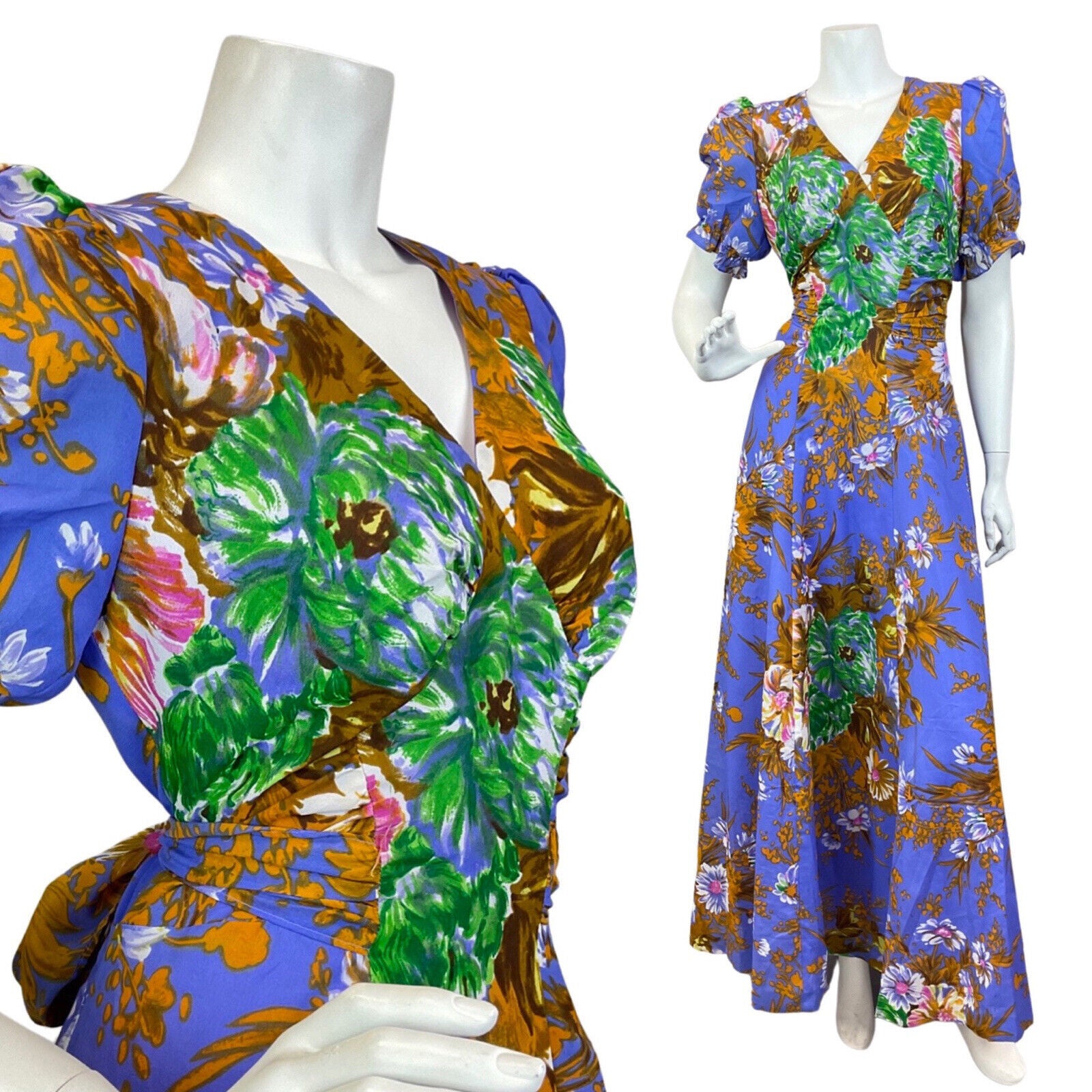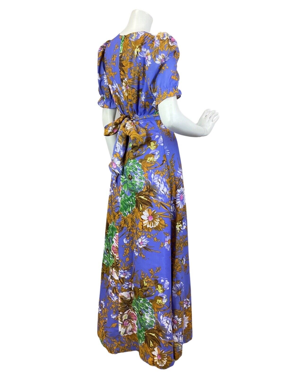 VINTAGE 60s 70s PURPLE GOLD GREEN FLORAL PUFF SLEEVE SUMMER MAXI DRESS 8 10