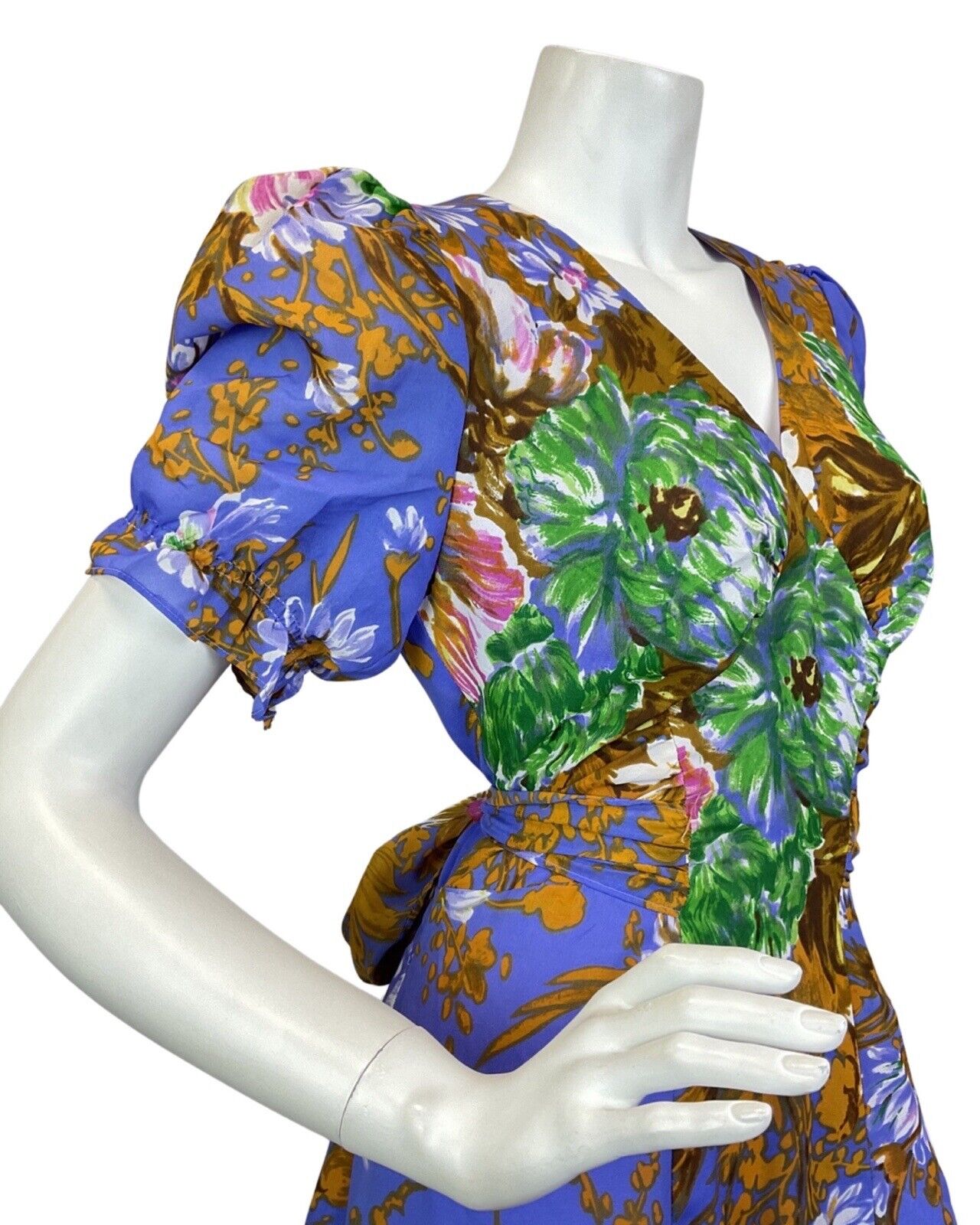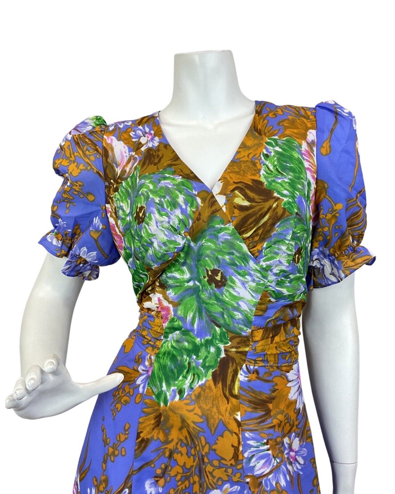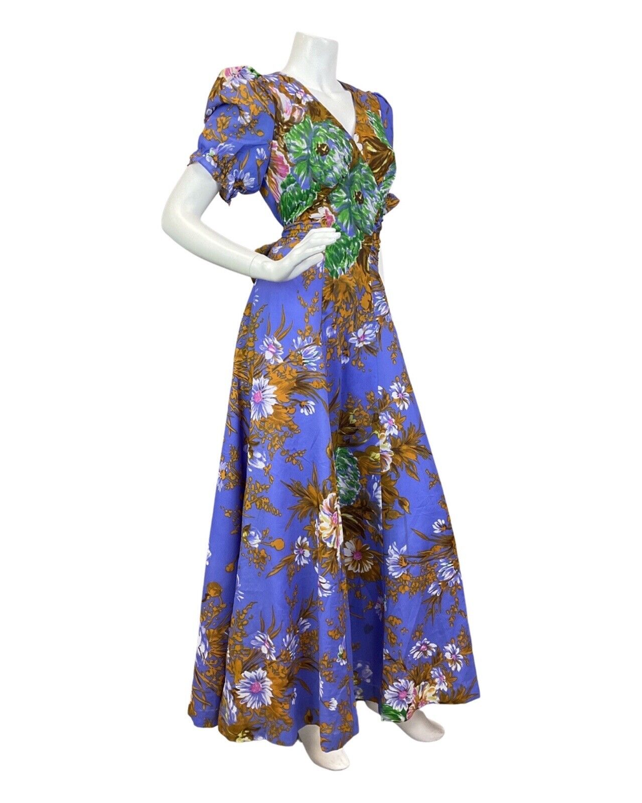 VINTAGE 60s 70s PURPLE GOLD GREEN FLORAL PUFF SLEEVE SUMMER MAXI DRESS 8 10