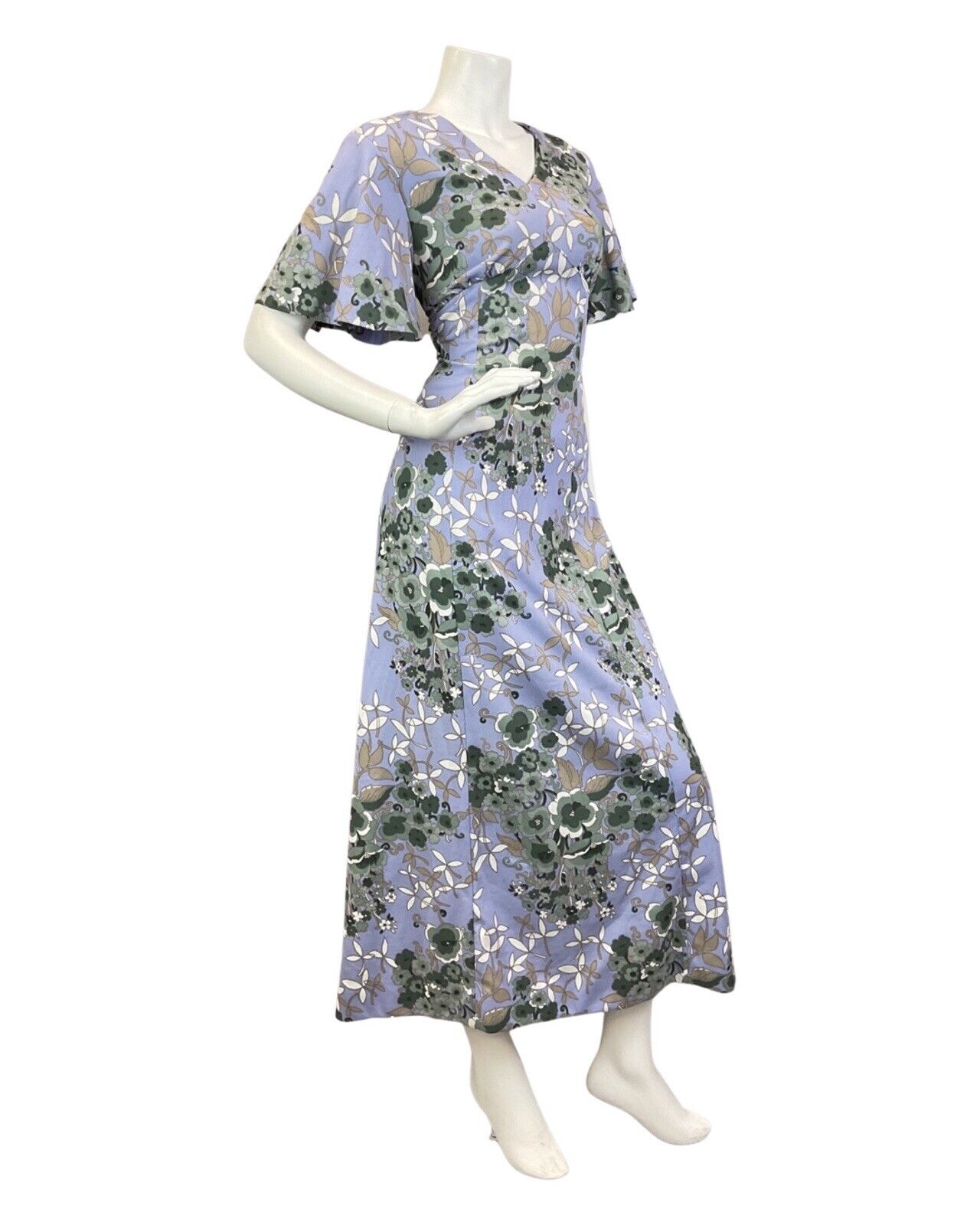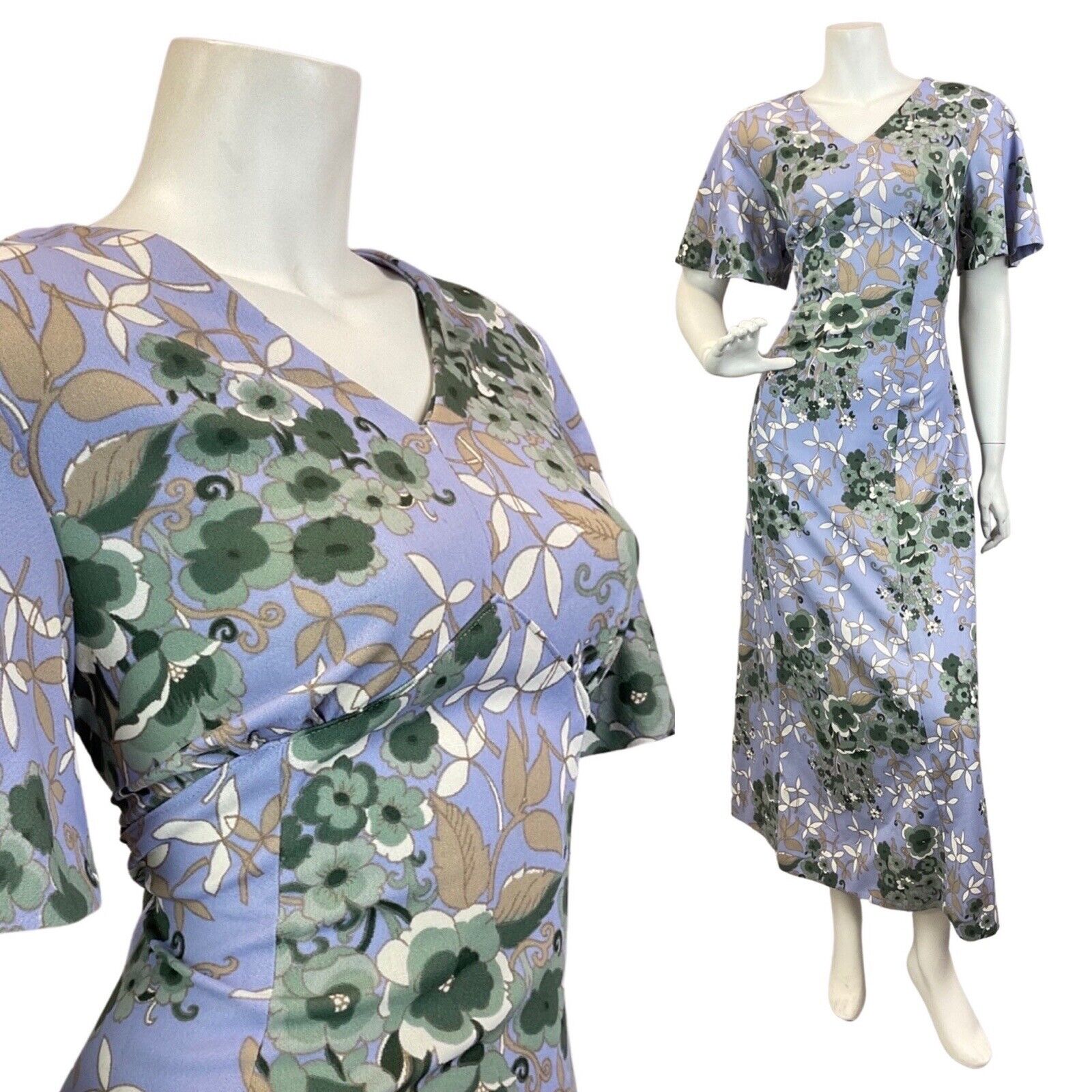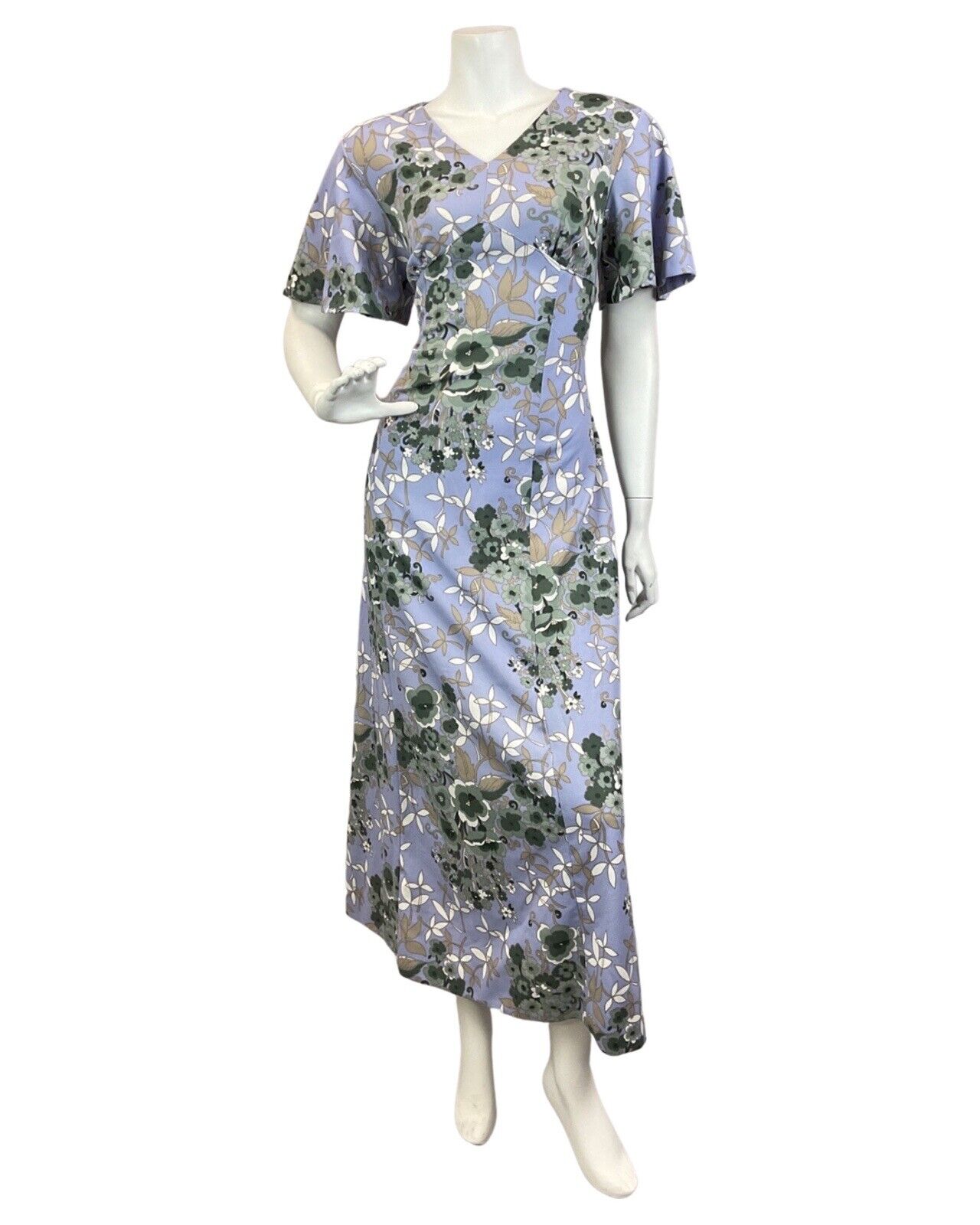 VINTAGE 60s 70s PURPLE GREEN FLORAL BELL SLEEVE MAXI DRESS 12