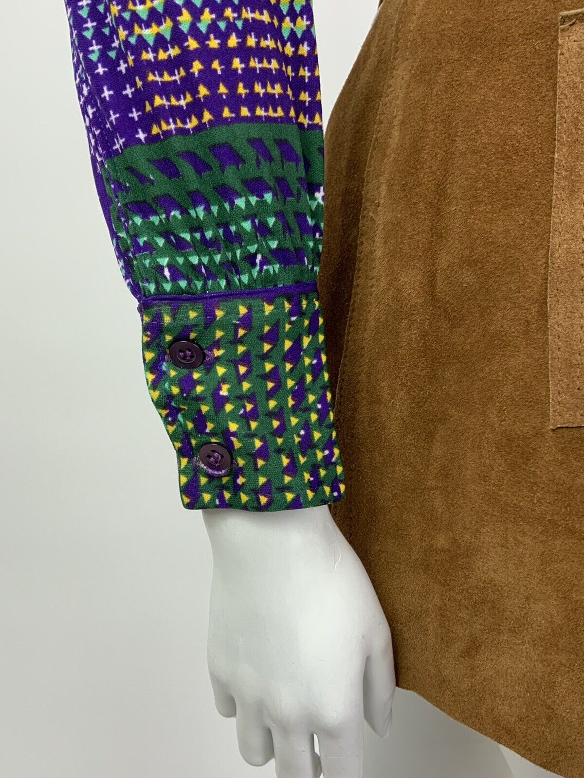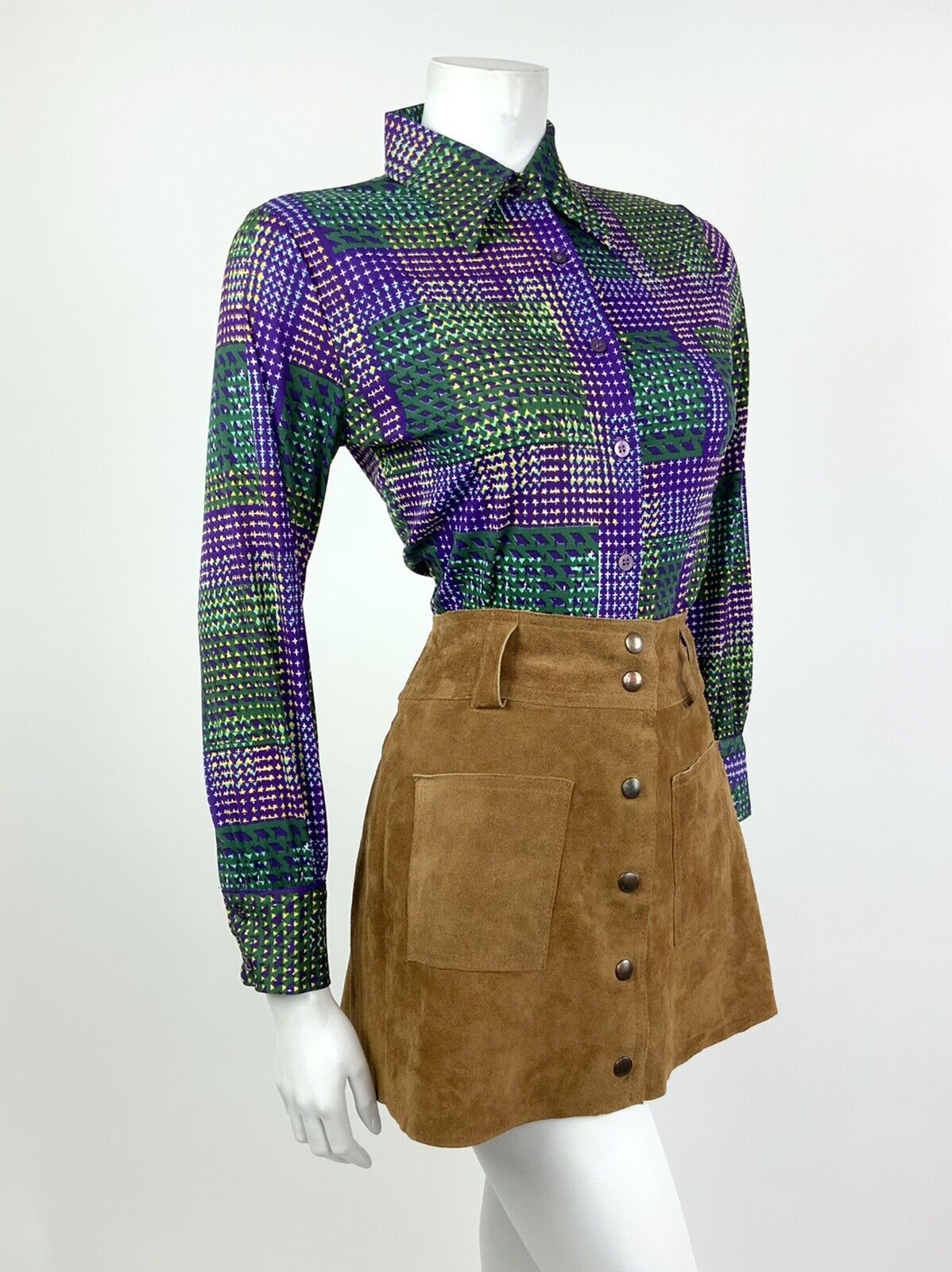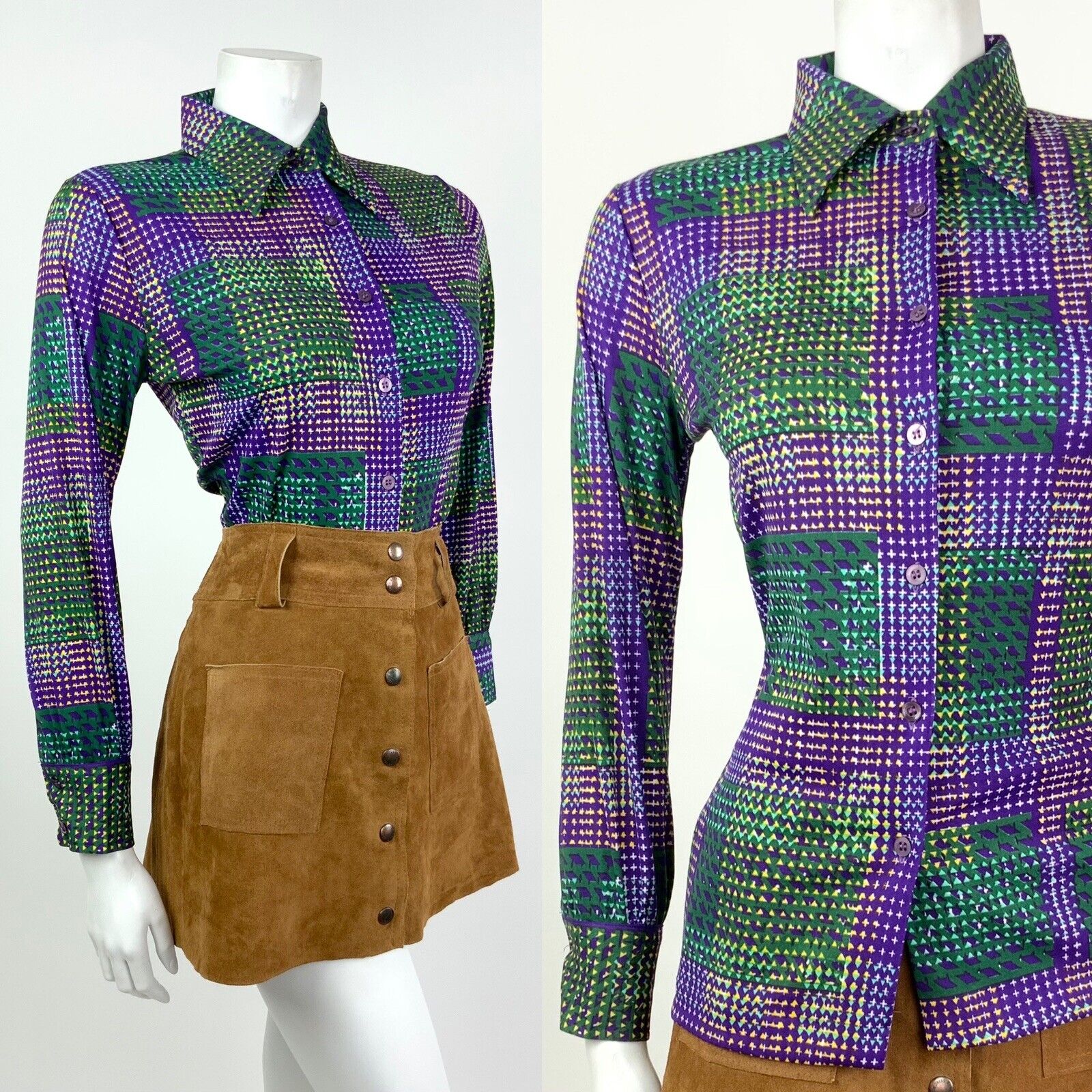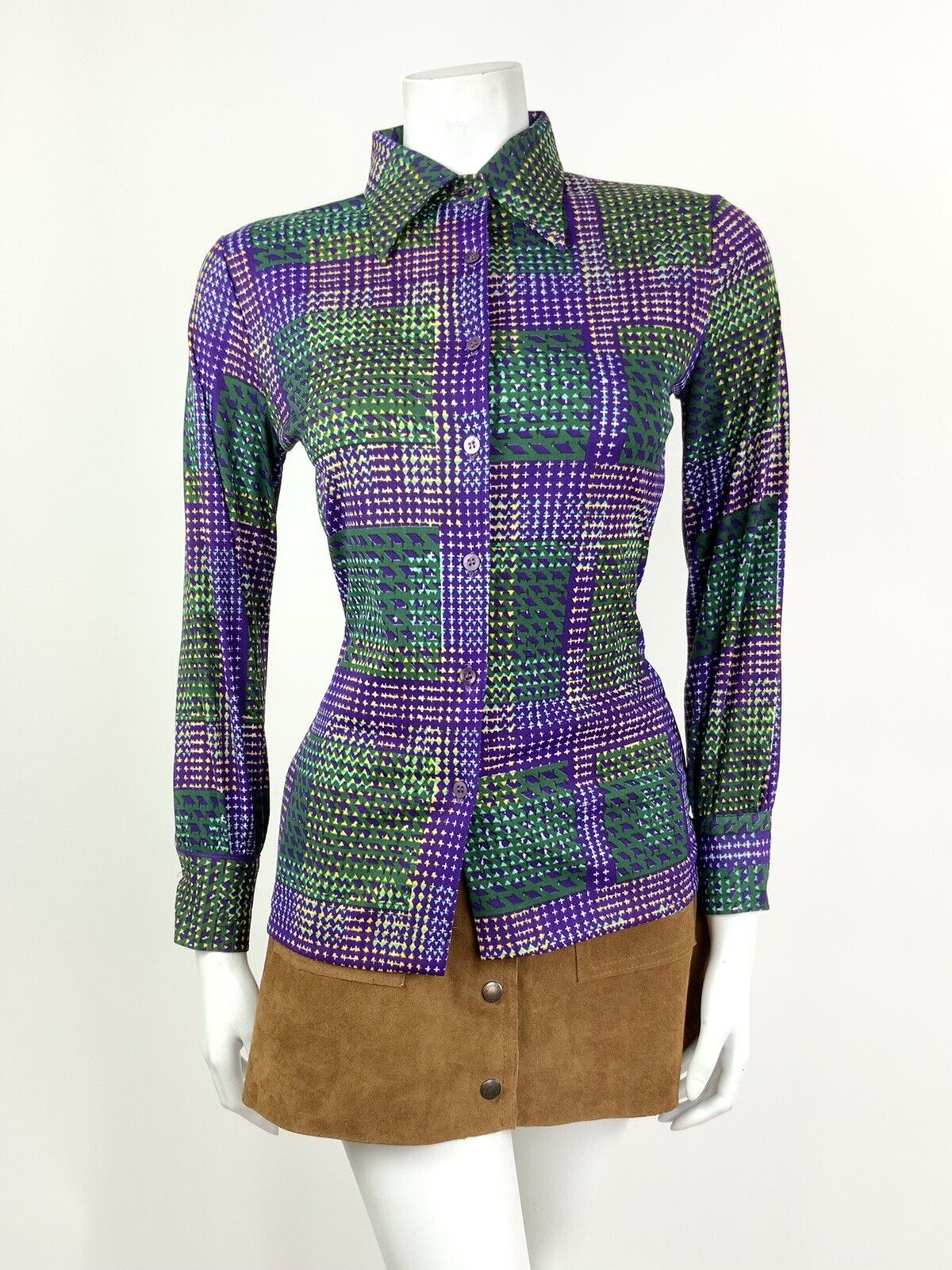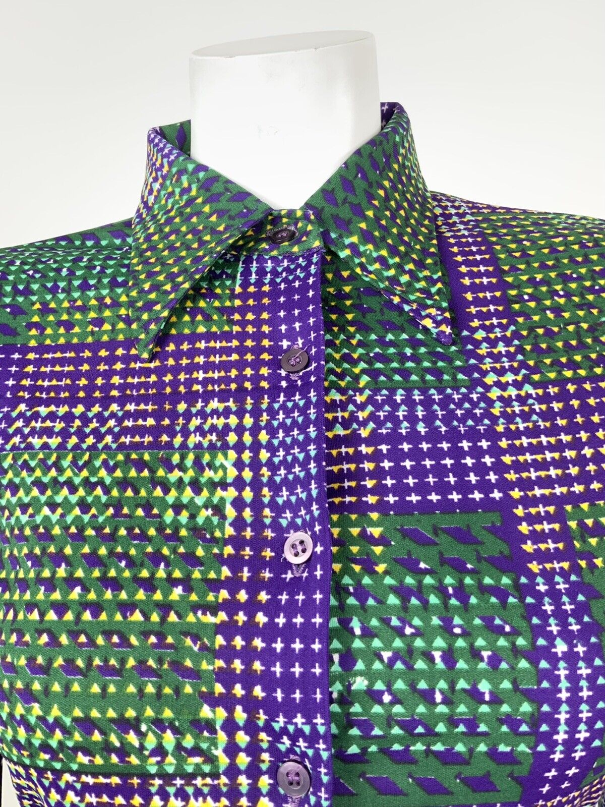 VINTAGE 60s 70s PURPLE GREEN YELLOW WHITE CHECKERED PLAID DAGGER SHIRT 8 10