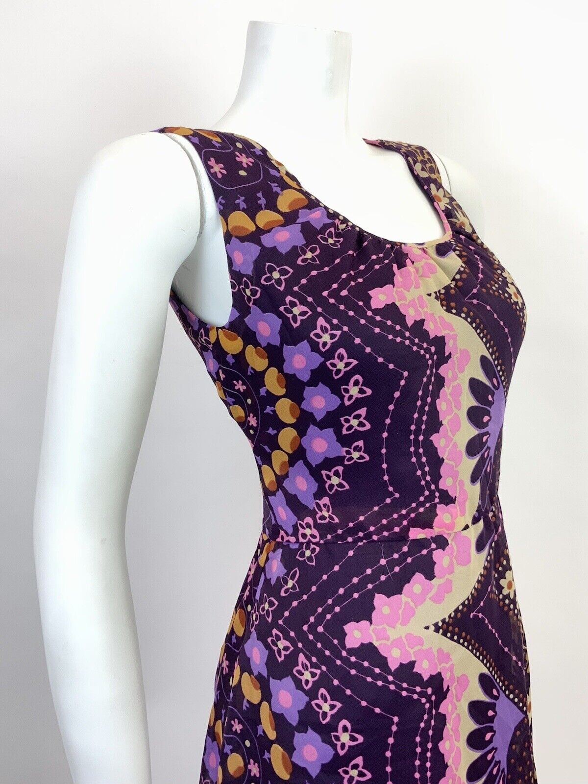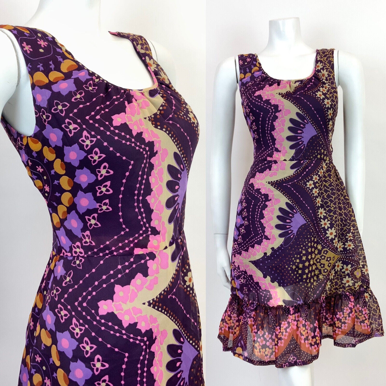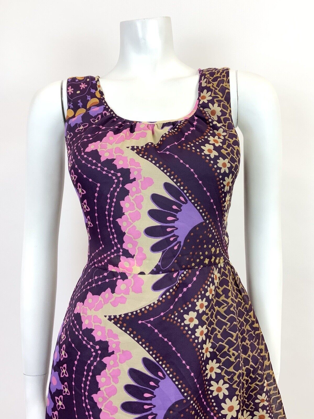 VINTAGE 60s 70s PURPLE PINK CREAM PSYCHEDELIC FLORAL SHEER MOD DRESS 10