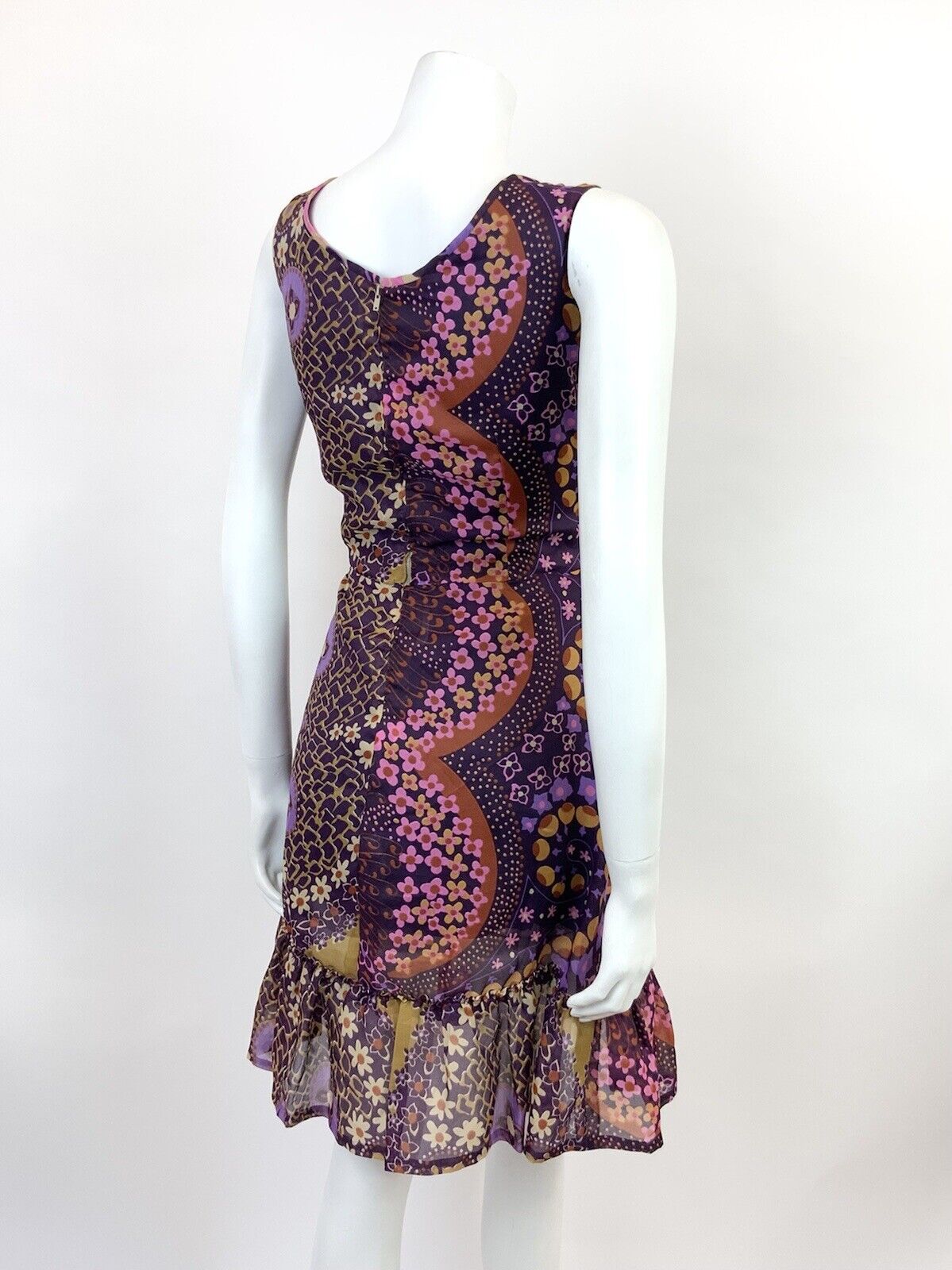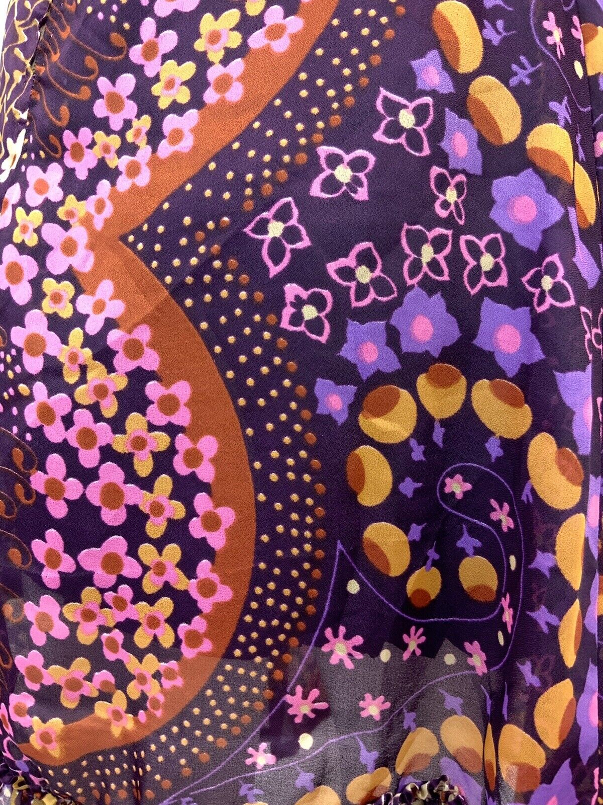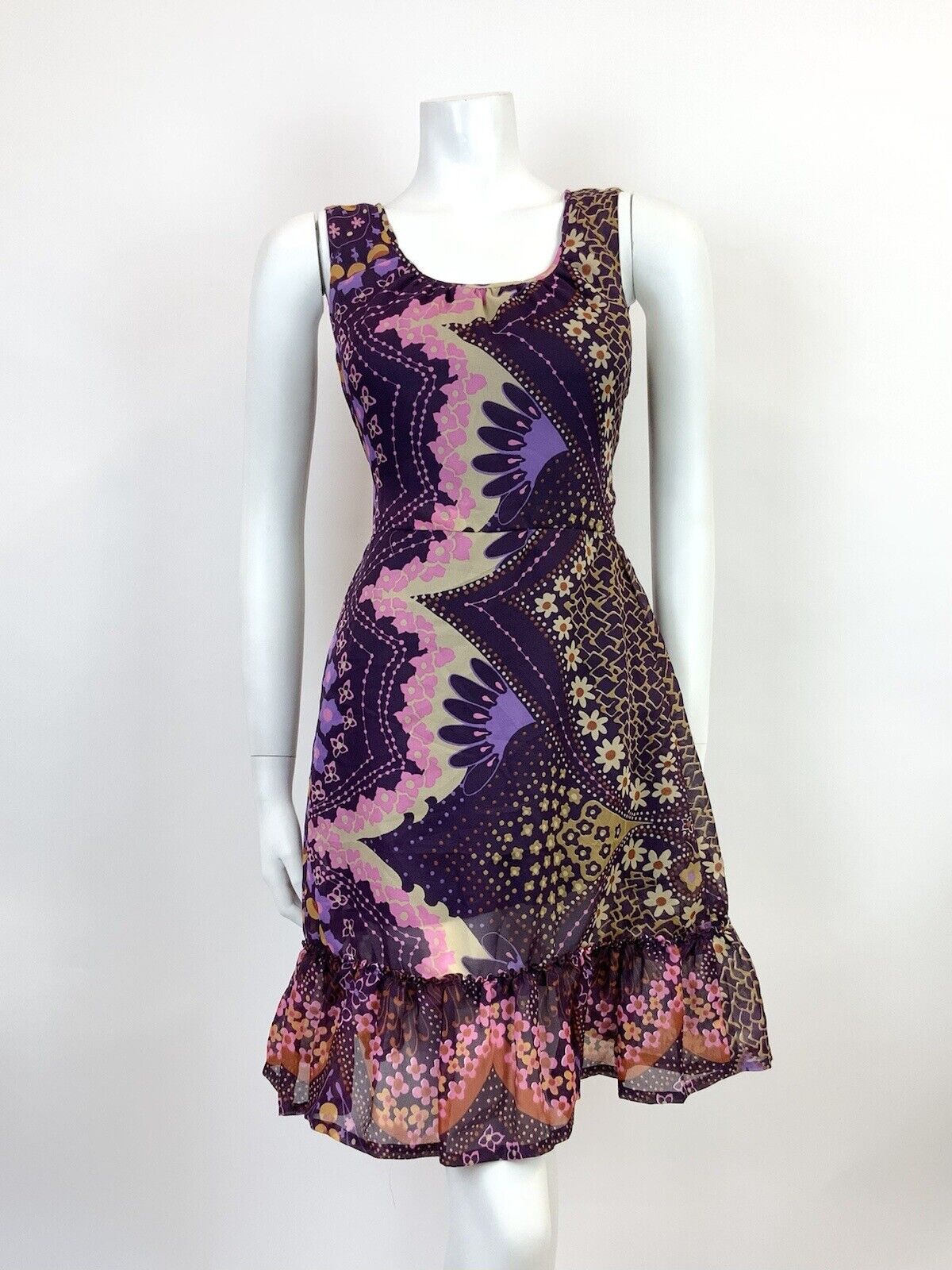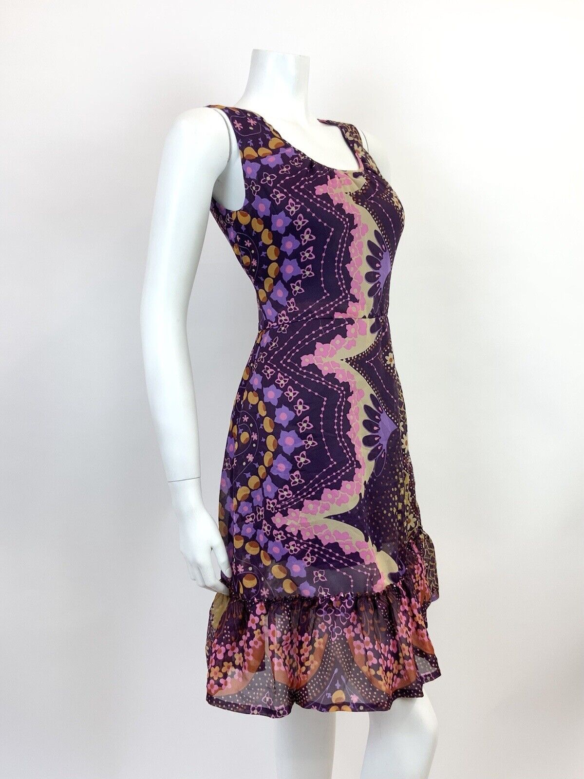 VINTAGE 60s 70s PURPLE PINK CREAM PSYCHEDELIC FLORAL SHEER MOD DRESS 10