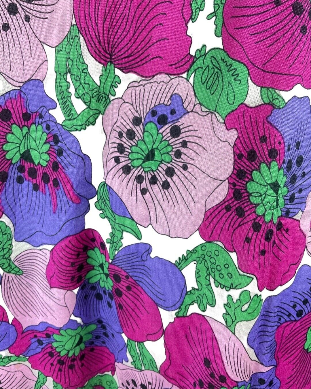 Covering the fabric is a bold floral pattern in bright tones of purple, pink, green, and black.