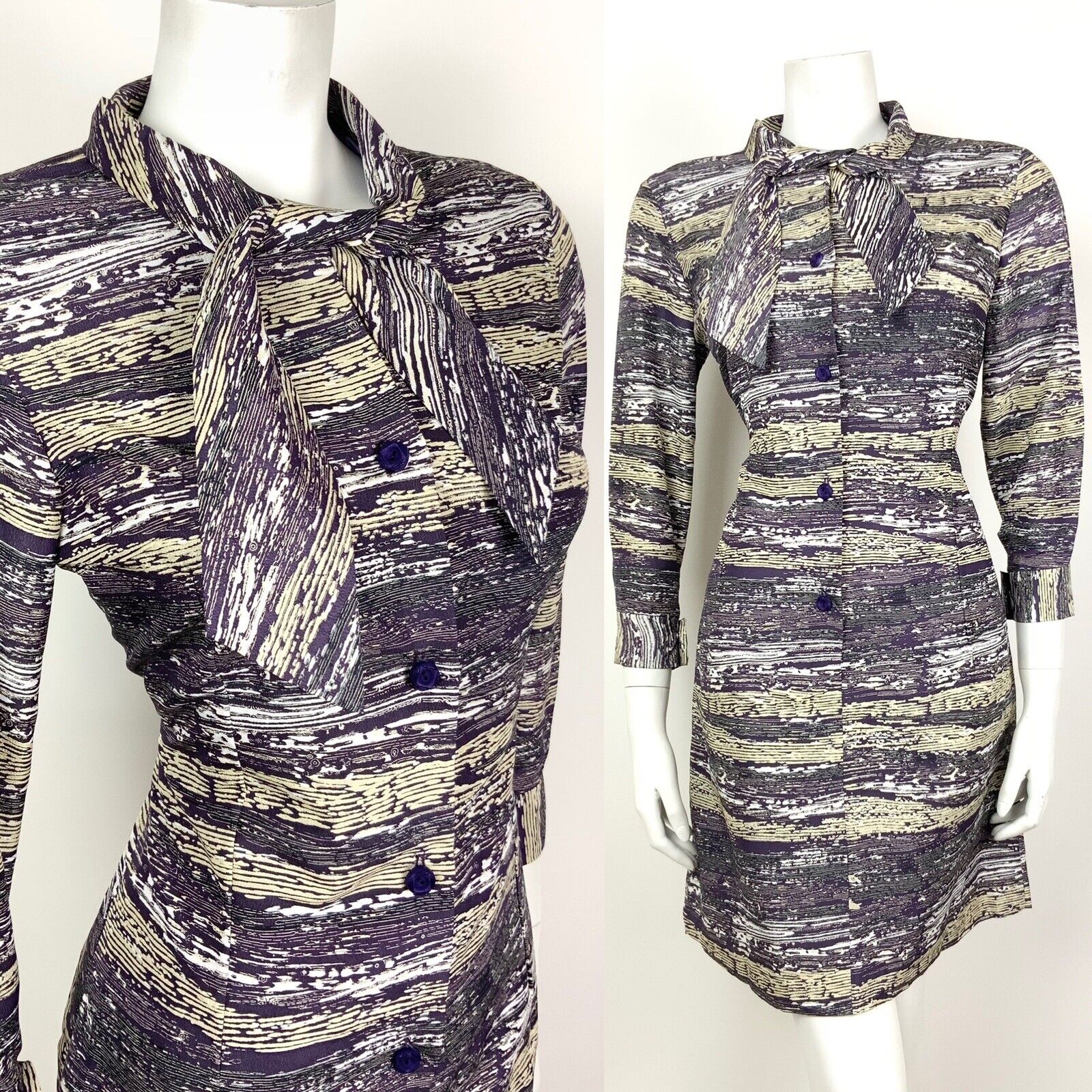 VINTAGE 60s 70s PURPLE WHITE BLACK GOLD GRAIN STRIPED BOW SHORT DRESS 12 14