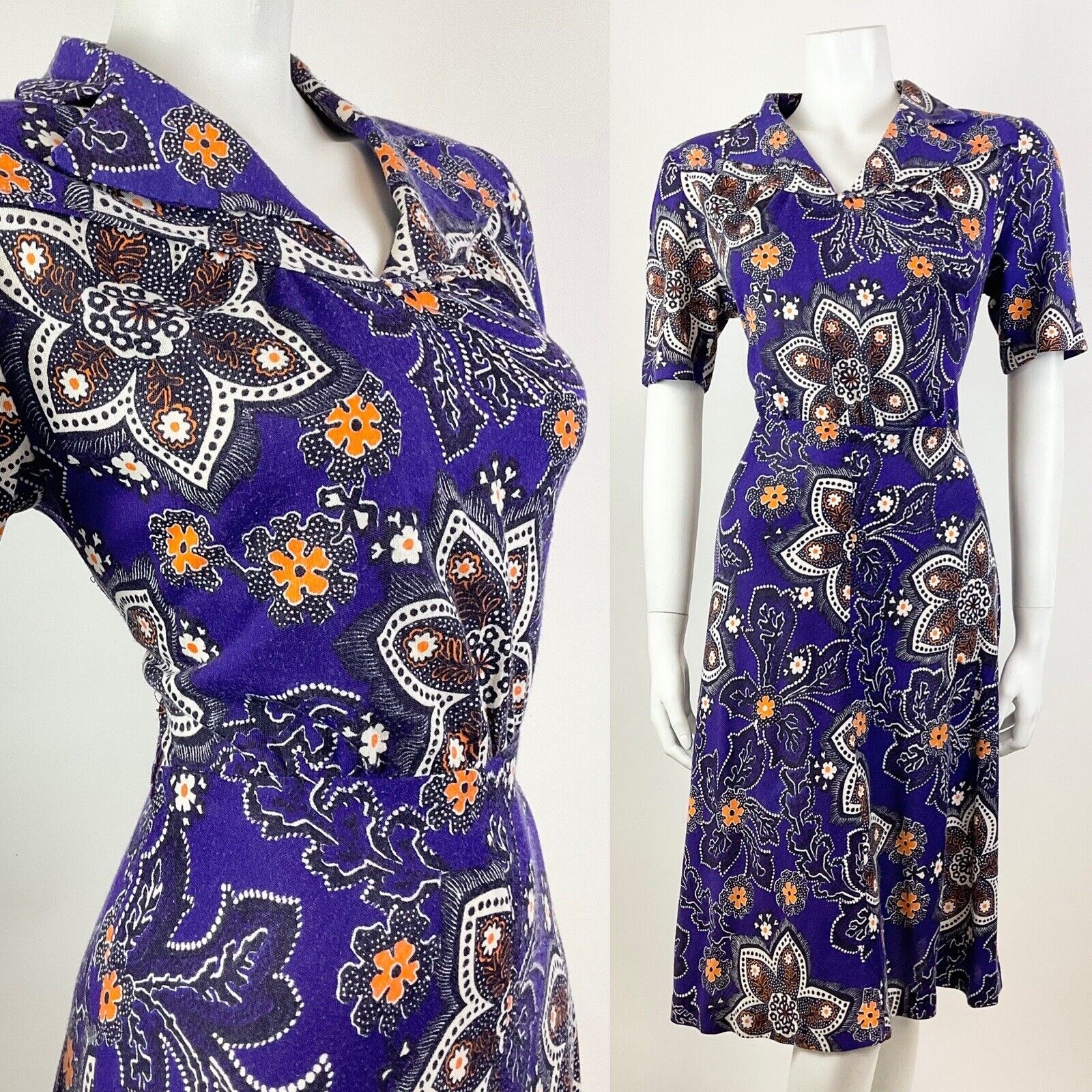 VINTAGE 60s 70s PURPLE WHITE ORANGE PSYCHEDELIC FLORAL DOTTY SHIRT DRESS 12