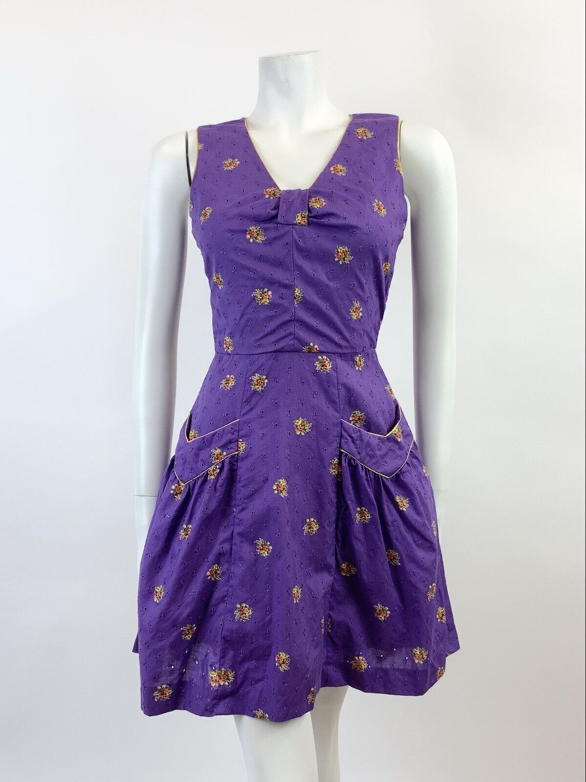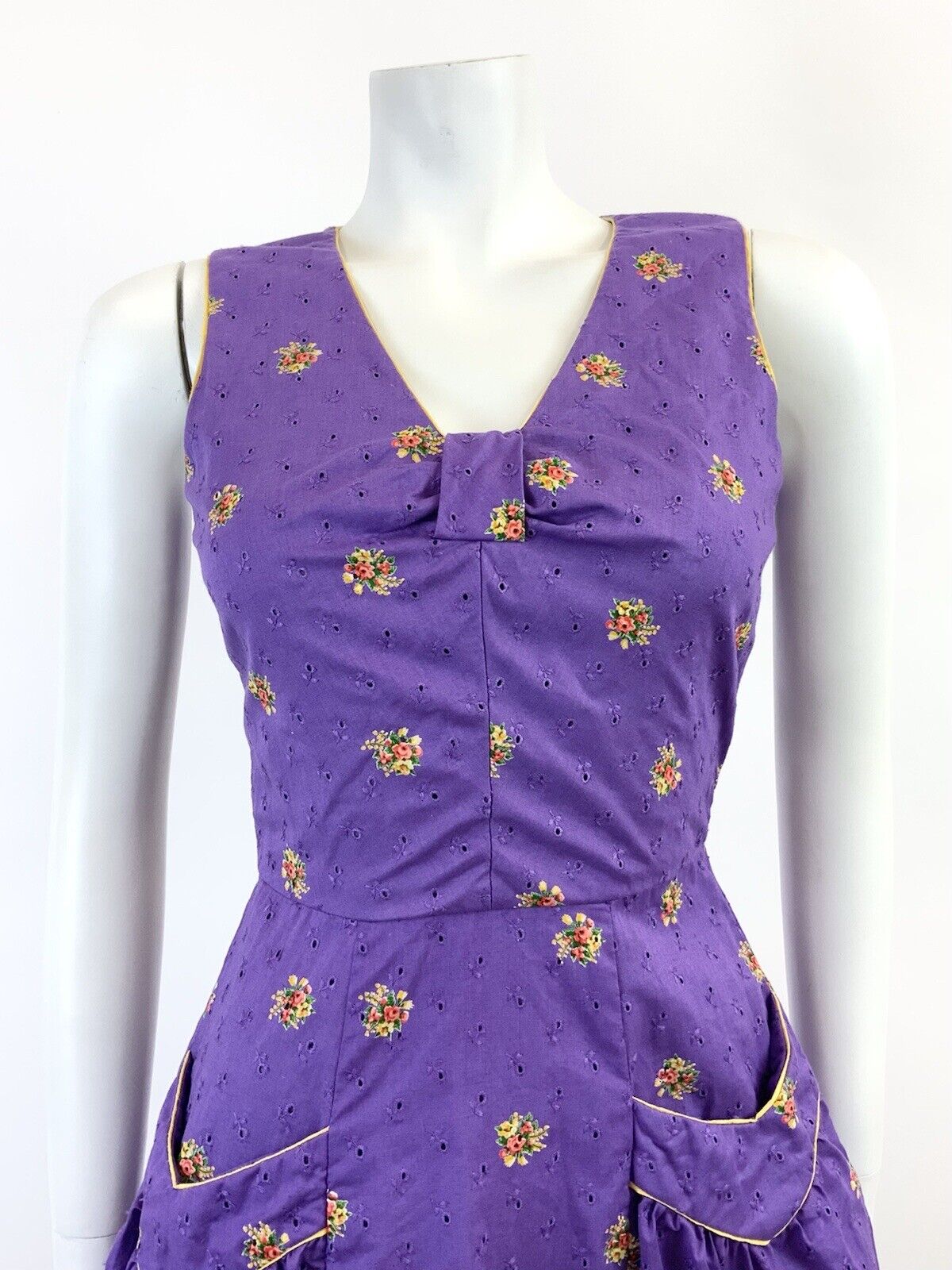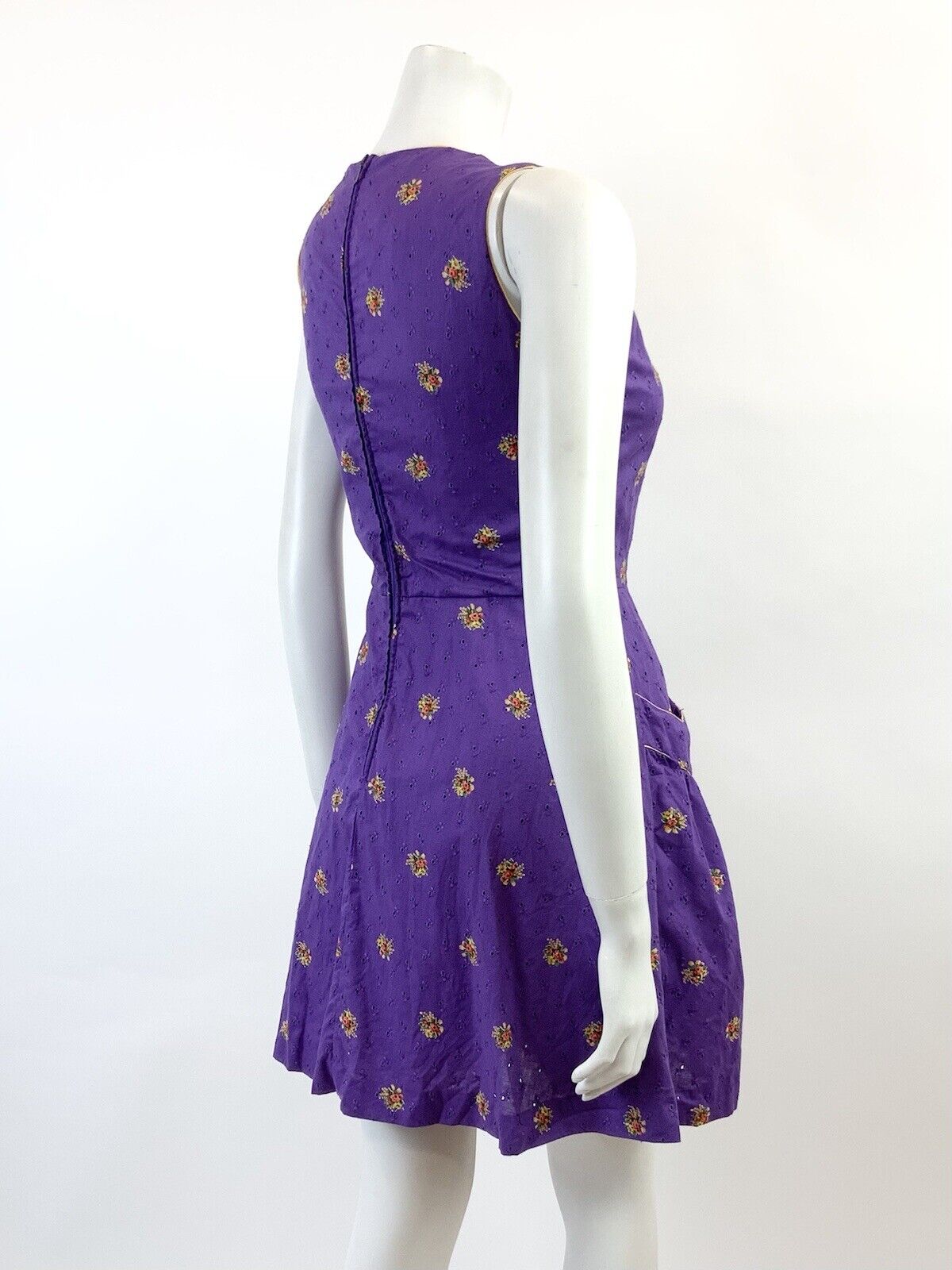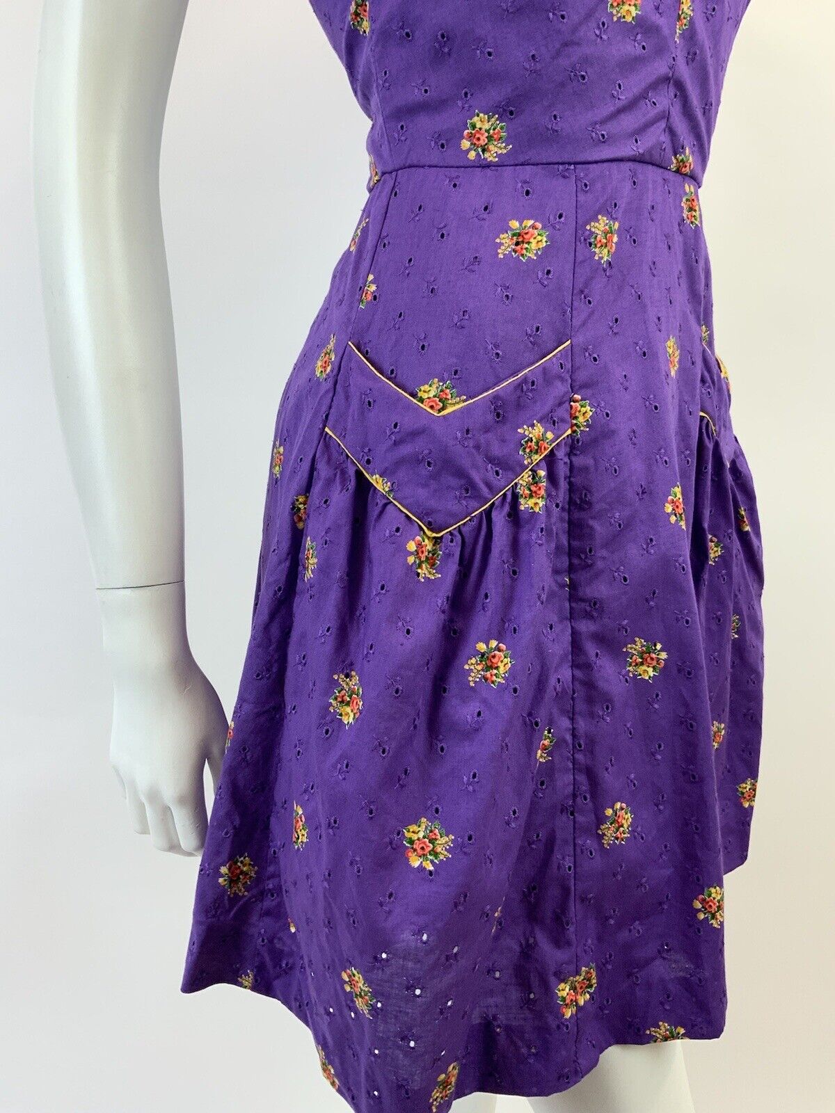 VINTAGE 60s 70s PURPLE YELLOW ANGLAISE EMBROIDERED FLORAL ROSE MOD DRESS 8