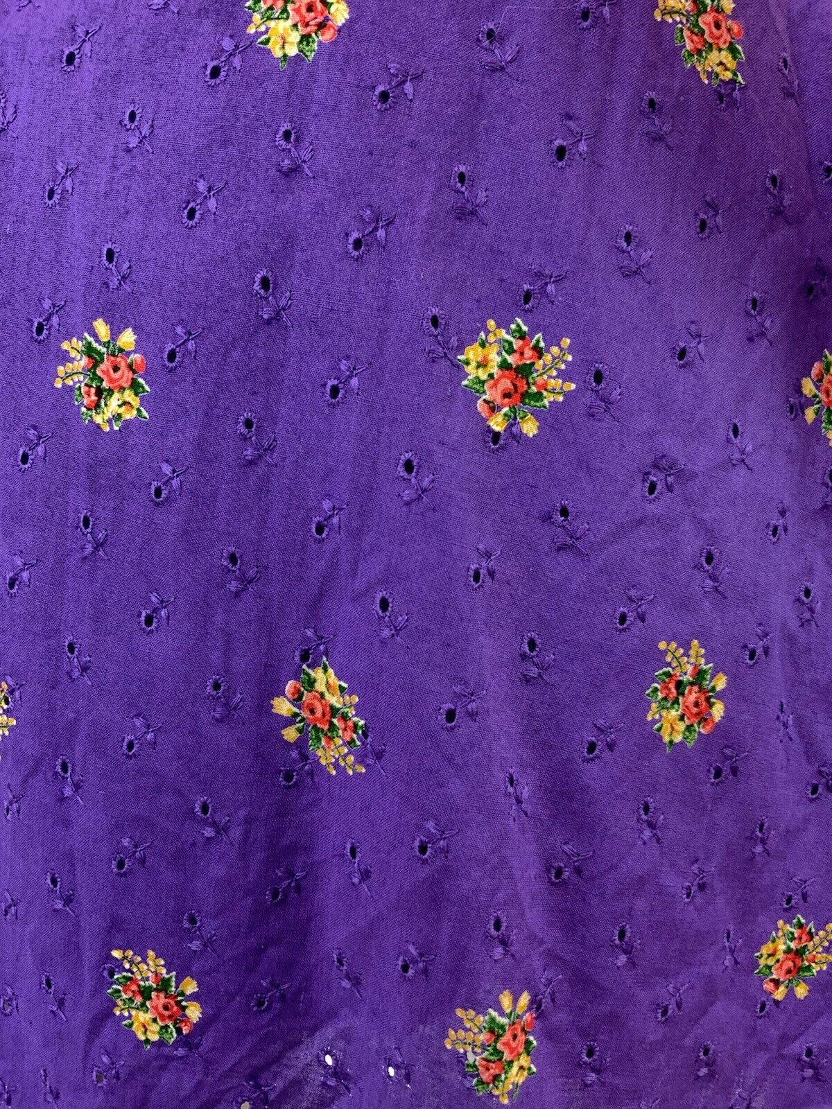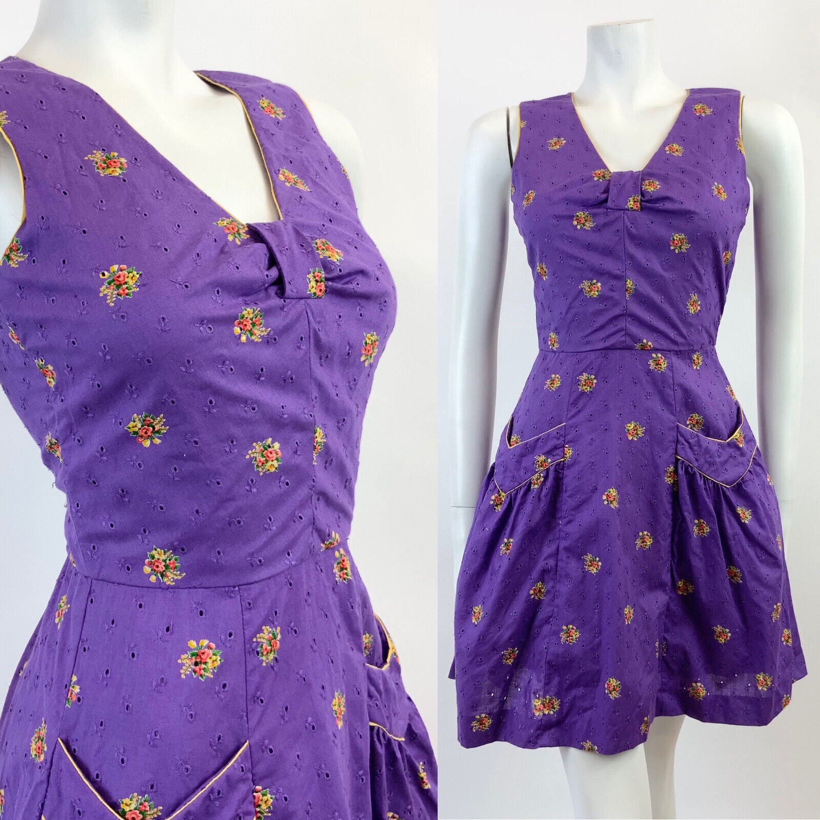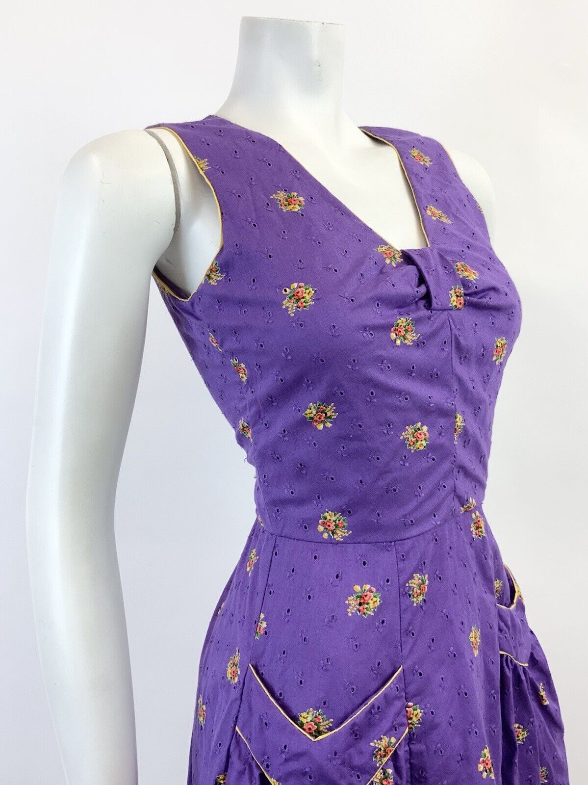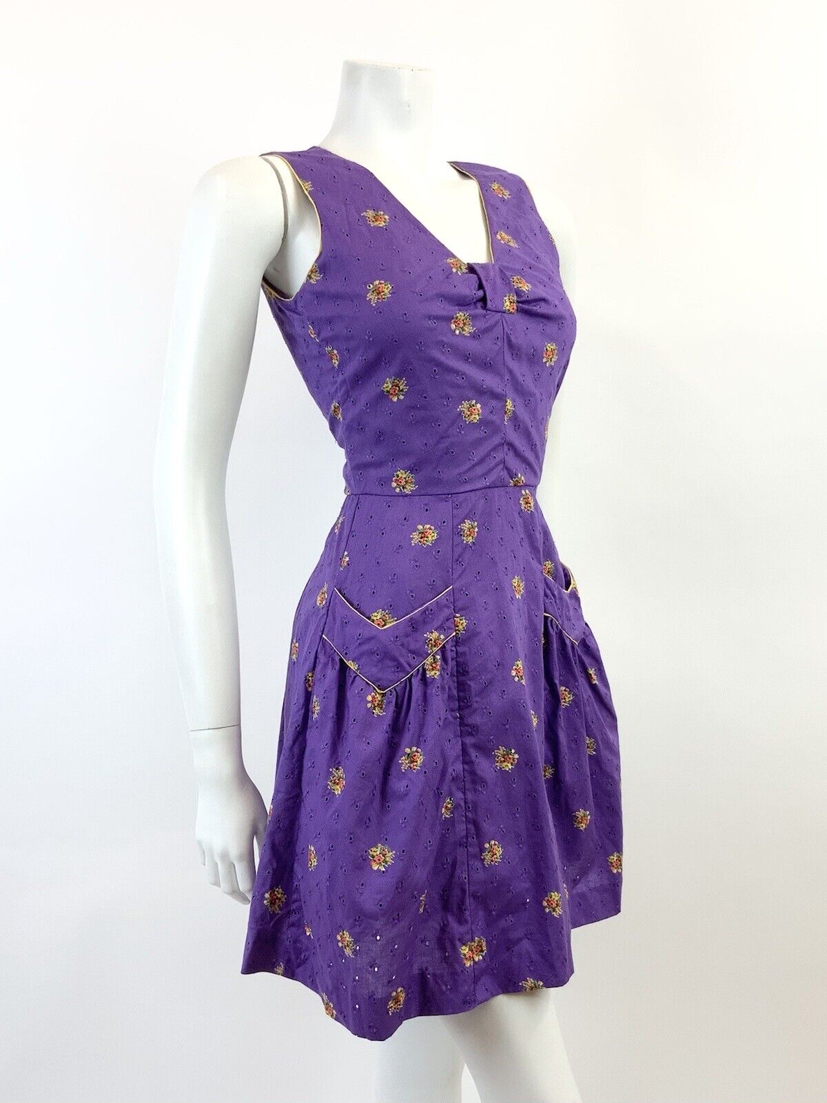 VINTAGE 60s 70s PURPLE YELLOW ANGLAISE EMBROIDERED FLORAL ROSE MOD DRESS 8