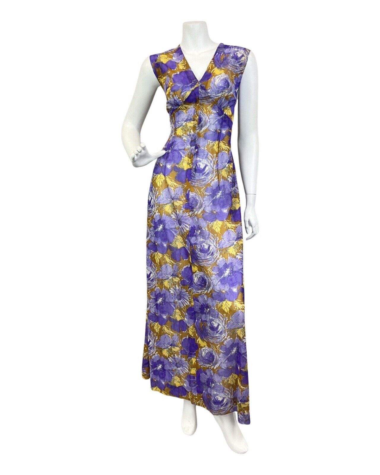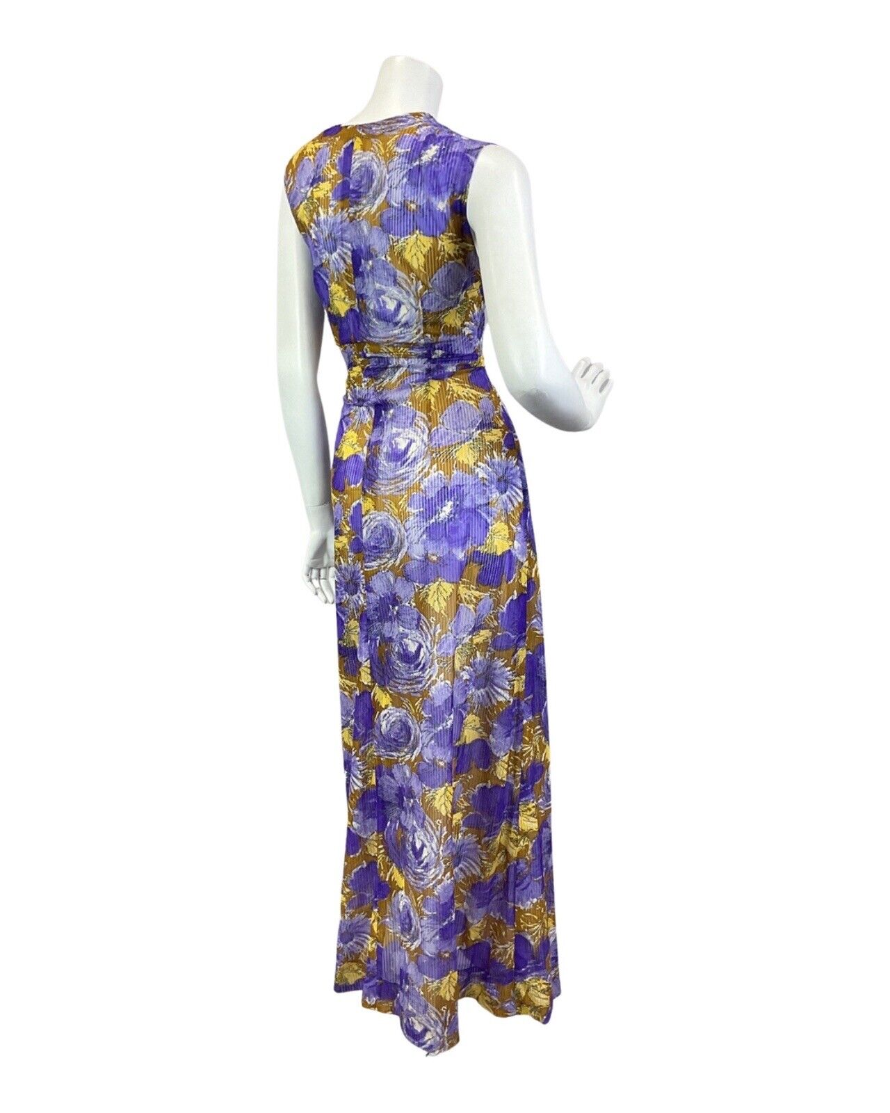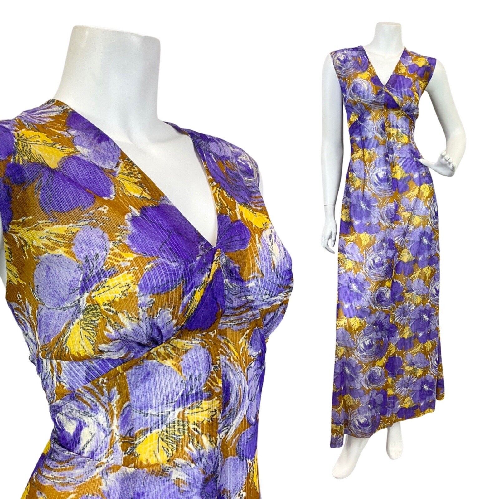 VINTAGE 60s 70s PURPLE YELLOW BROWN PSYCHEDELIC FLORAL SLEEVELESS MAXI DRESS 14